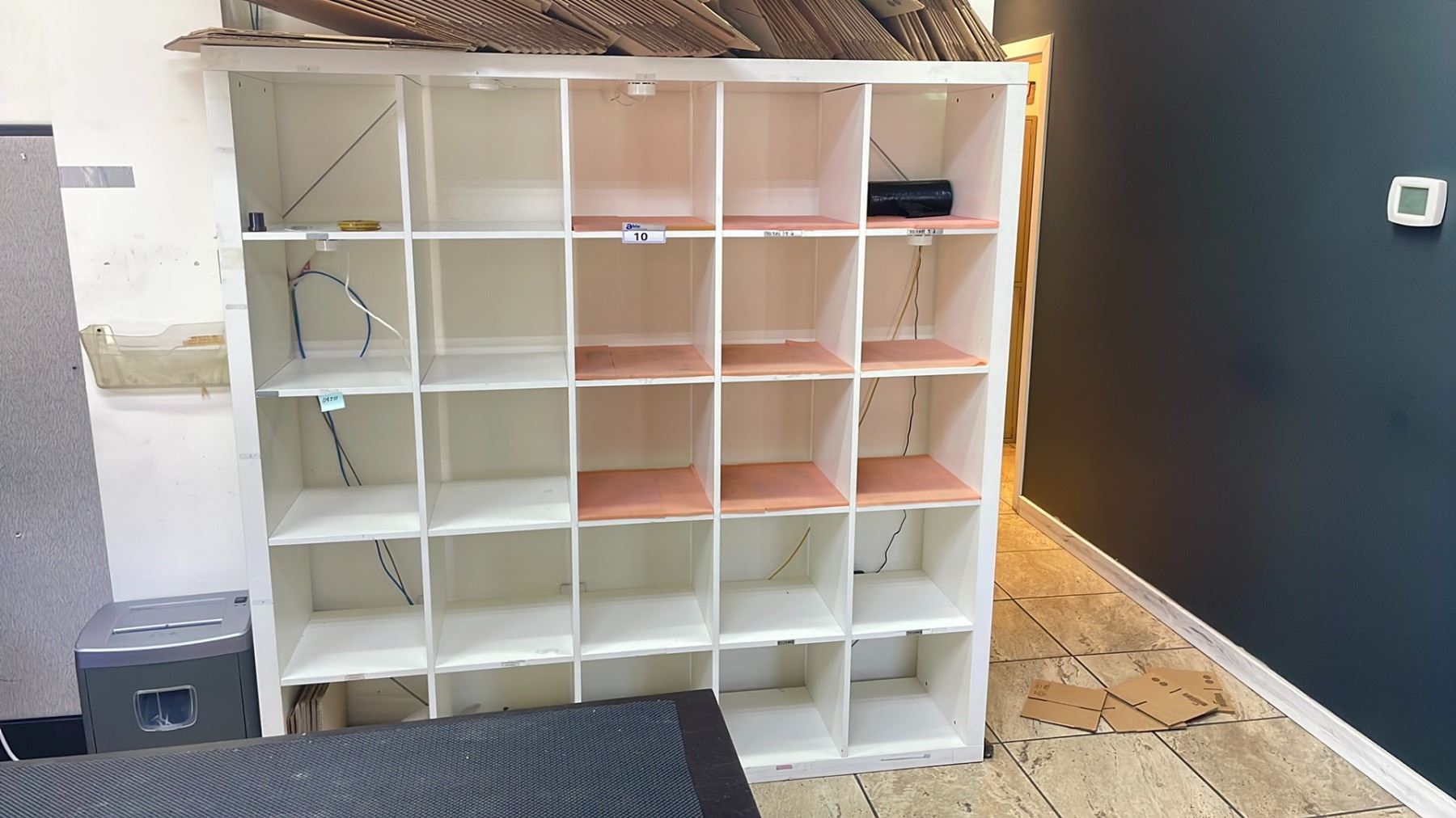 2 WHITE MULTIPLE SECTION SHELVING UNITS