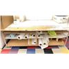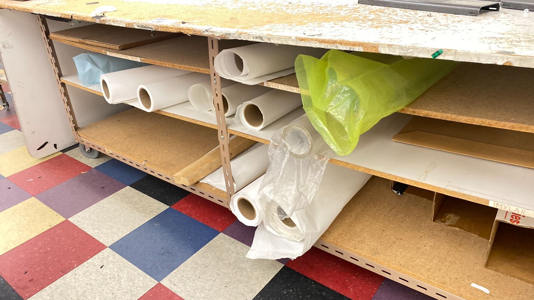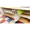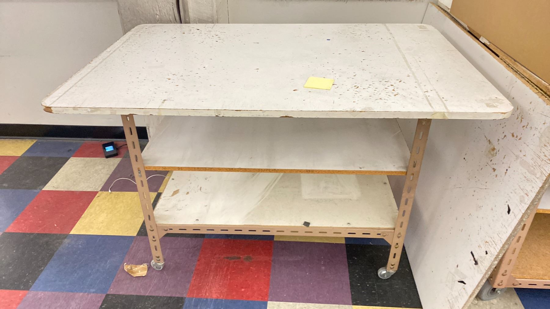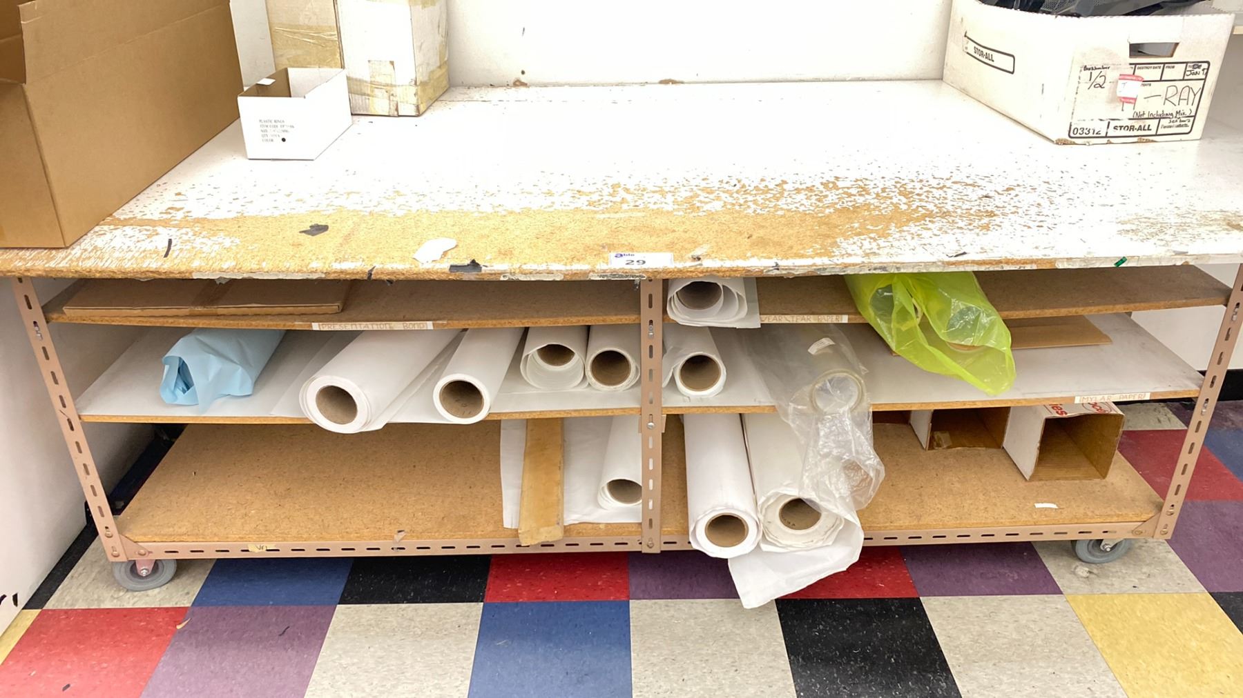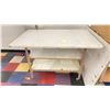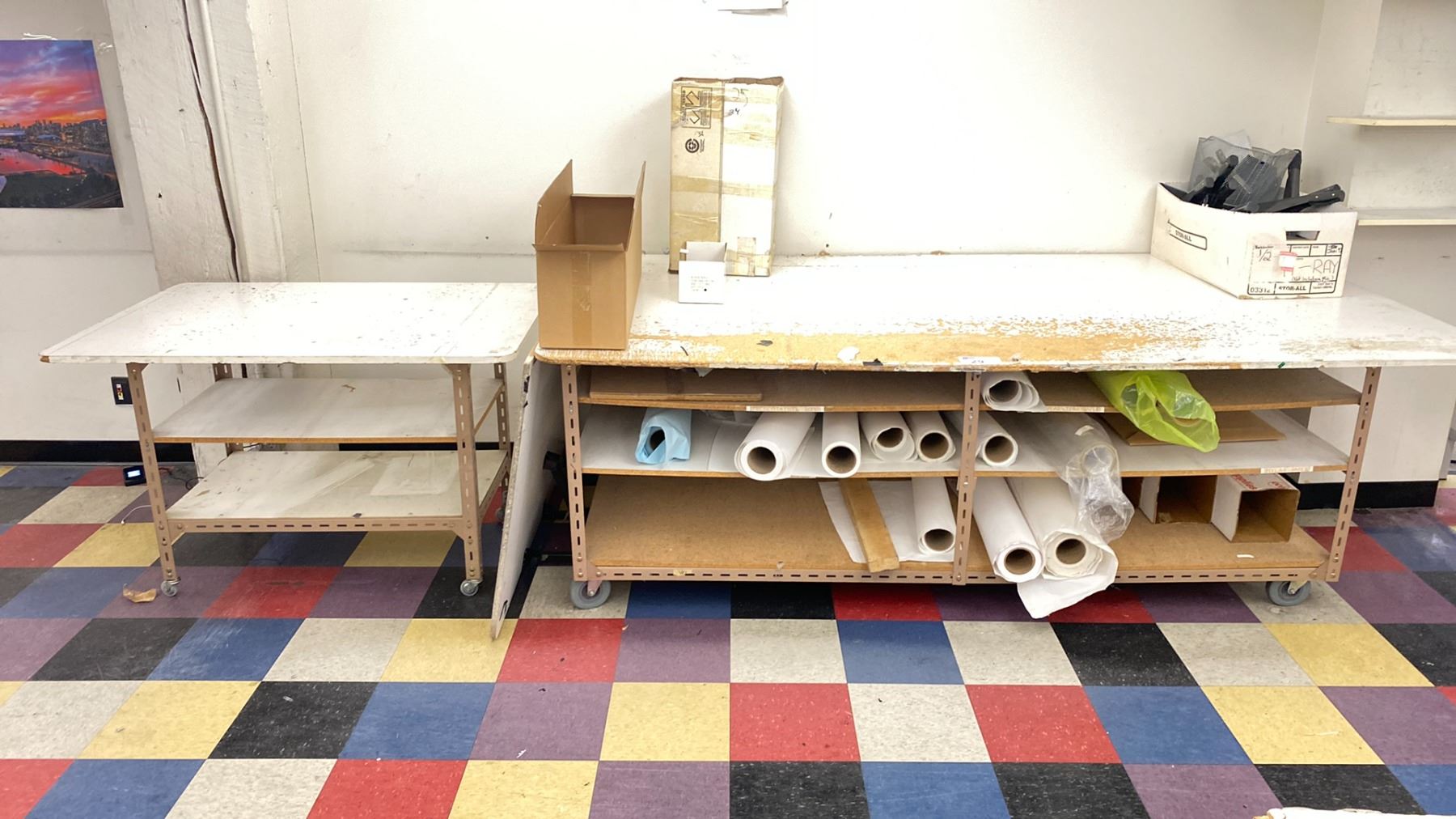 2 WHITE WOODEN / METAL COMMERCIAL MOBILE LAYOUT TABLES WITH ASSORTED PRINT SHOP CONTENTS: TABLE 97"W X 49"D X 33 1/2"H & TABLE 49"W X 32"D X 32"H