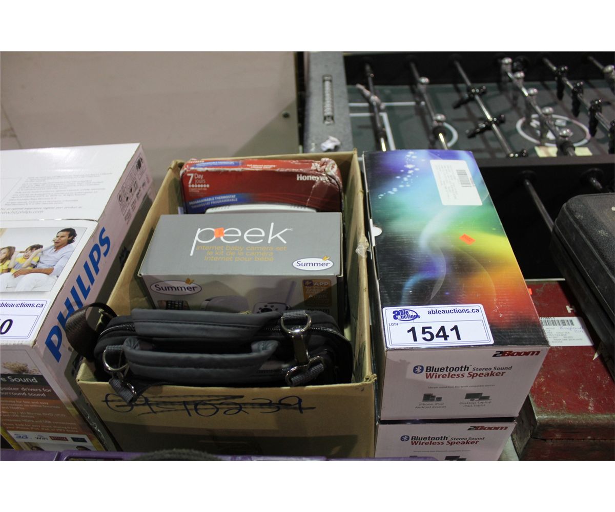 2 WIRELESS BLUETOOTH SPEAKERS AND BOX OF ELECTRONICS