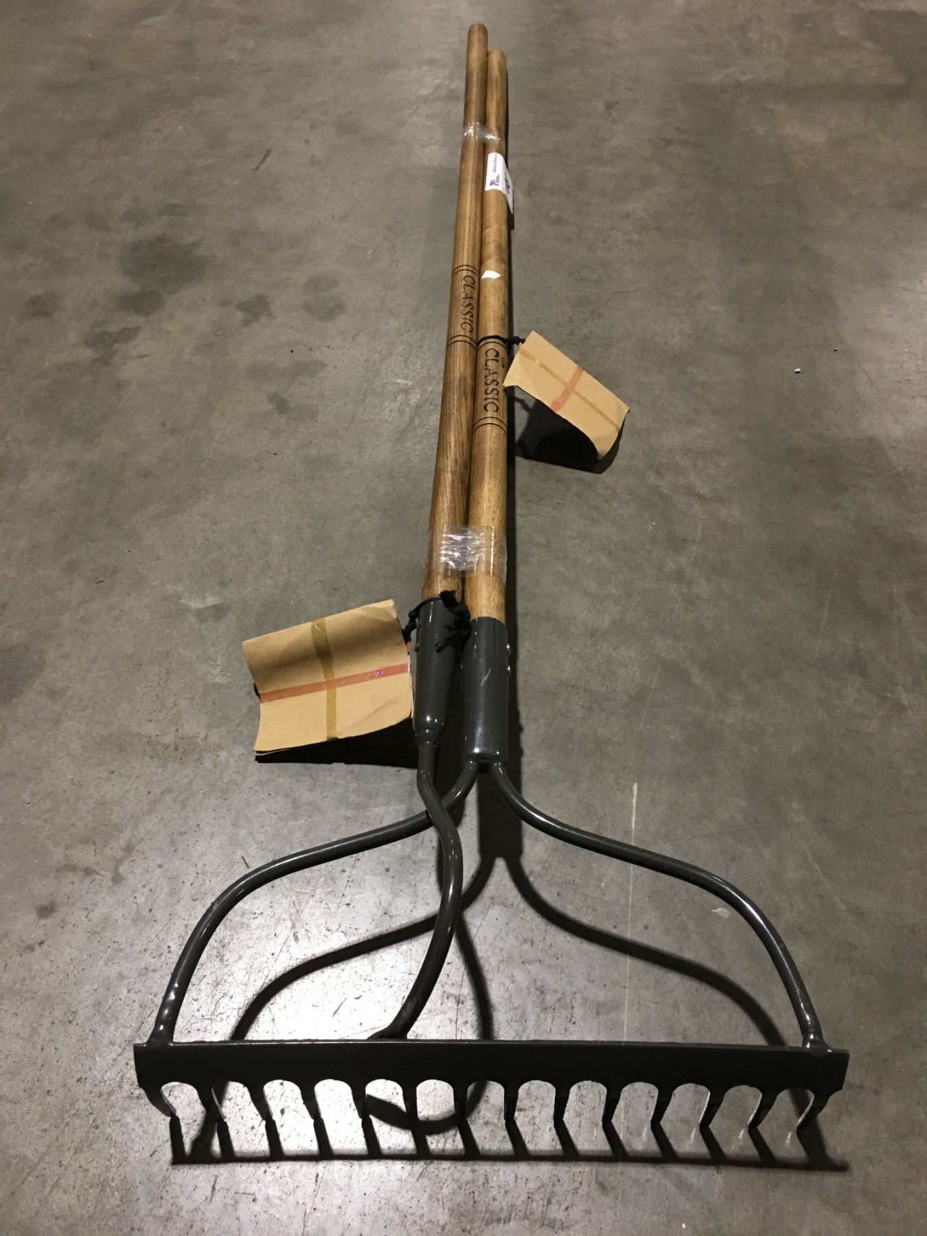 2 WOOD HANDLED GARDEN TOOLS-RAKE & SINGLE SPADE