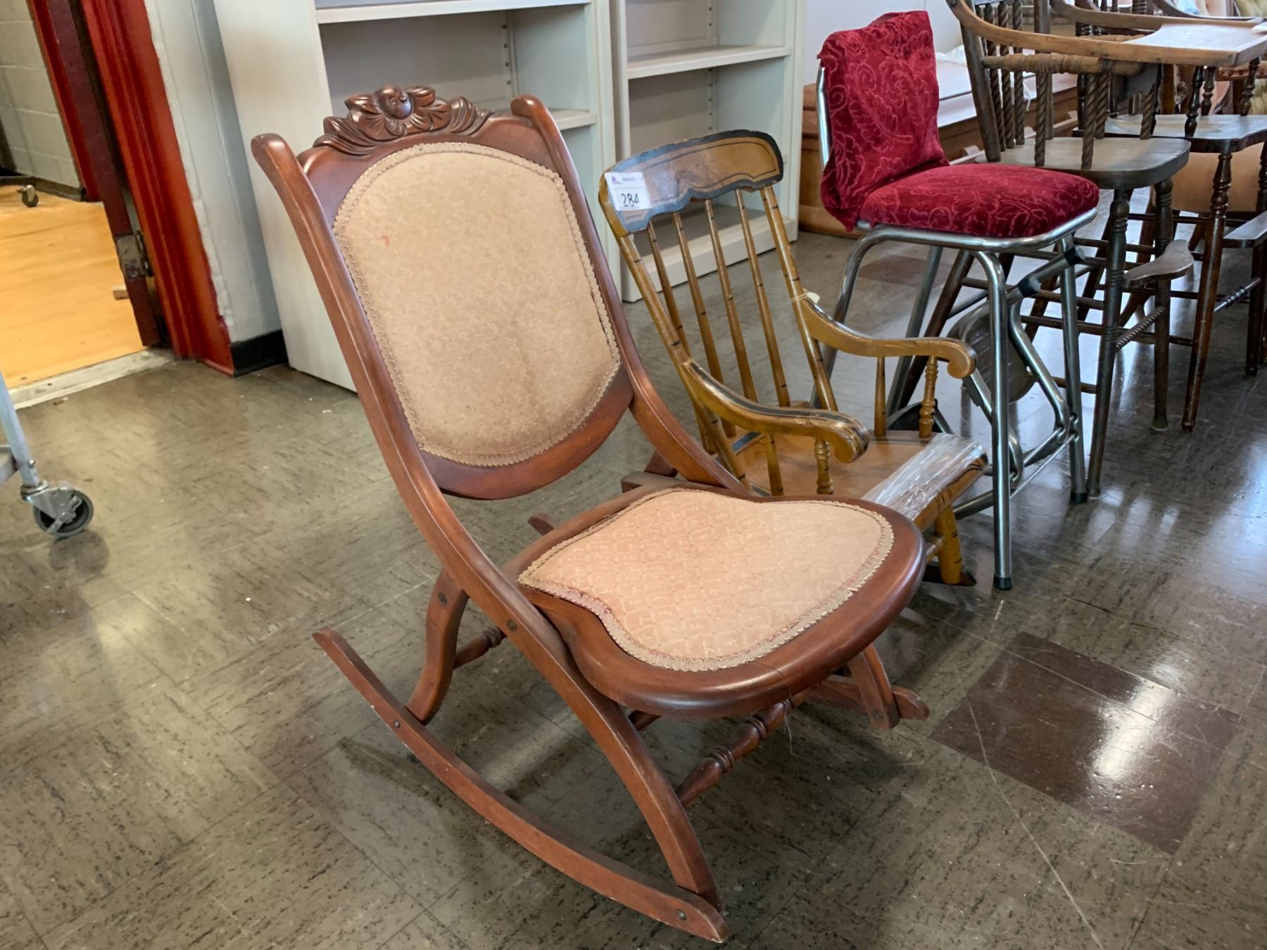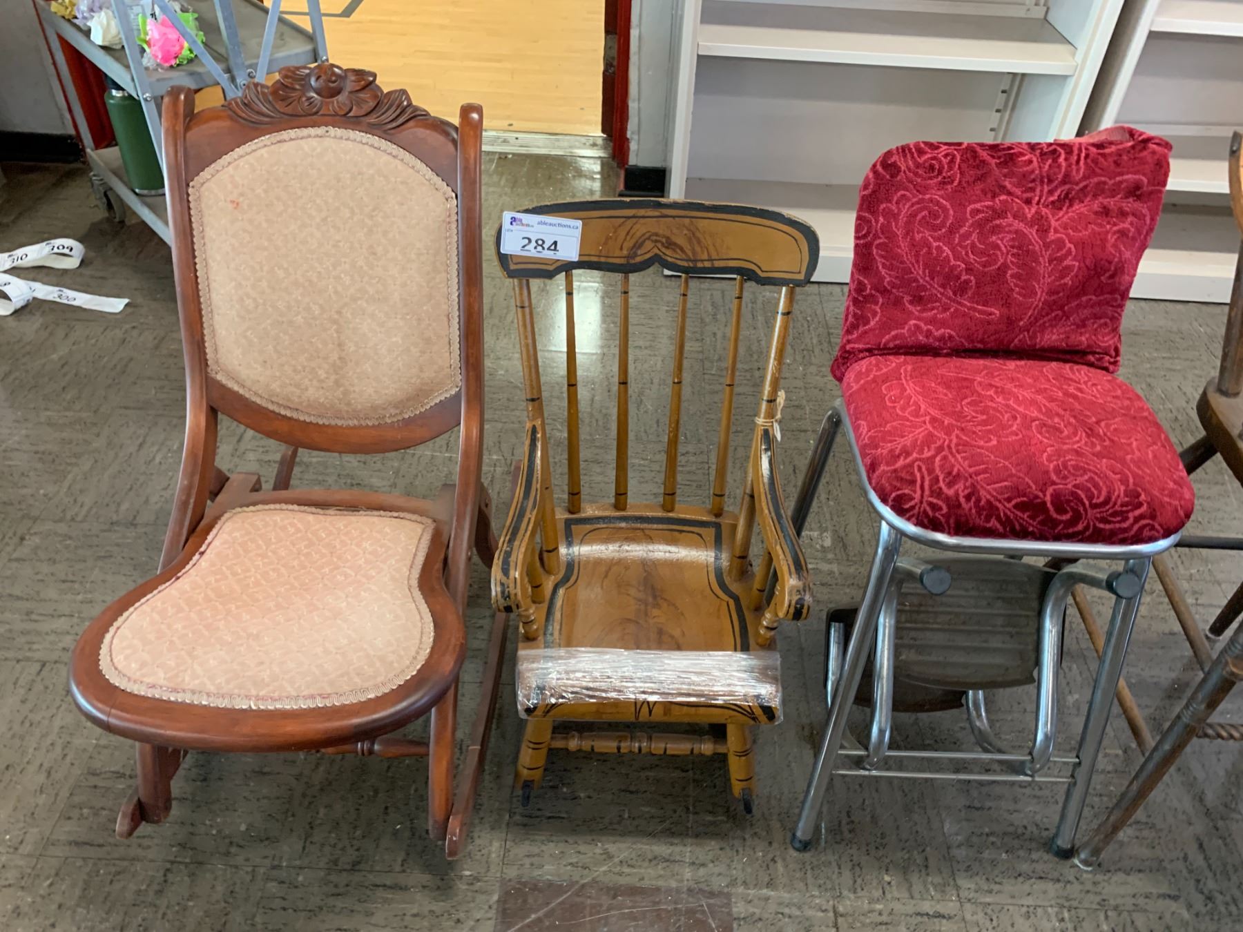 2 WOOD KIDS ROCKING CHAIRS & VINTAGE METAL STOOL WITH FOOTREST