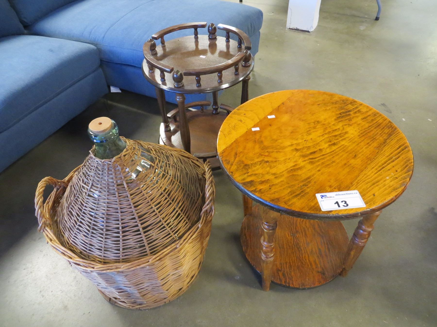 2 WOOD SIDE TABLES & WINE MAKING BOTTLE