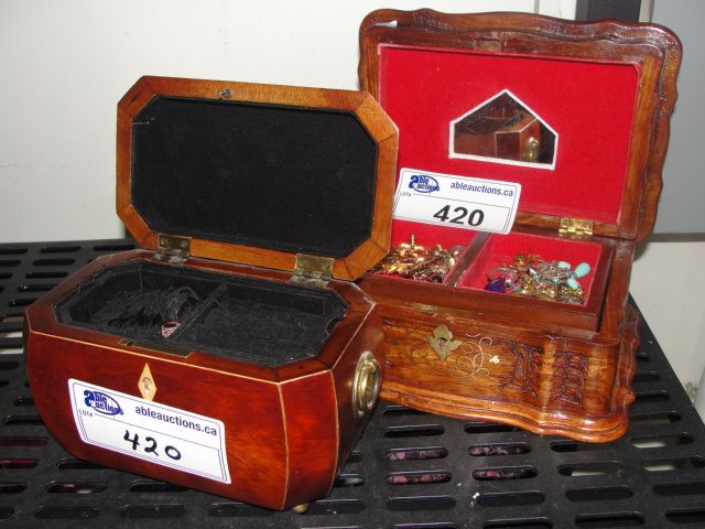2 WOODEN JEWELLERY BOXES AND CONTENTS