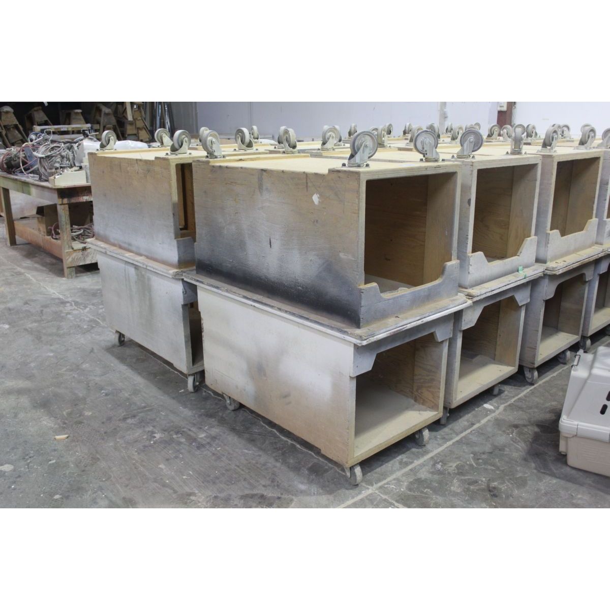 2 WOODEN MOBILE WORK BENCHS