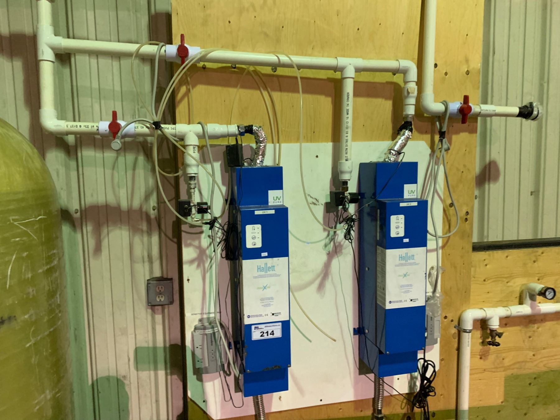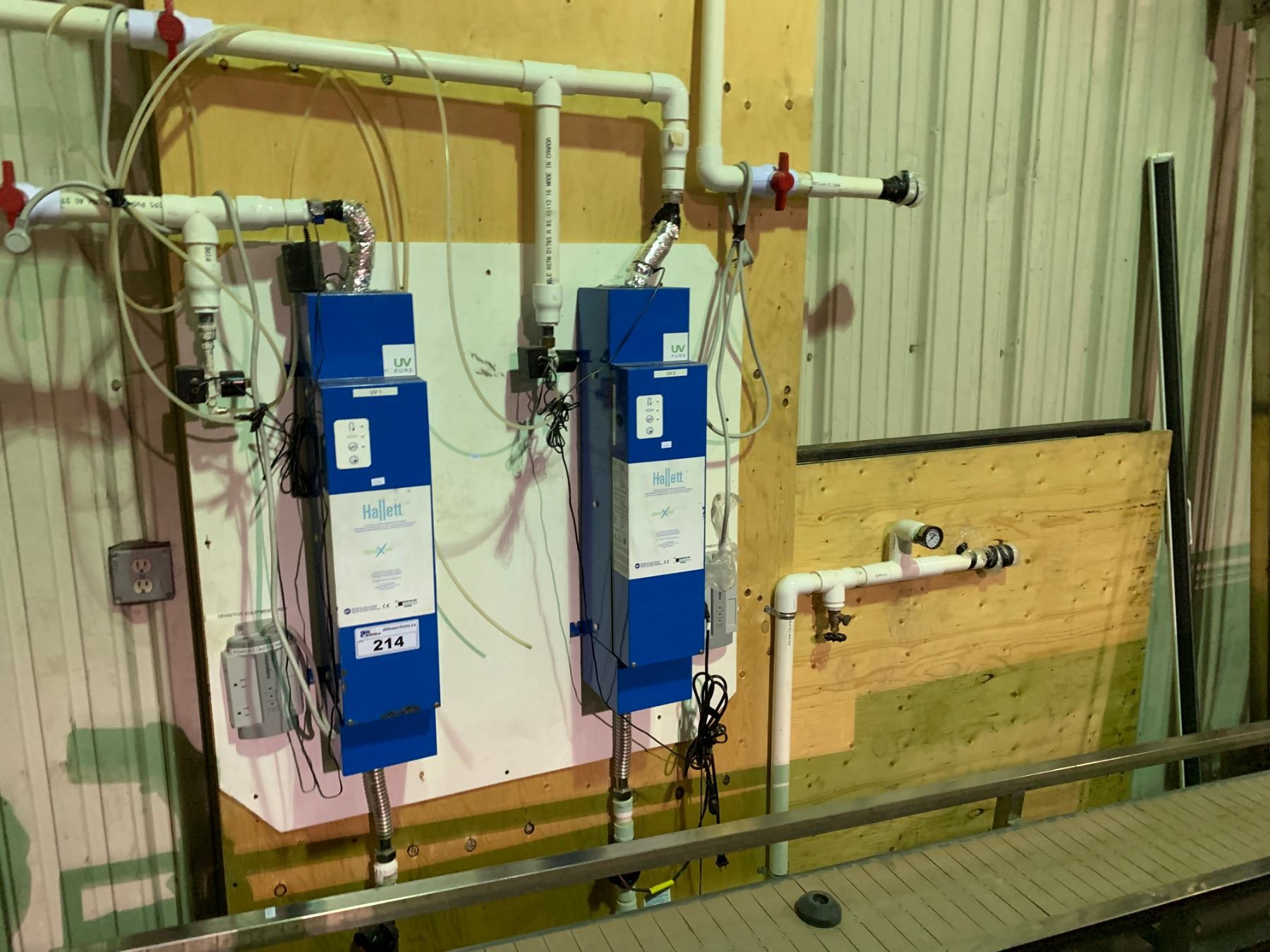 2 X HALLETT CROSSFIRE UV PURIFICATION SYSTEM ON WALL WITH POWER & REGULATED PLASTIC PLUMBING