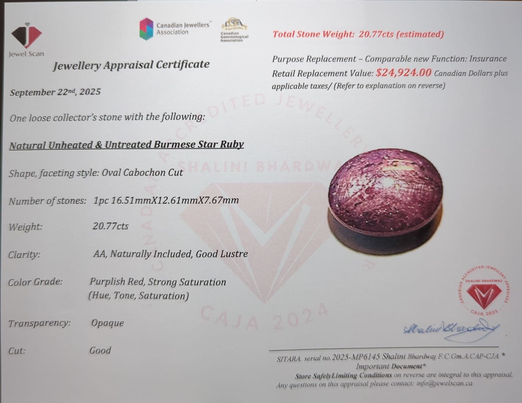20.77 CT CERTIFIED STAR RUBY GEMSTONE ($24,924 APPRAISAL, APPRAISAL NOT GUARANTEED)