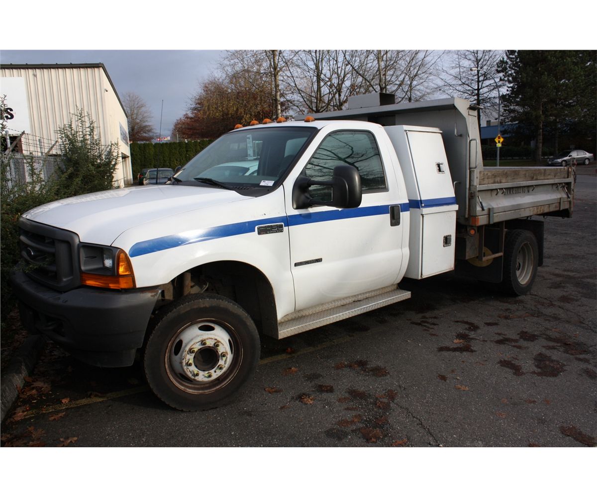 2001FORD F450 XL SUPER DUTY DUMP TRUCK, WHITE, VIN # 1FDXF46F61EA11973 128331KMS, V8 DIESEL, AUTOMATIC RD,TH DEC $7558.65 AIRCARE EXPEMPT
