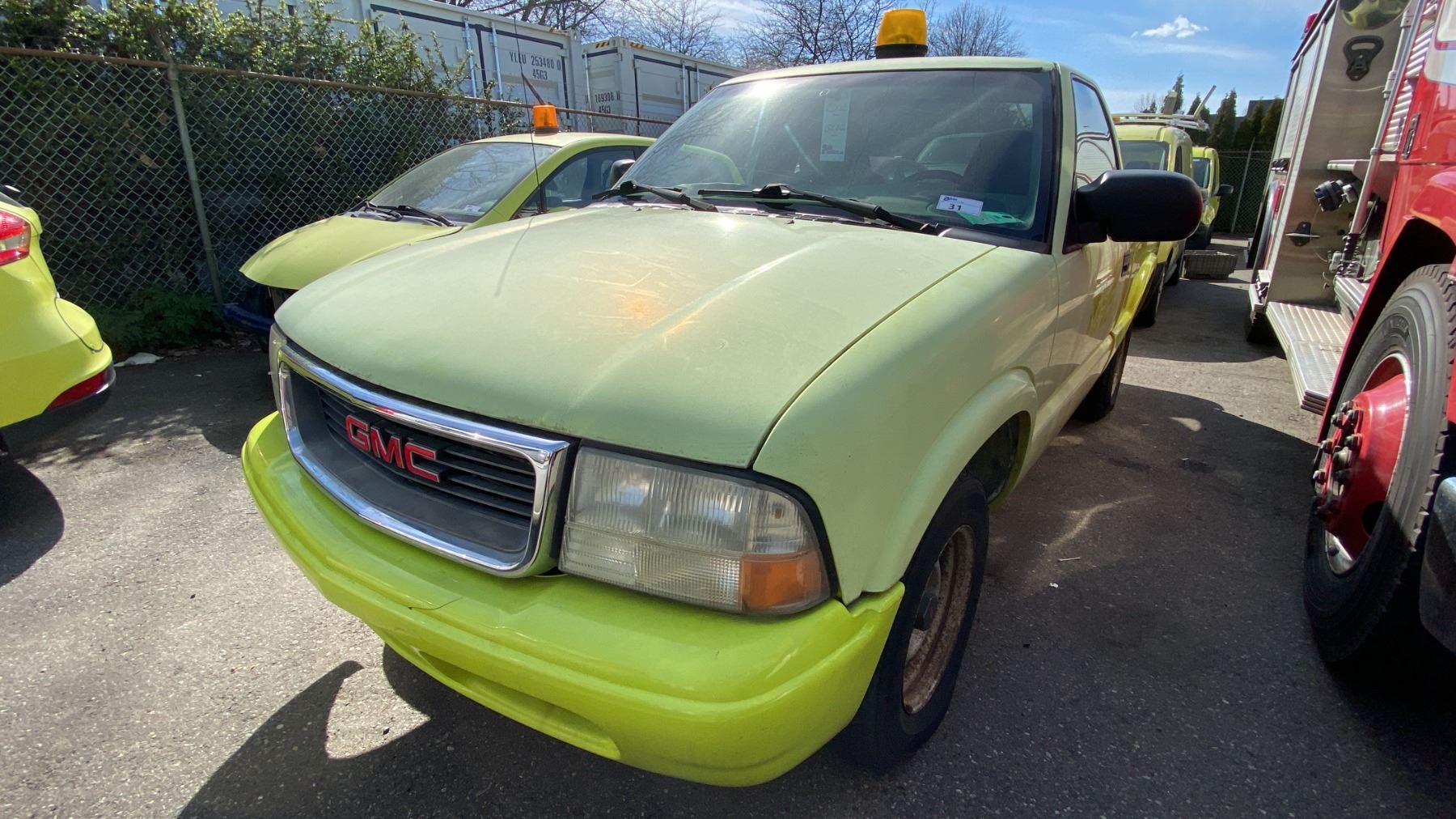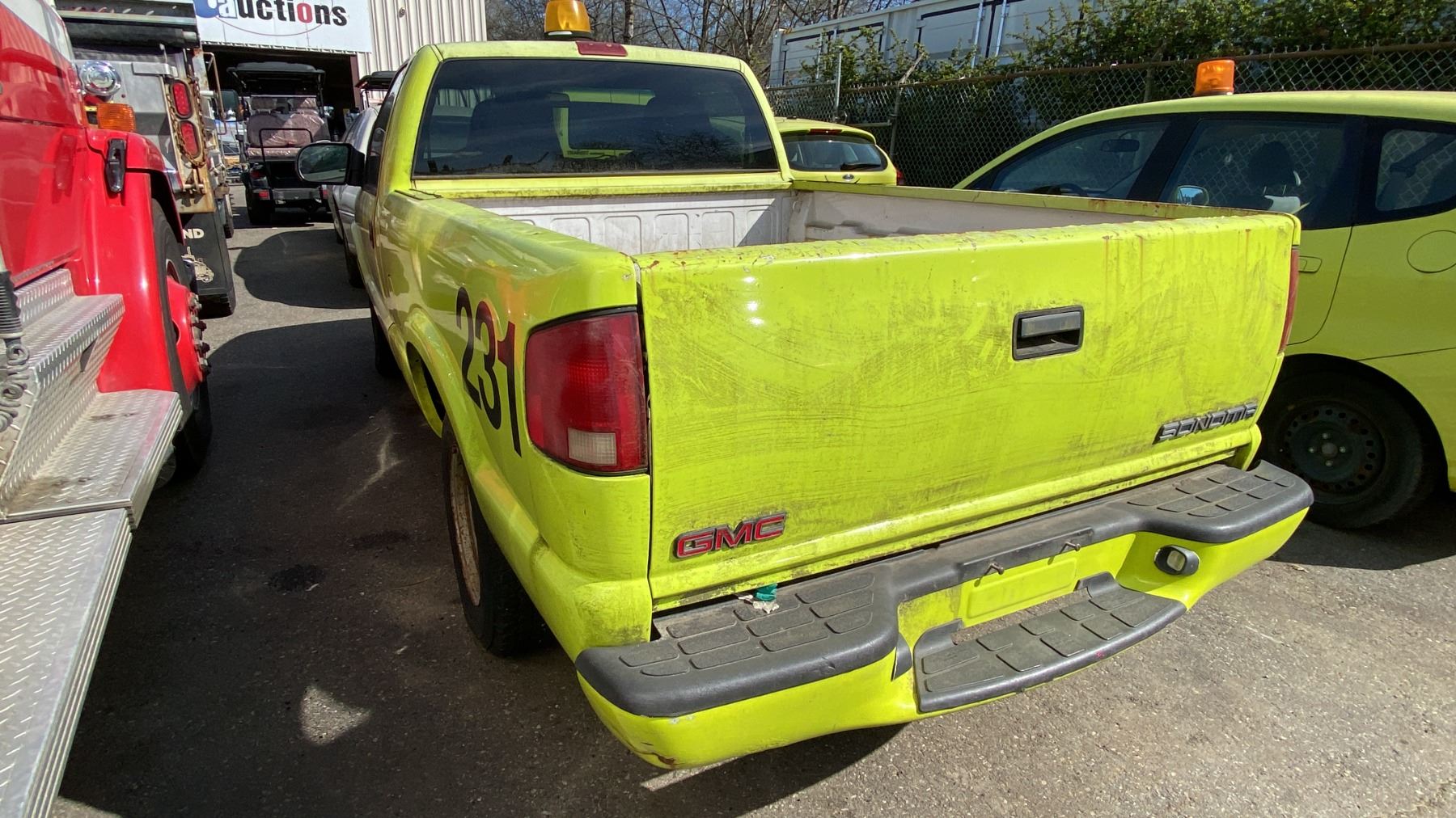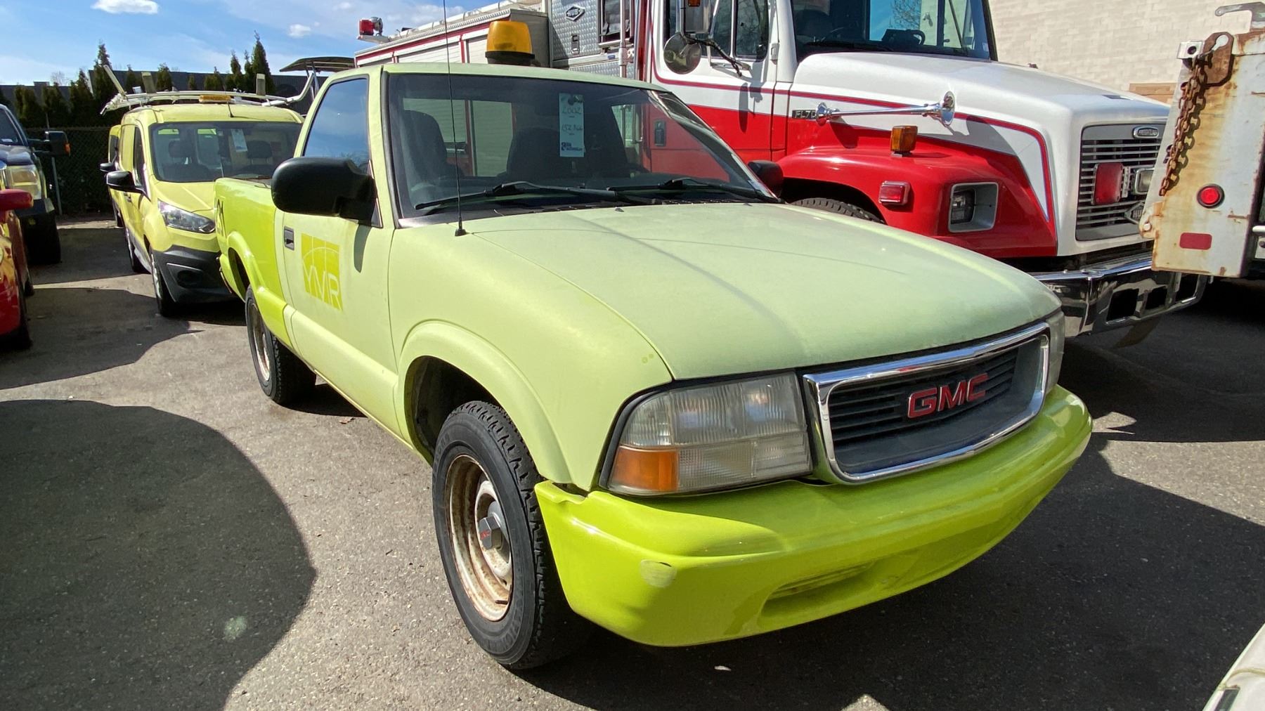 2002 GMC SONOMA, 2DR PICKUP, YELLOW, VIN 1GTCS145X28128690, 152,866 KMS, GAS (G), 2.2L, AUTOMATIC, HAS REGISTRATION, HAS KEYS, NEEDS JUMP, FEATURES: RADIO, NO ICBC DECLARATIONS, SERVICE LIGHT, WINDOW HANDLE BROKEN DRIVER SIDE, SEAT RECLINE HANDLE BROKEN PASSENGER SIDE, MINOR SCRATCHES AND DENTS