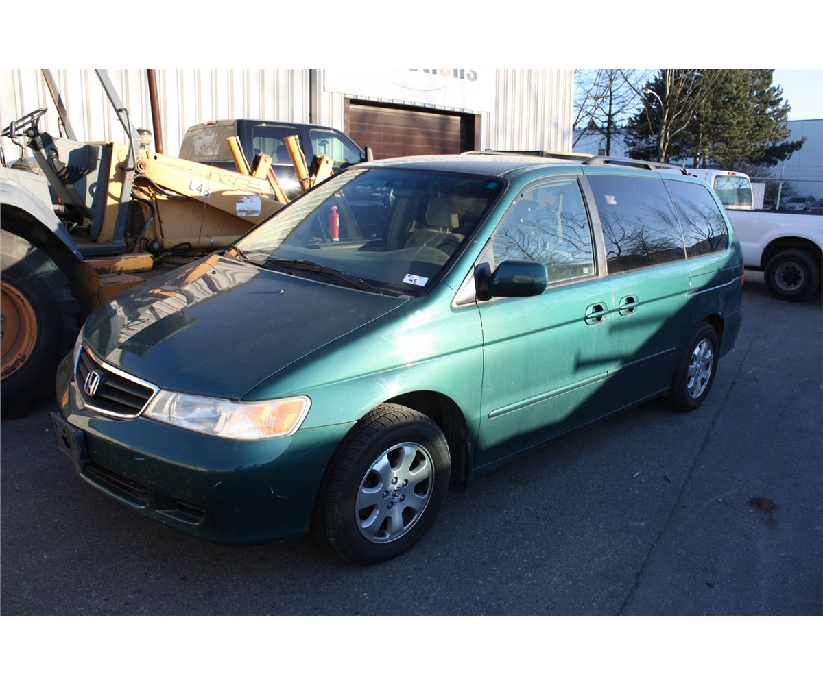 2002 HONDA ODYSSEY, 4DR VAN, GREEN, VIN# 2HKRL186X2H002356 210,998 KMS, GASOLINE AUTOMATIC RD,CD,PW,TH,PL,TW,AC AIRCARE REQUIRED DECS TOTALING $7,301.68