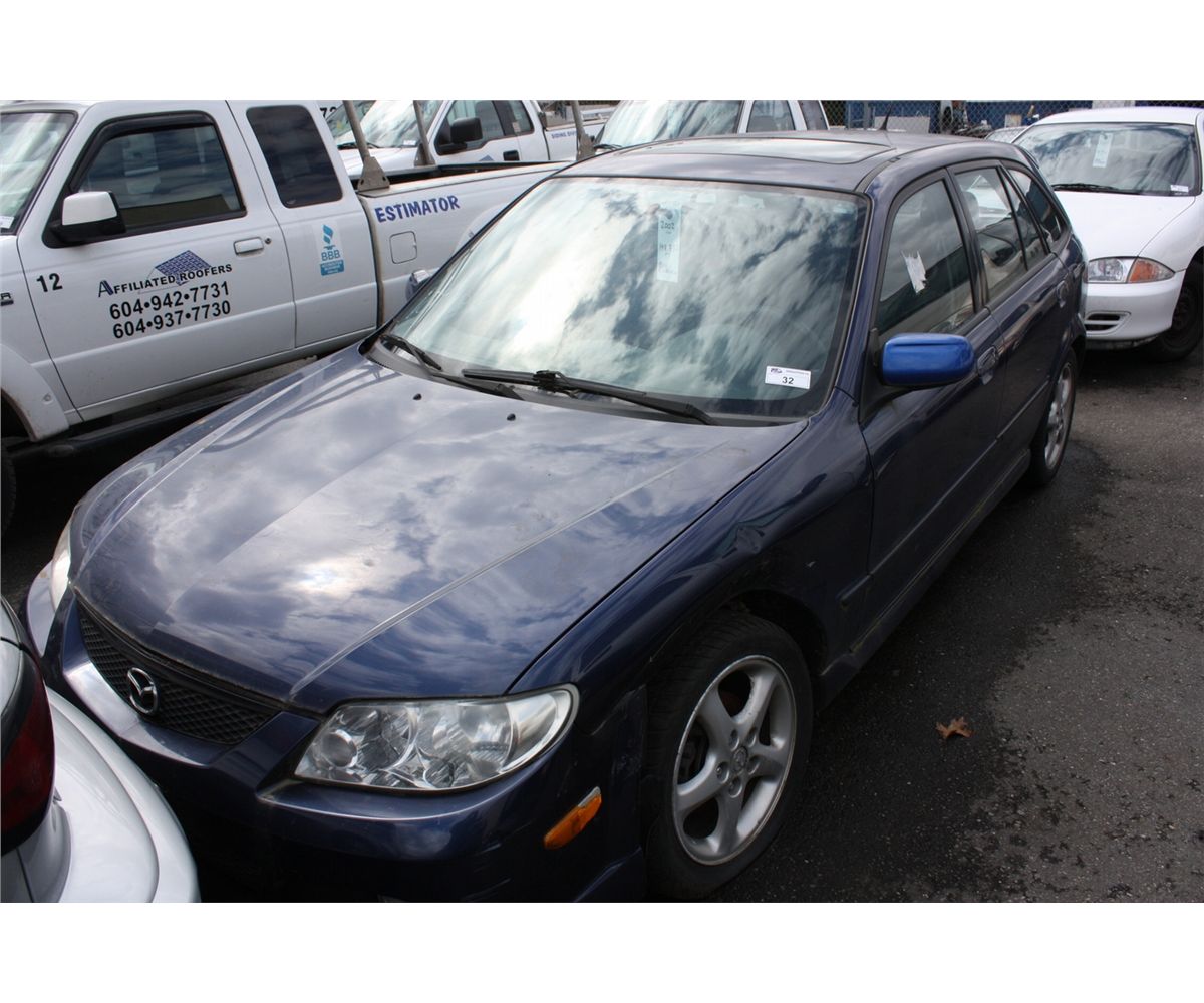 2002 MAZDA PROTEGE 5, HATCHBACK, BLUE, VIN # JM1BJ245321571924 148,732KMS, GASOLINE 2.0L, AUTOMATIC, ANTI THEFT ON RD,CD,PW,CC,PL,TW,SR, FLAT TIRE AIRCARE REQUIRED, DEAD BATT ICBC NO DETAILS, DEC $527.37