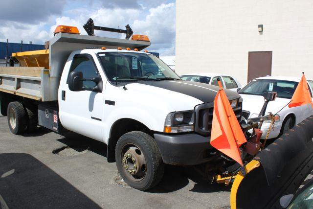 2002 WHITE FORD F-550 XL SUPERDUTY 2DR DUMP TRUCK 100 - 804KM DIESEL AUTOMATIC TRANS VIN: 1GDAF56F92EA54409 15% GOVT *WESTERN SNOW PLOW - STAR WARNING SYSTEM - SPREADER / AUGER - DRIVER DOOR WONT SHUT PROPERLY* TW AC AIRCARE: REQ