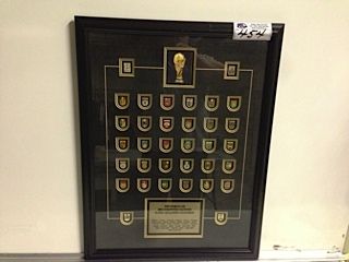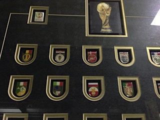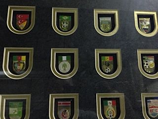 2002 WORLD CUP QUALIFING COUNTRIES COLLECTION OF TEAM PINS BEAUTIFULLY FRAMED AND MATTED ,  PLUS EURO FOOTBALL 1976-77 PANINI OFFICIAL EUROPEAN CHAMPIONS CUP COLLECTABLE STICKER BOOK C/W ALL STICKERS