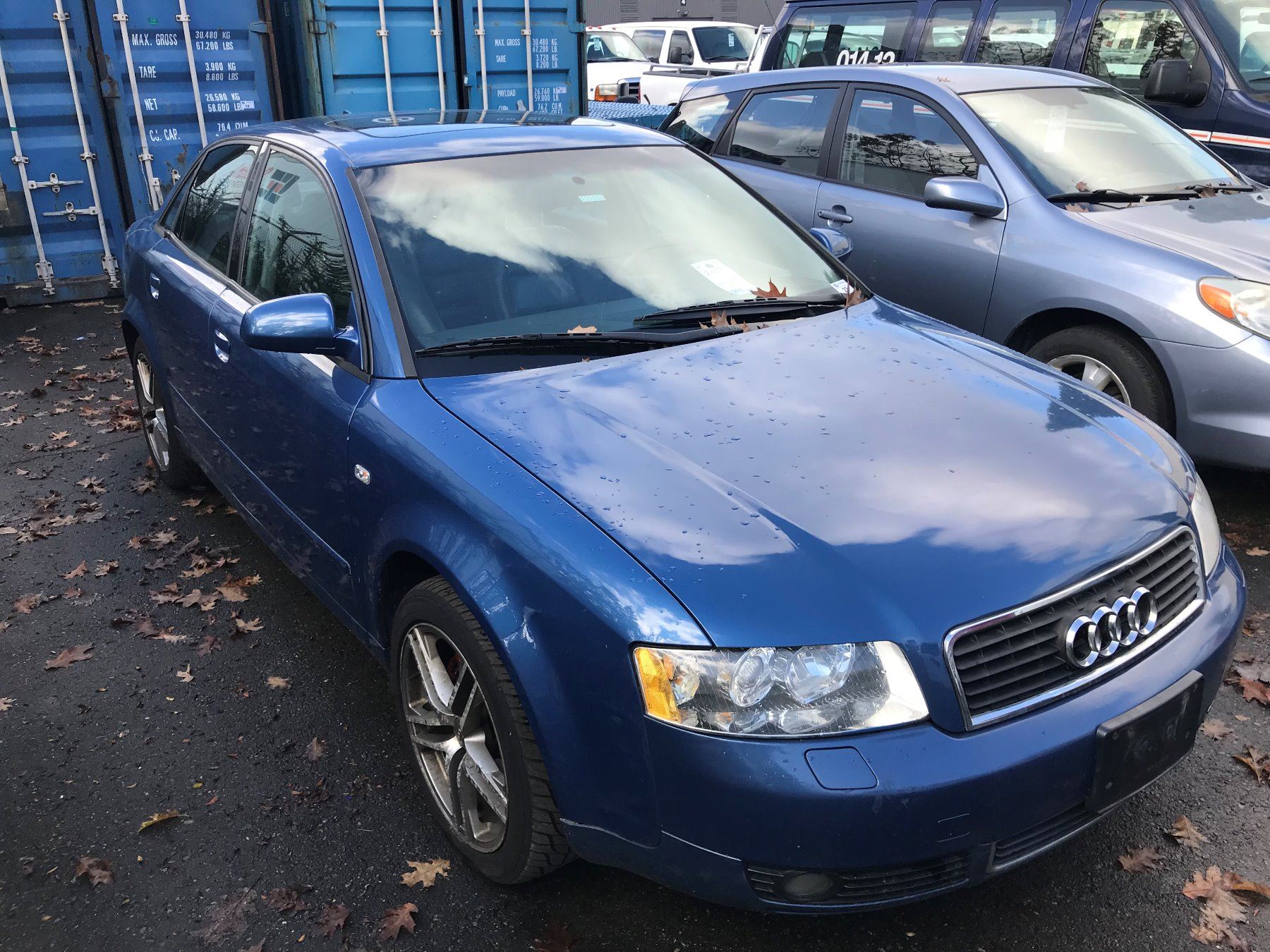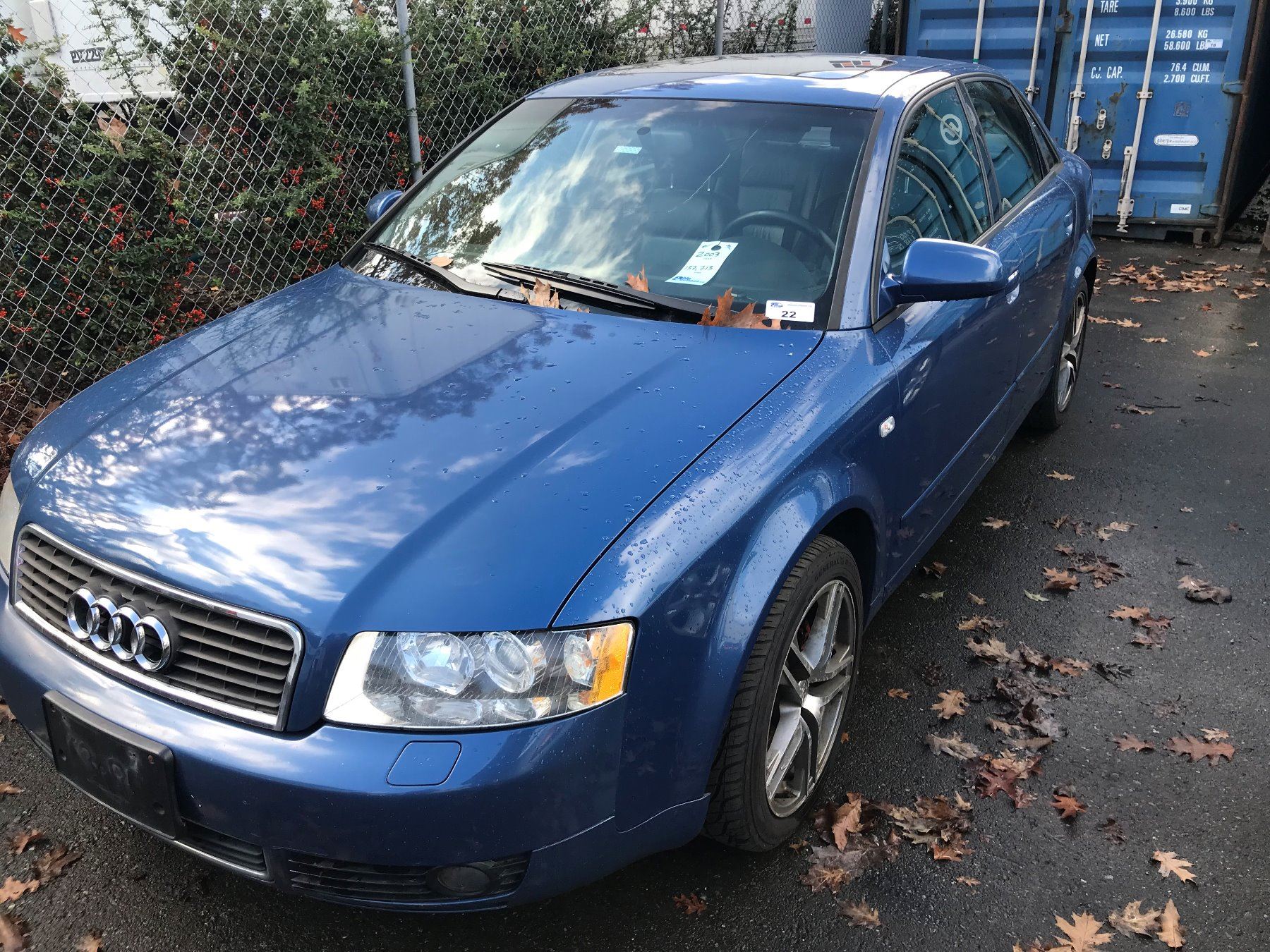 2003 AUDI A4 R, 4DR SEDAN, BLUE, VIN # WAUJC68E43A336275 137,713KMS, GAS, AUTOMATIC, RD,CD,PW,AW,PL,TW,AC,LT,SR,HS ENGINE LIGHT ON, CRACKED WINDSHIELD REBUILT, 2X ICBC NO DETAILS, ICBC REPAIRED DECLARATIONS TOTALING $9,685.86