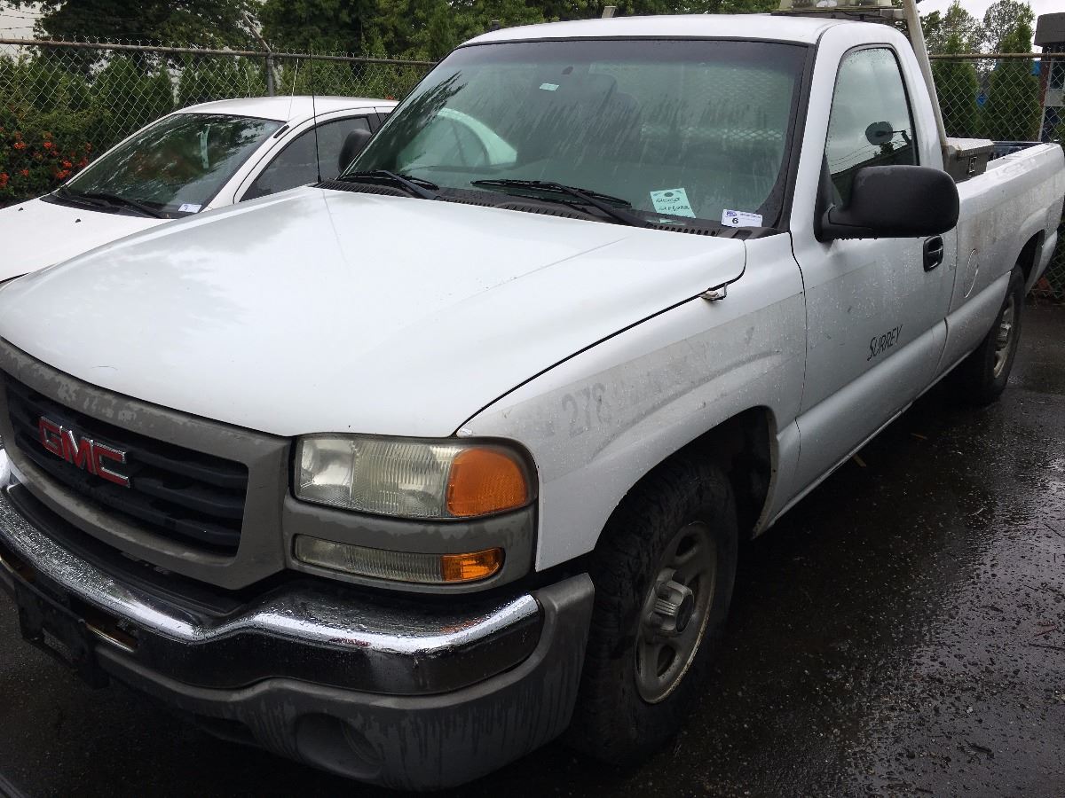 2003 GMC SIERRA, 2 DOOR PU, WHITE, VIN # 1GTEC14X43Z104842 214,288KMS, GAS, AUTOMATIC RD,TW, DENTS, CRACKED WINDSHIELD NO ICBC DECLARATIONS