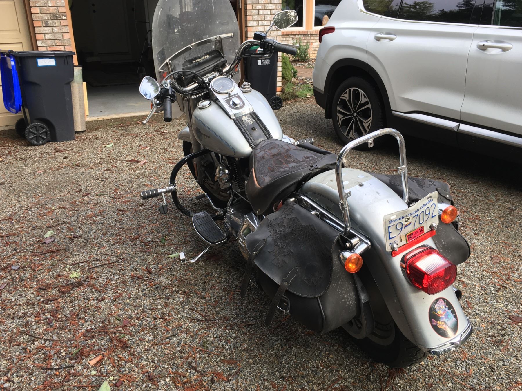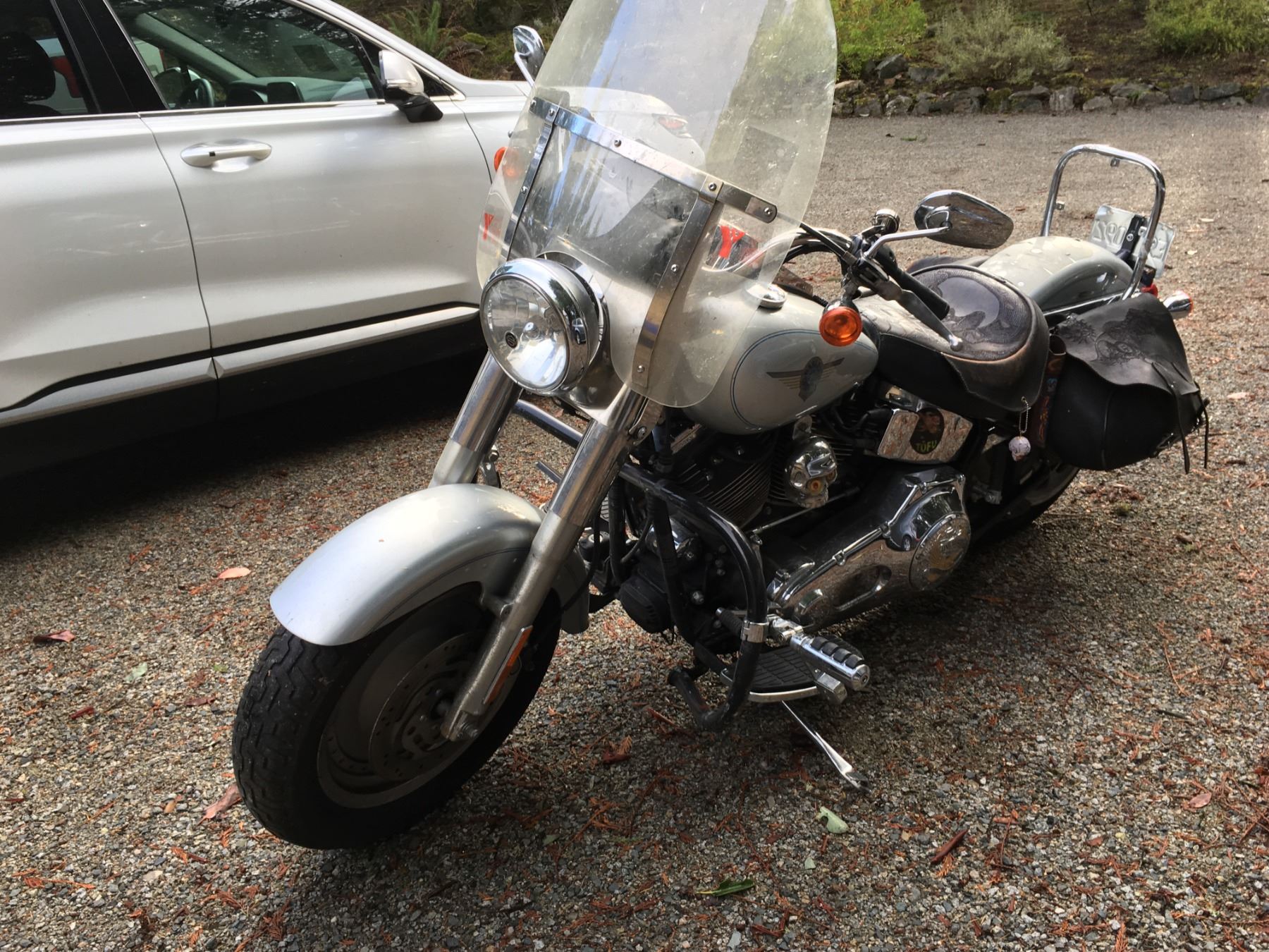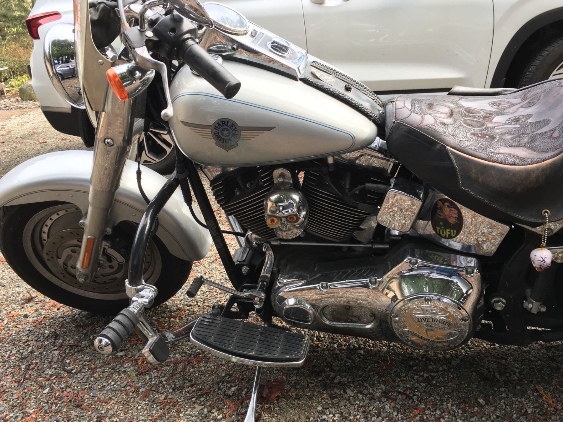 2004 HARLEY DAVIDSON FAT BOY CRUISER SOFT TAIL - GREY - VIN # 5HD1BXB104Y017876, 60,633KM - CUSTOM LEATHER SEAT, LEATHER SADDLE BAGS & REAR BAG, NO DECS/NO LIENS - NOTE: HAS NOT BEEN STARTED SINCE 2012