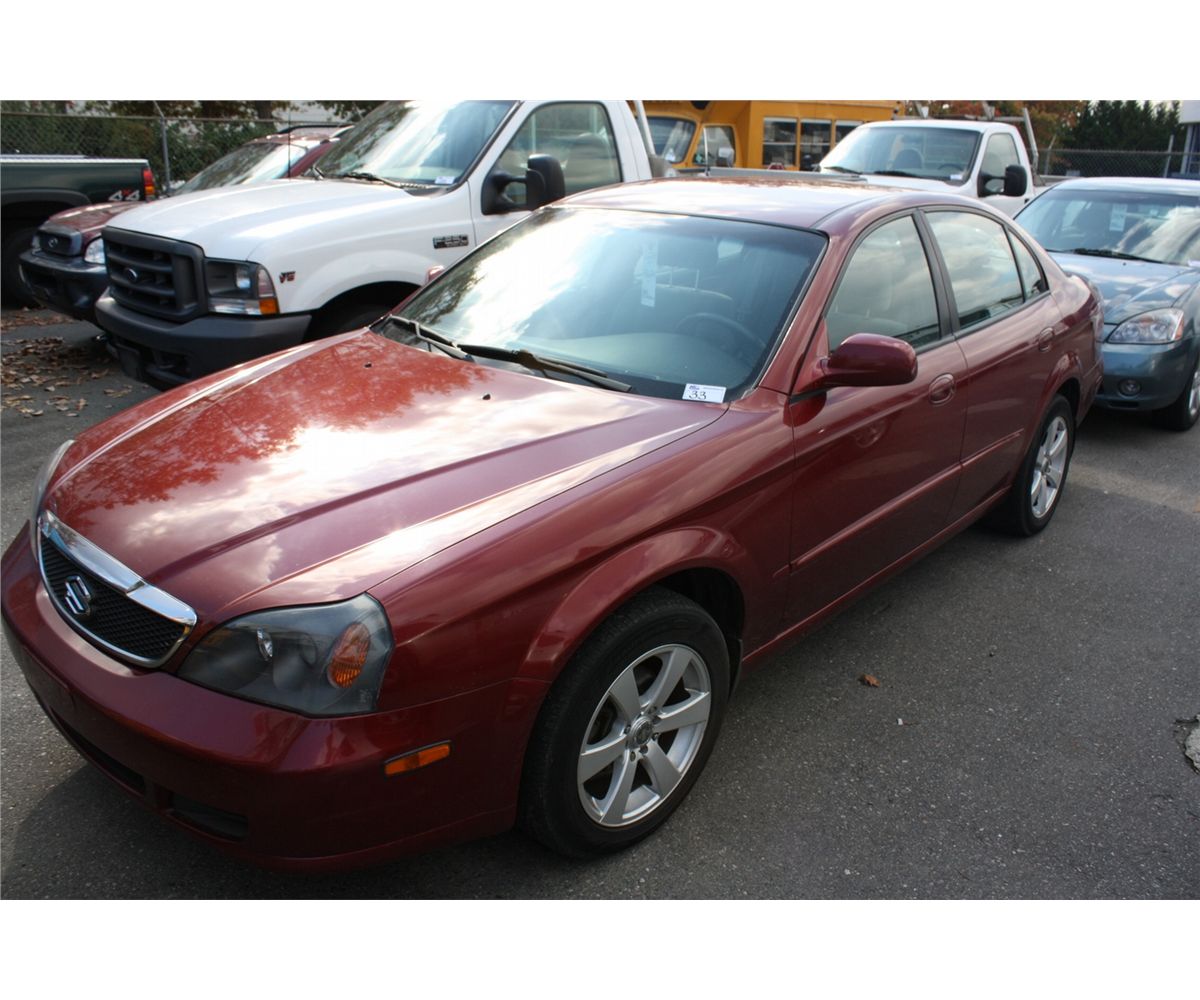 2004 SUZUKI VERONA, BURGANDY, VIN KL5VD52L04B107760 153,634KM'S, GASOLINE, AUTOMATIC RD,CD,PW,CC,PL,TW.AC.CR AIRCARE EXPIRES OCT2015 RIGHT FRONT SIDE REPAIRS $1080.25, LEFT REAR CORNER 757.44