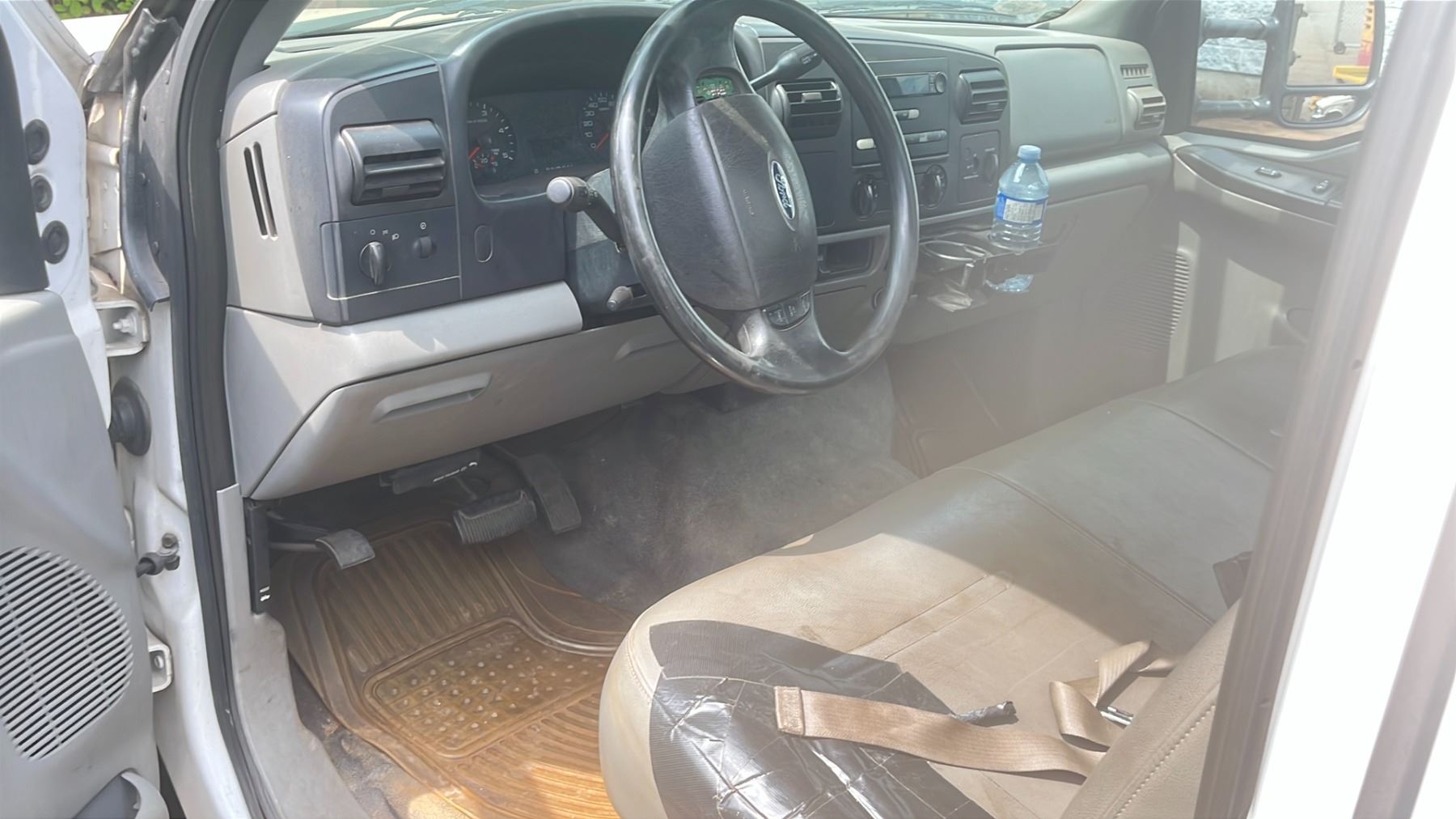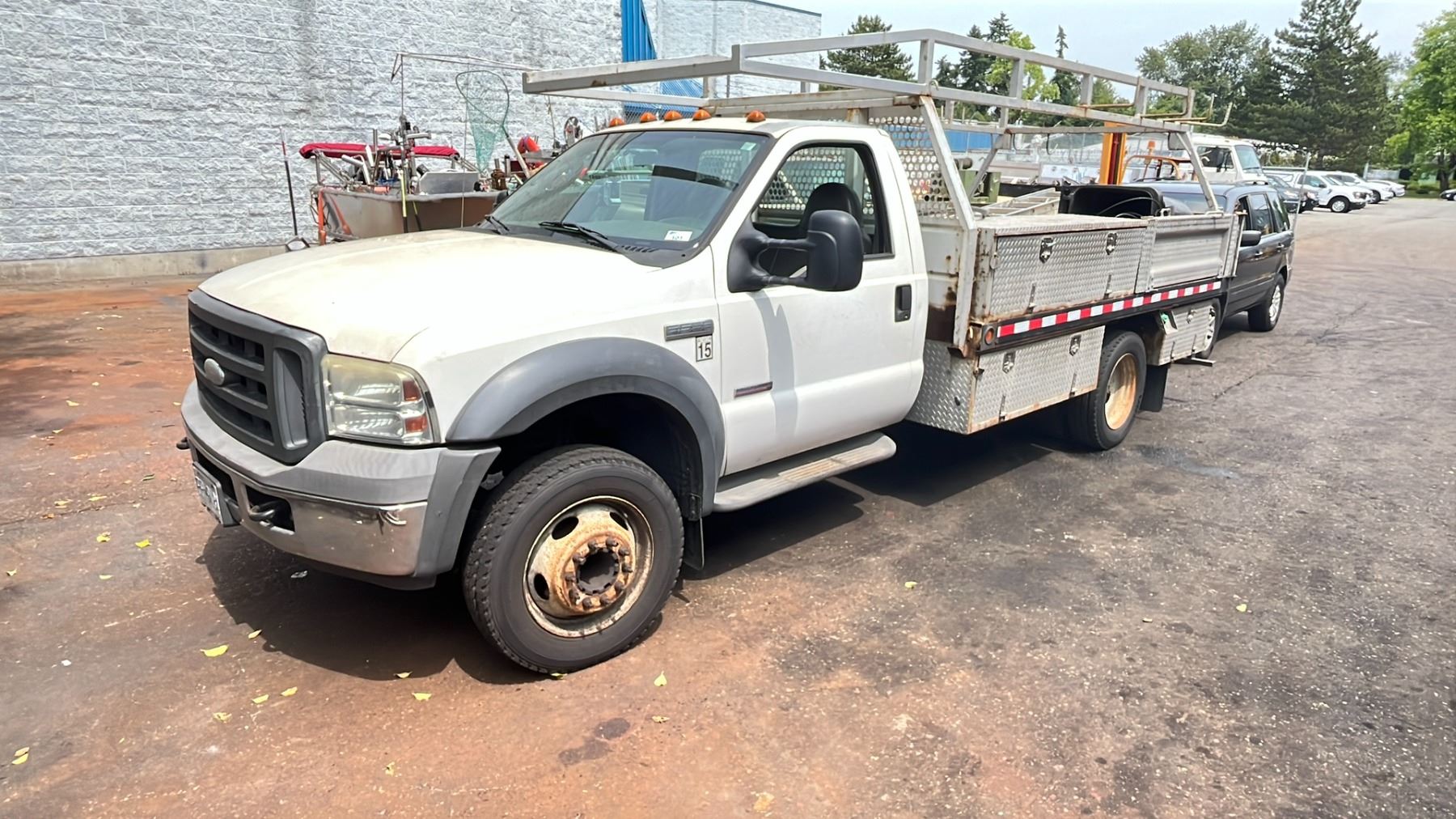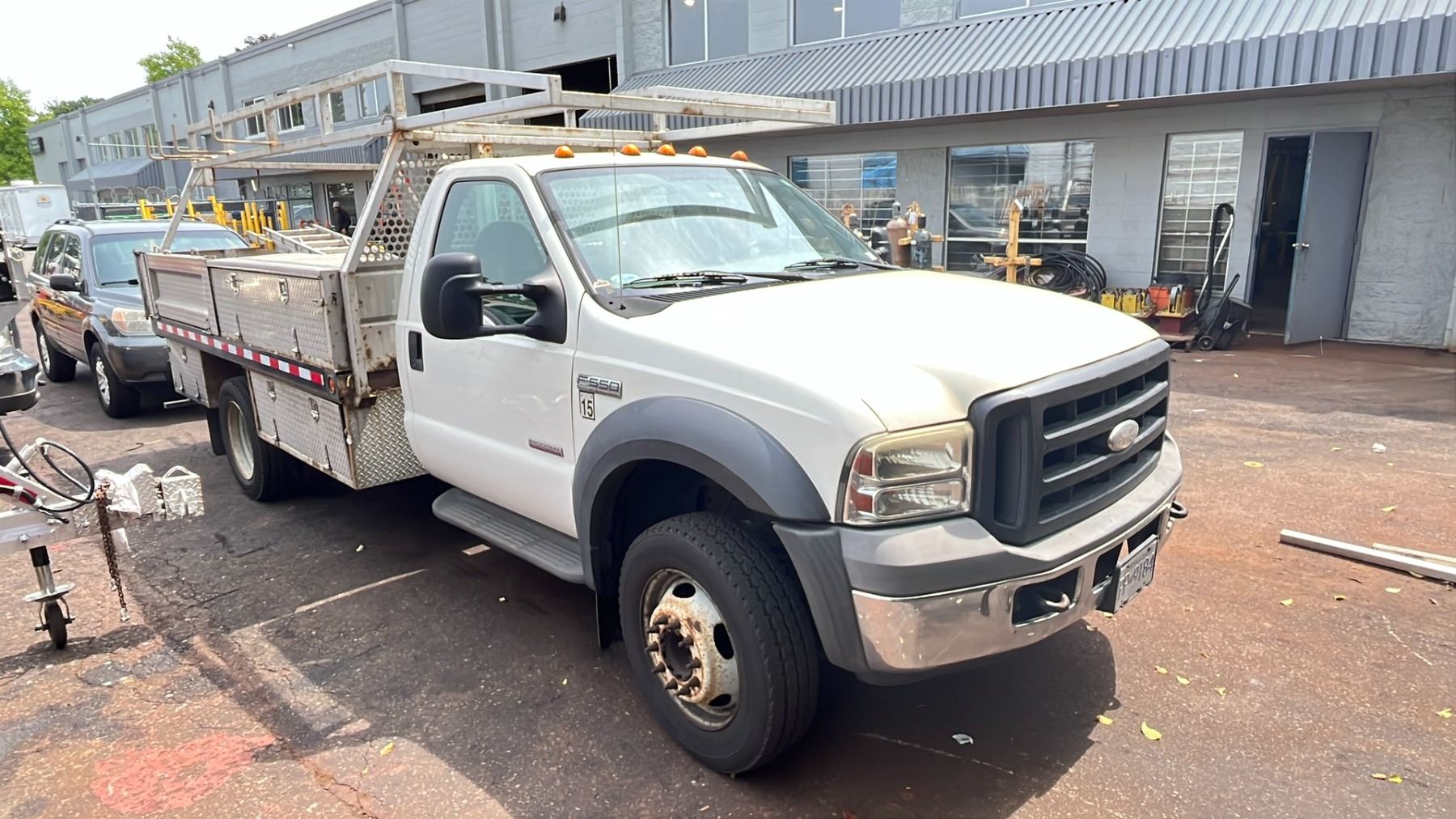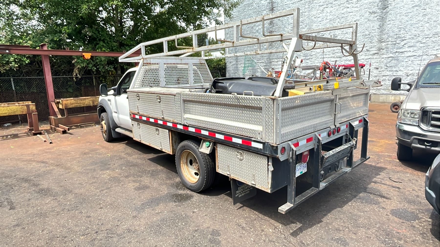 2005 FORD F-550 XL SUPERDUTY TURBO, 2DR FLATDECK PU, WHITE, VIN 1FDAF56P45EB02461 179,501 KMS, DIESEL (D), 6.0L 8CYL, AUTOMATIC, HAS REGISTRATION, HAS KEYS, FEATURES: RADIO, COMPACT DISC, POWER WINDOWS, CRUISE CONTROL, POWER LOCKS, 4 WHEEL DRIVE, LEATHER TRIM, HEATED SEAT, HISTORY: OOC, HAS BC REGISTRATION, WINDSHIELD CRACKED, SEAT RIPPED, MODIFIED CHECKER BOARD STORAGE UNITS, FLATDECK SERVICE BOX ALUMINUM, COMPARTMENT ROOF RACK, HEADACHE RACK, ICBC REPAIRED DEC $551.35, 1X ICBC NO DETAILS