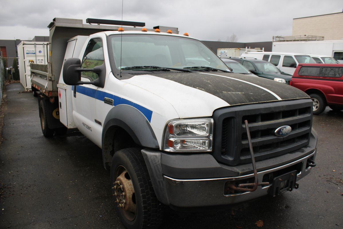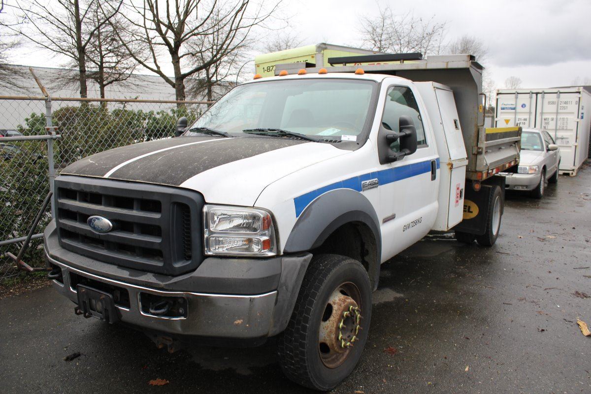 2006 FORD F-450 XL SUPER DUTY, 2 DOOR DUMP TRUCK, WHITE, VIN # 1FDXF46PX6EC64617 68,780KMS, DIESEL V8 TURBO, AUTOMATIC RD,AC, NO DECS