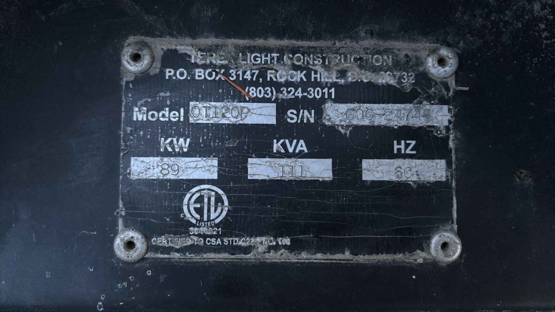 2007 TEREX OT120P GENERATOR TRAILER, YELLOW, VIN 1M9DA14B27M646207, 6,637.00 HOURS, HOURS NOT VERIFIED, DIESEL (D), HAS REGISTRATION, NO KEYS, FEATURES: PNEUMATIC TIRES, HISTORY: N/A, 6" RING COUPLING HITCH, 14FT 5IN X 6FT 2IN, EX-TELUS GENERATOR - DOES NOT RUN FUEL ISSUES, NO ICBC DECLARATIONS
