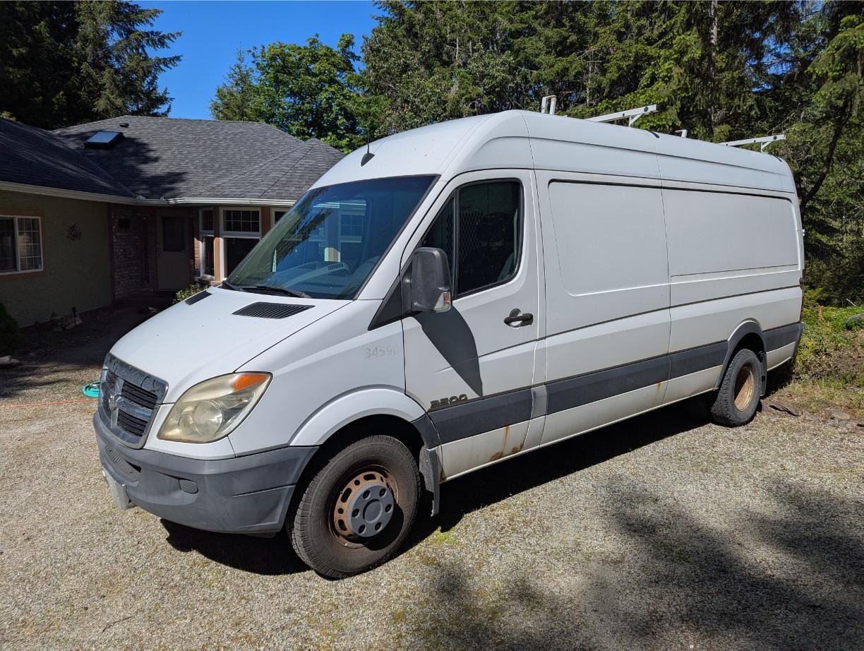 2008 DODGE SPRINTER 3500, 3DR CARGO VAN, WHITE, VIN WD0BF445285302352 170,624 KMS, DIESEL (D), AUTOMATIC, HAS REGISTRATION, HAS KEYS, FEATURES: RADIO, COMPACT DISC, POWER WINDOWS, TILT WHEEL, AIR COND, RUST ISSUES, BODY RUST, HIGH ROOF, LADDER RACK, LONG WHEEL BASE, DUAL REAR WHEELS, *LOCATED IN NANOOSE BAY* NO ICBC DECLARATIONS, CHECK ENGINE CODE P2457 EXHAUST GAS RECIRCULATION COOLER SYSTEM PERFORMANCE *SAT MAY 31 PICKUP ONLY*