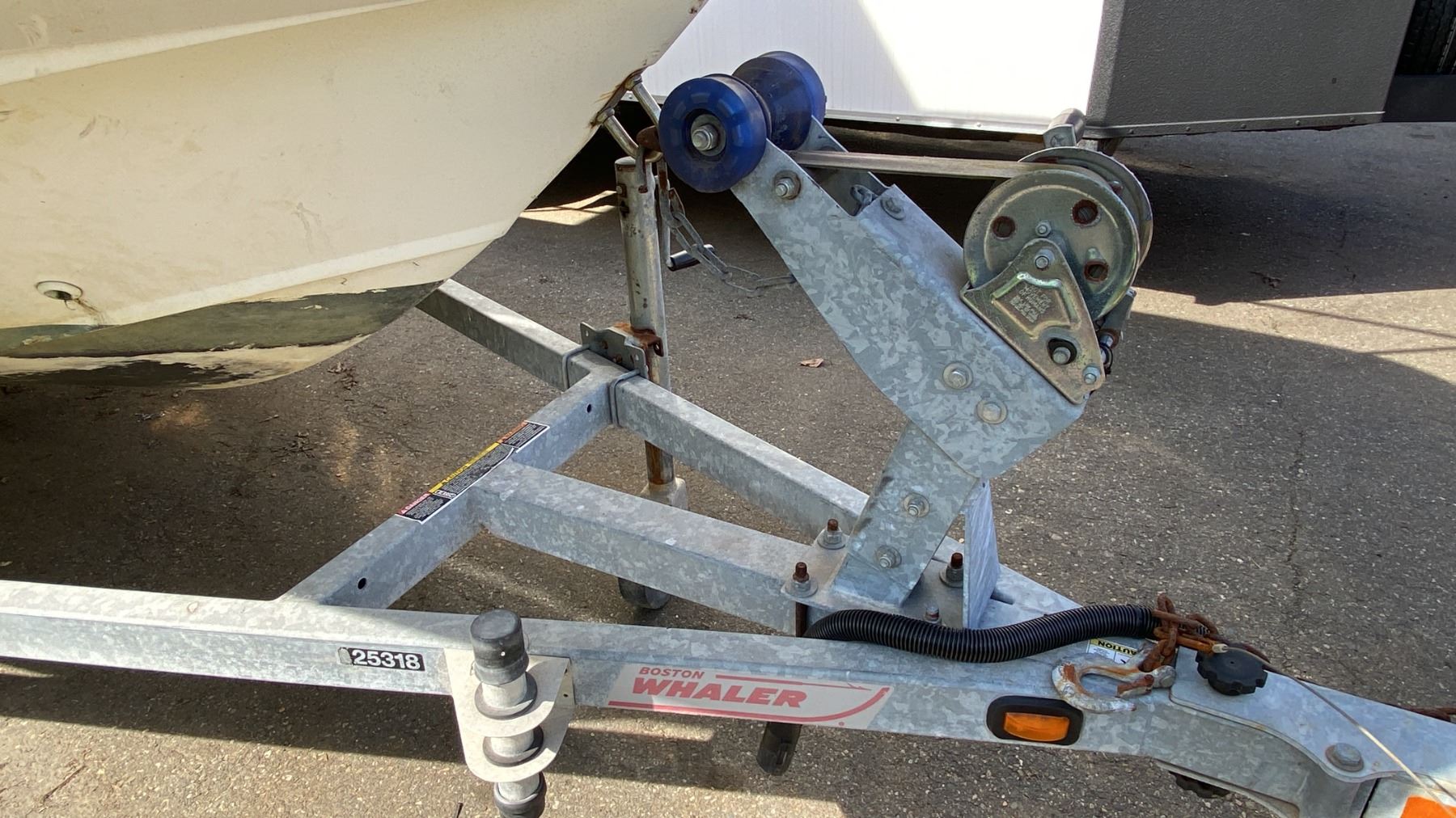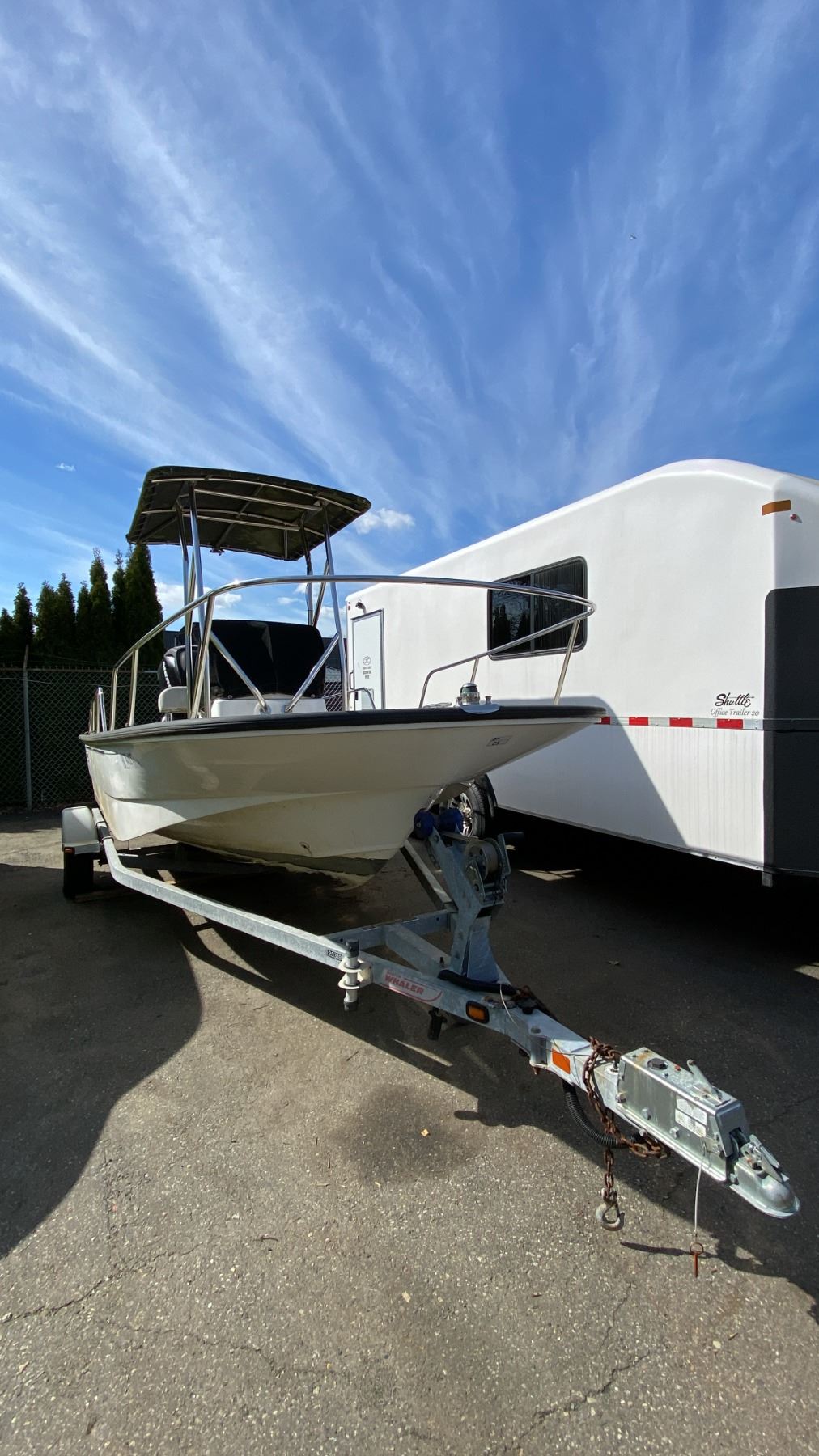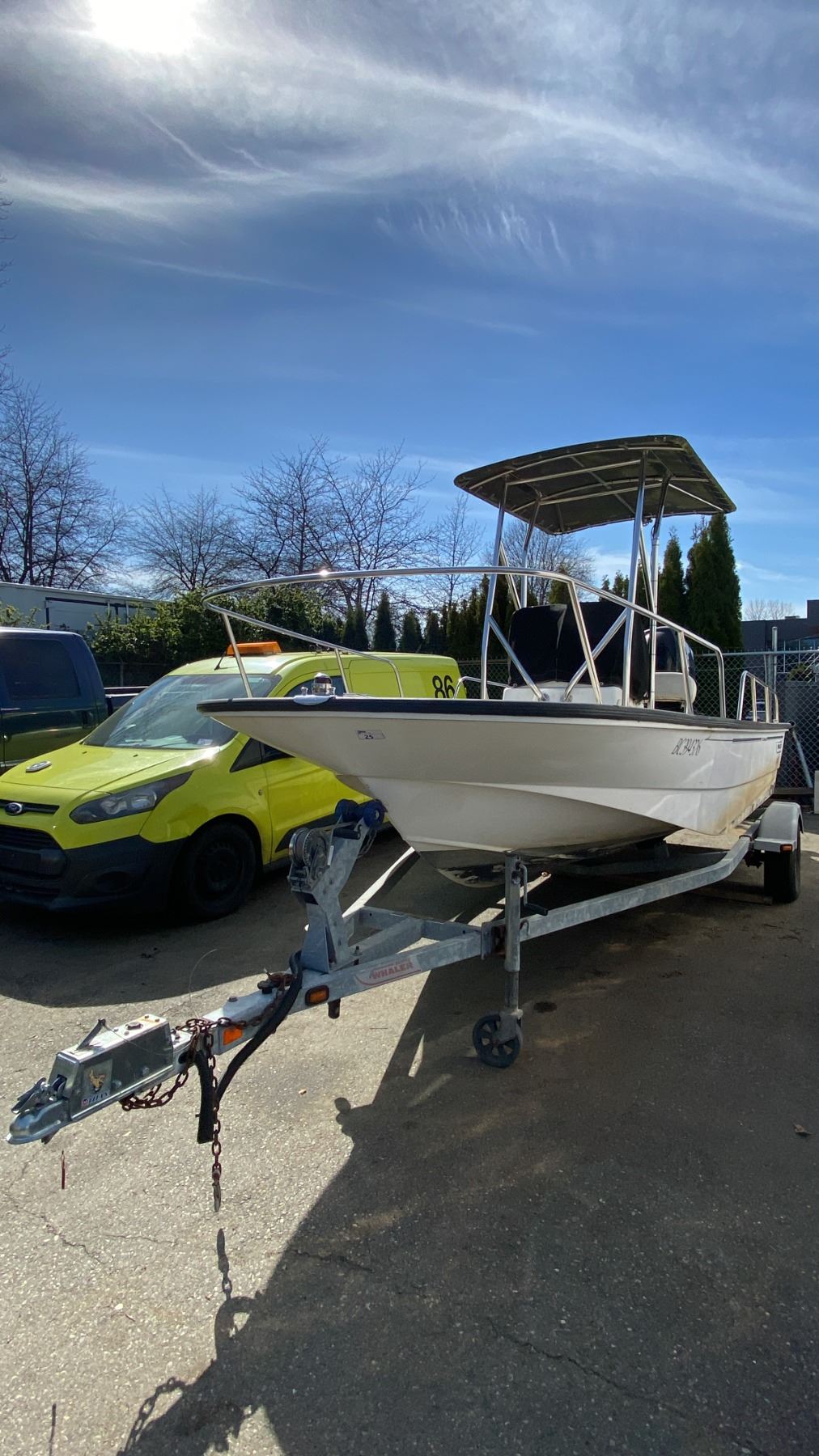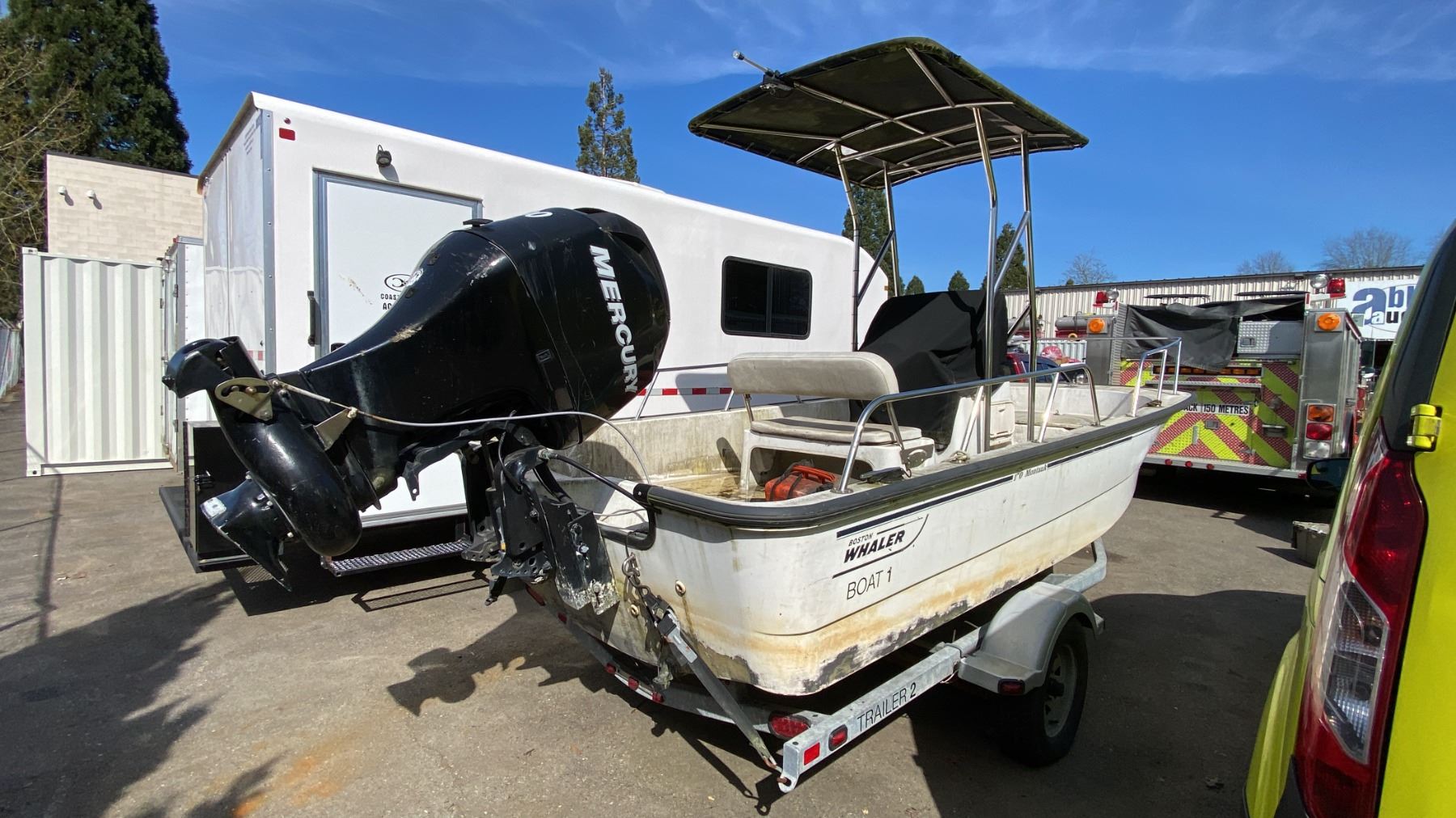 2008 KARAVAN BW235 BOAT TRAILER, SINGLE AXLE, GREY, VIN 5KTBS20178F002788, HAS REGISTRATION, NO KEYS, 1 7/8"-2" BALL, 17' BOAT TRAILER, 20' TO TONGUE, HAND CRANK JACK, HAS BOSTON WHALER 170 MONTAUK 17', SINGLE DRIVER 3 PERSON BOAT WITH MERCURY 90 OUTBOARD MOTOR AND TANK NO ICBC DECLARATIONS