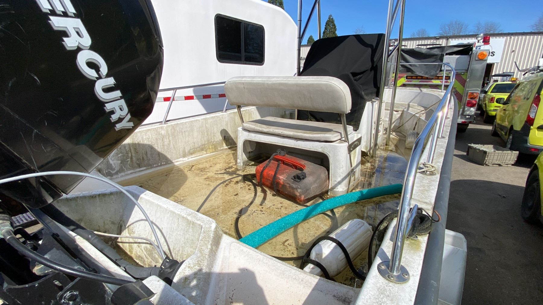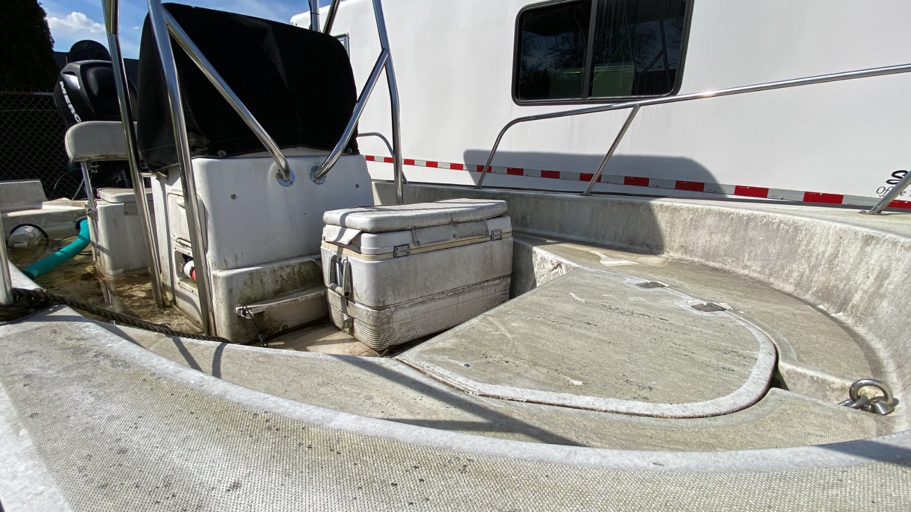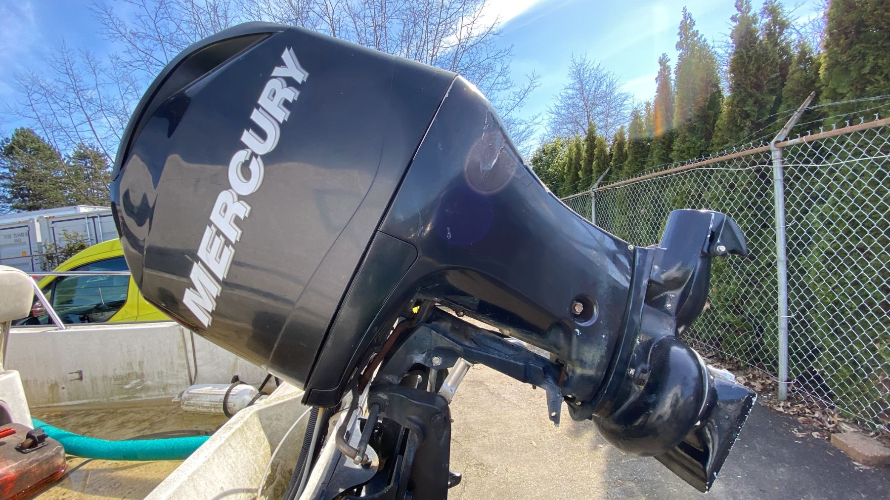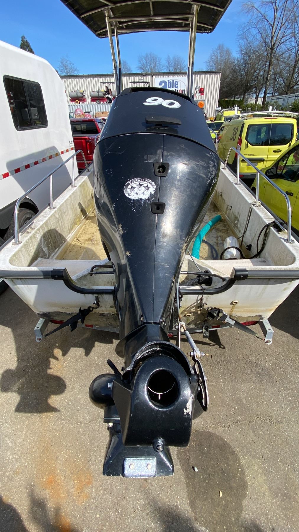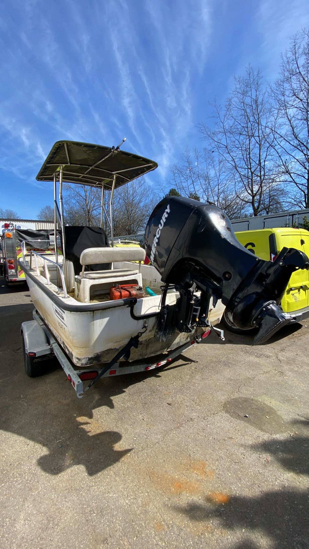 2008 KARAVAN BW235 BOAT TRAILER, SINGLE AXLE, GREY, VIN 5KTBS20178F002788, HAS REGISTRATION, NO KEYS, 1 7/8"-2" BALL, 17' BOAT TRAILER, 20' TO TONGUE, HAND CRANK JACK, HAS BOSTON WHALER 170 MONTAUK 17', SINGLE DRIVER 3 PERSON BOAT WITH MERCURY 90 OUTBOARD MOTOR AND TANK NO ICBC DECLARATIONS