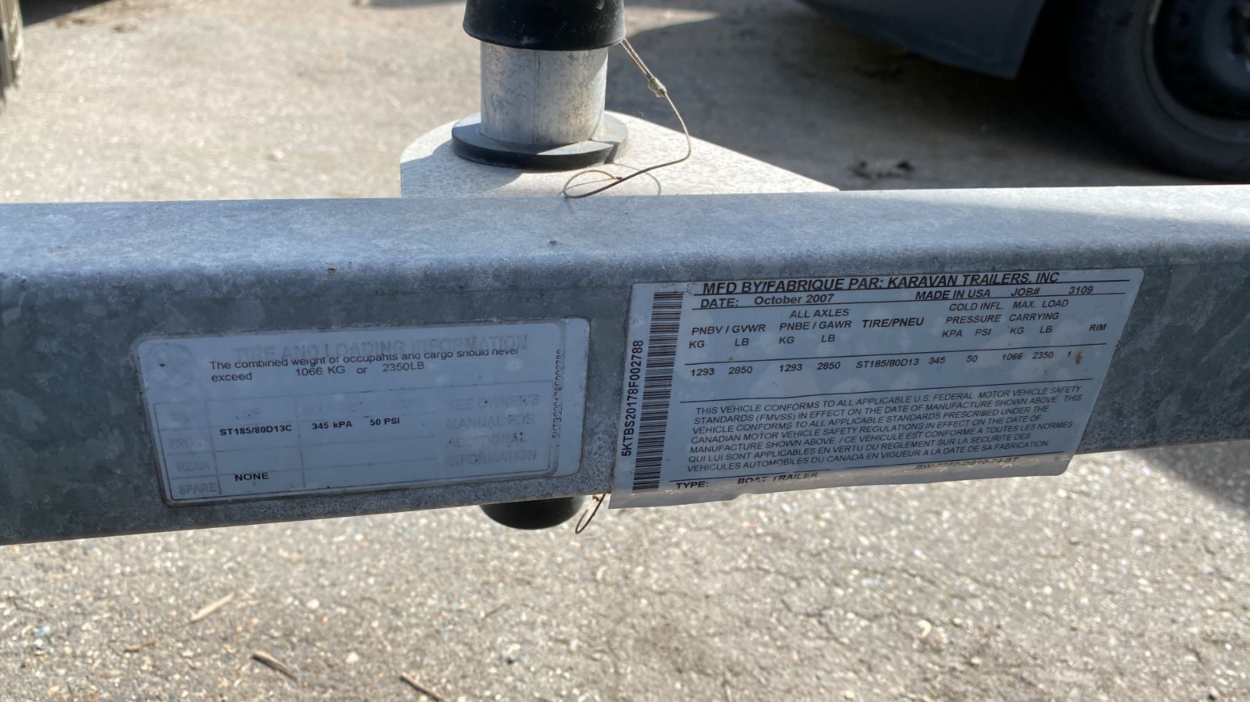 2008 KARAVAN BW235 BOAT TRAILER, SINGLE AXLE, GREY, VIN 5KTBS20178F002788,