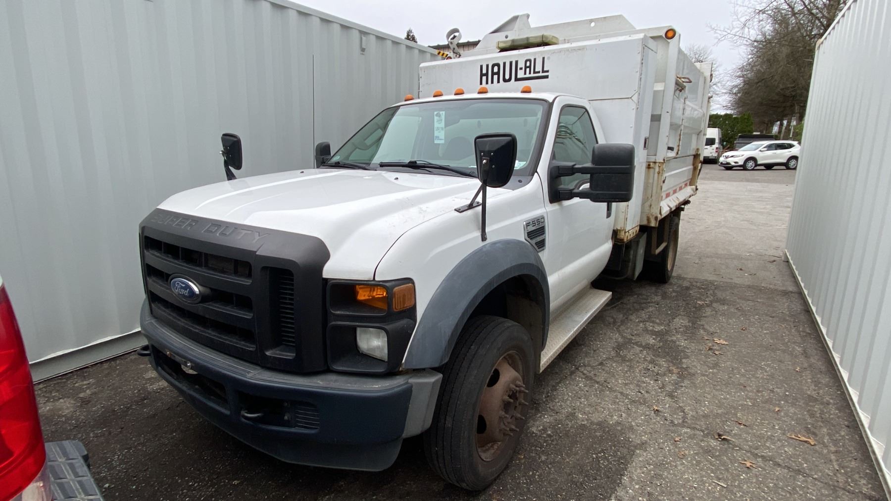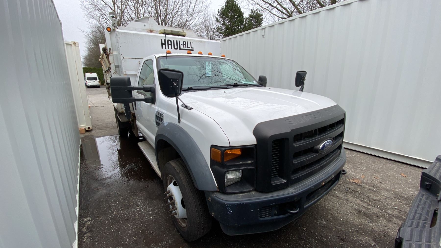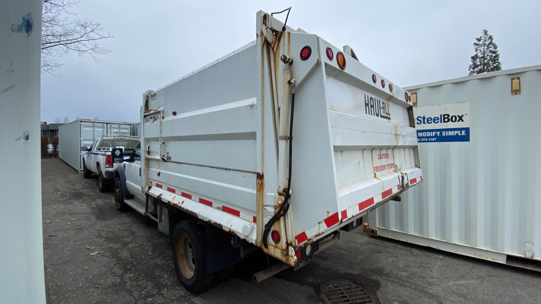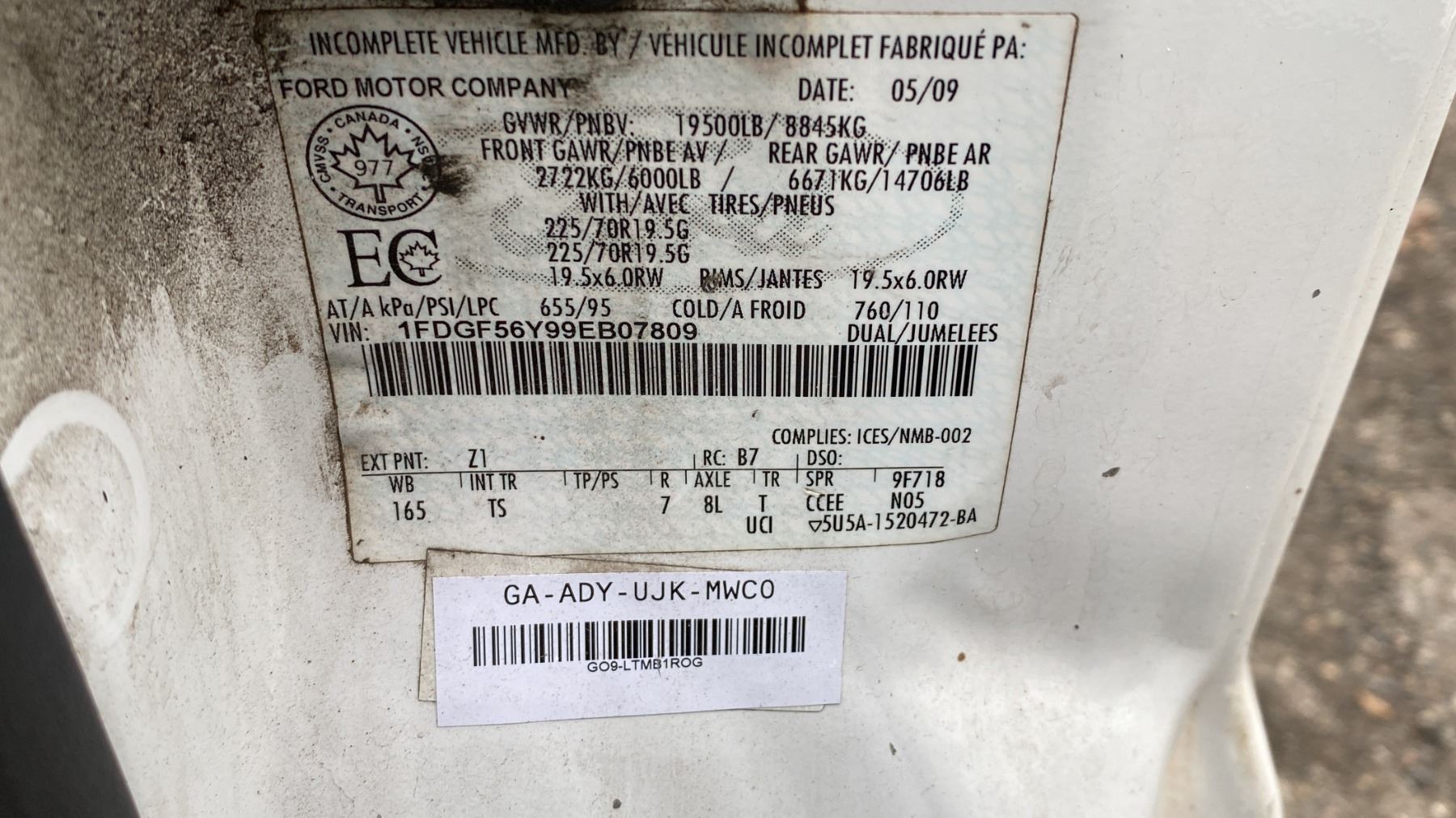 2009 FORD F-550 XL SUPERDUTY, 2DR PACKER PU, WHITE, VIN 1FDGF56Y99EB07809, 182,918 KMS, GAS (G), 6.8L TRITON V10, AUTOMATIC, HAS REGISTRATION, HAS KEYS, FEATURES: RADIO, AIR COND, RUST ISSUES, HISTORY: X-CITY, 1 ICBC DECLARATION NO DETAILS, SCRATCHES AND DENTS ALL OVER, AFTERMARKET MIRRORS ATTACHED TO FRONT FENDERS, GARBAGE COMPACTER UNIT WITH HYDRAULIC CONTROLS AND SIDE ARM, DUAL LOCKING BOXES BEHIND CAB AND ROOF MOUNTED SAFETY LIGHT