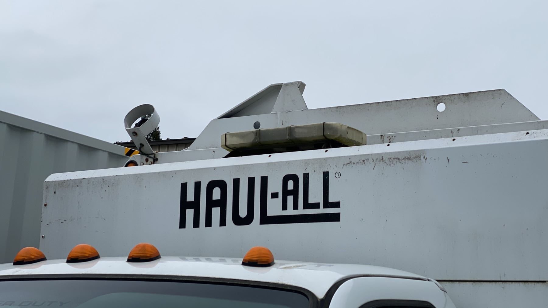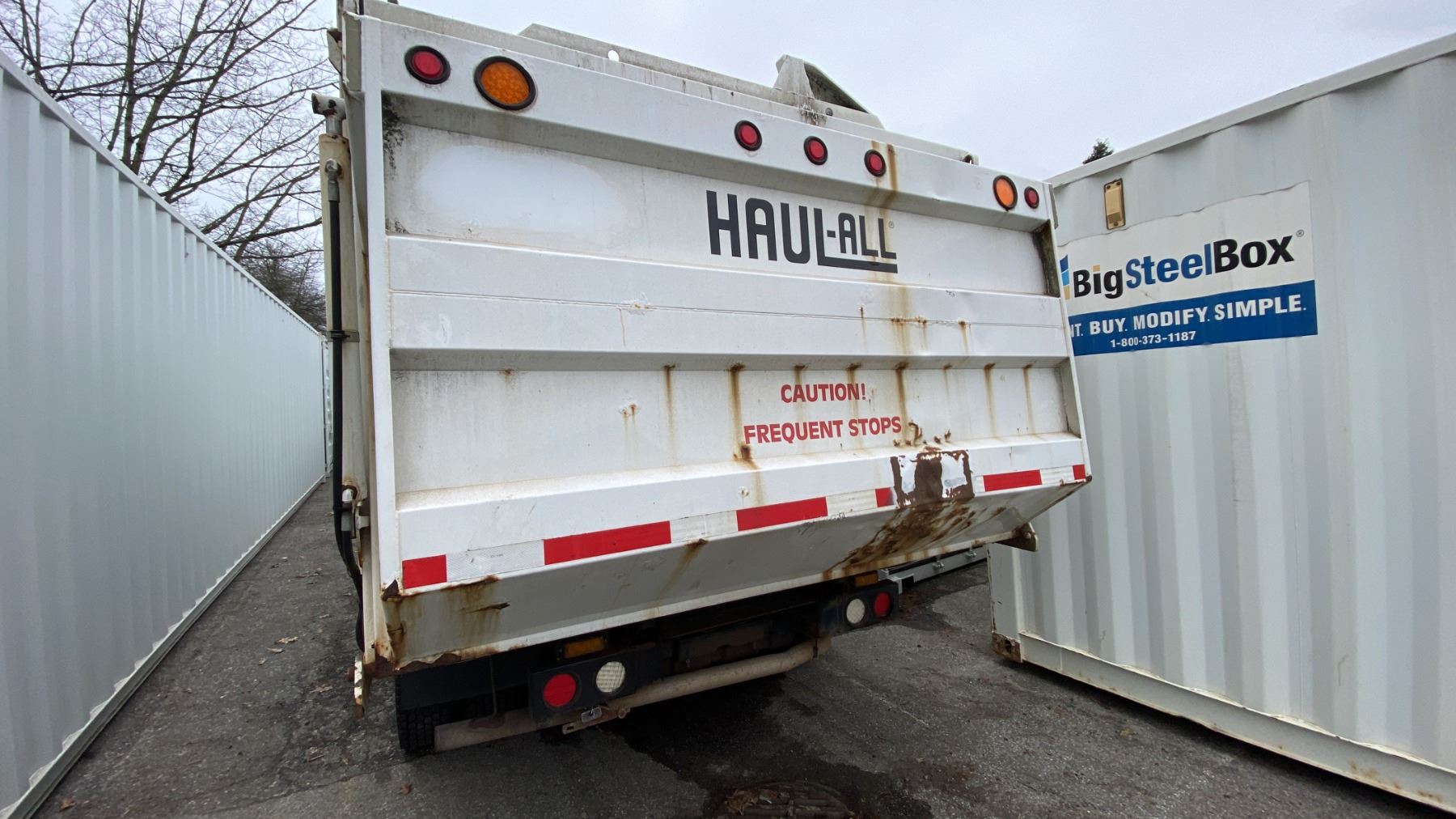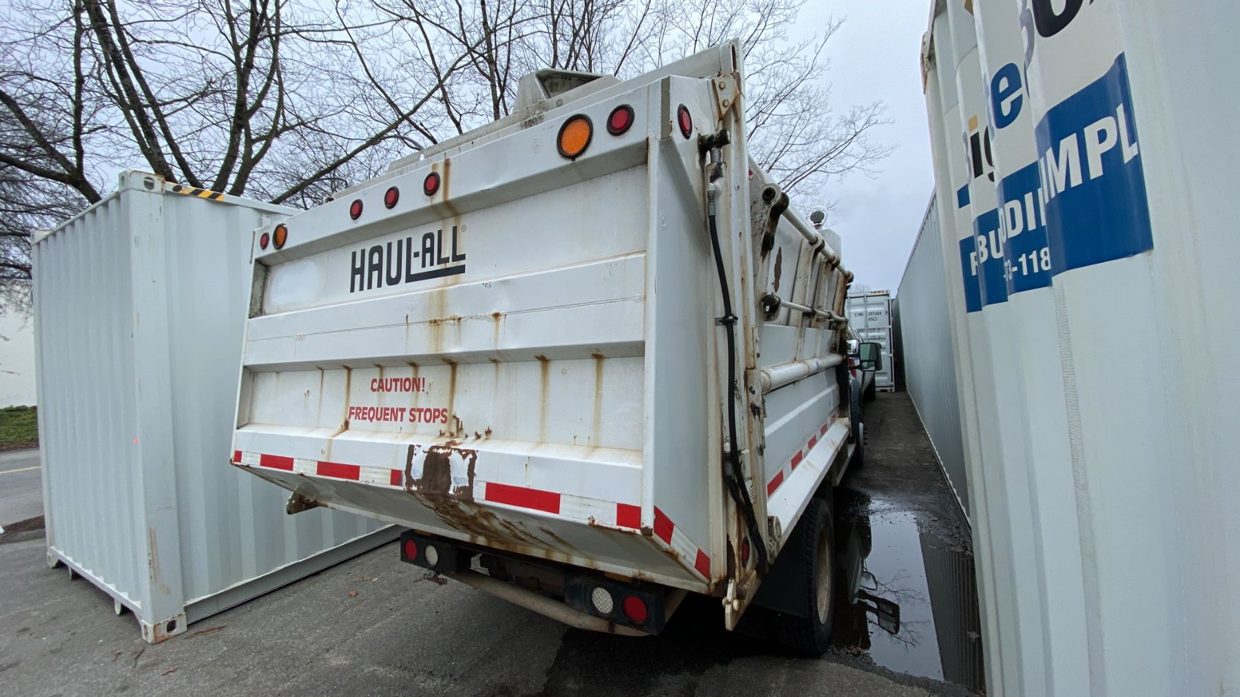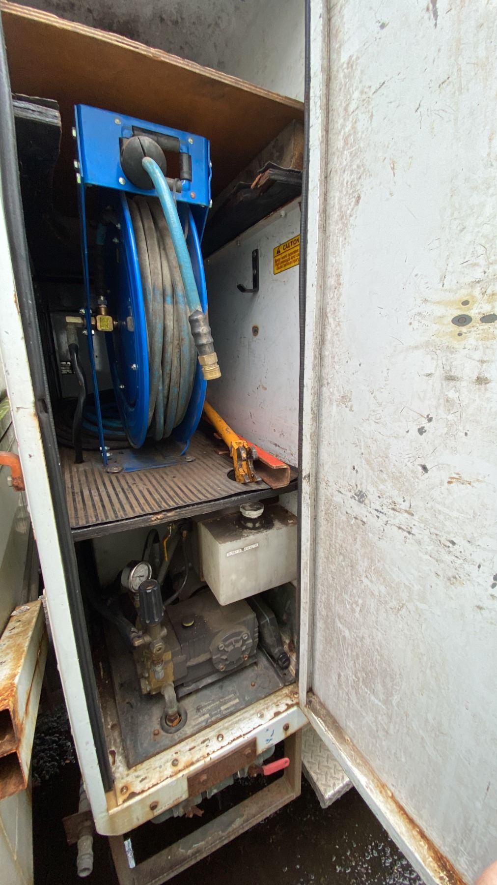 2009 FORD F-550 XL SUPERDUTY, 2DR PACKER PU, WHITE, VIN 1FDGF56Y99EB07809, 182,918 KMS, GAS (G), 6.8L TRITON V10, AUTOMATIC, HAS REGISTRATION, HAS KEYS, FEATURES: RADIO, AIR COND, RUST ISSUES, HISTORY: X-CITY, 1 ICBC DECLARATION NO DETAILS, SCRATCHES AND DENTS ALL OVER, AFTERMARKET MIRRORS ATTACHED TO FRONT FENDERS, GARBAGE COMPACTER UNIT WITH HYDRAULIC CONTROLS AND SIDE ARM, DUAL LOCKING BOXES BEHIND CAB AND ROOF MOUNTED SAFETY LIGHT