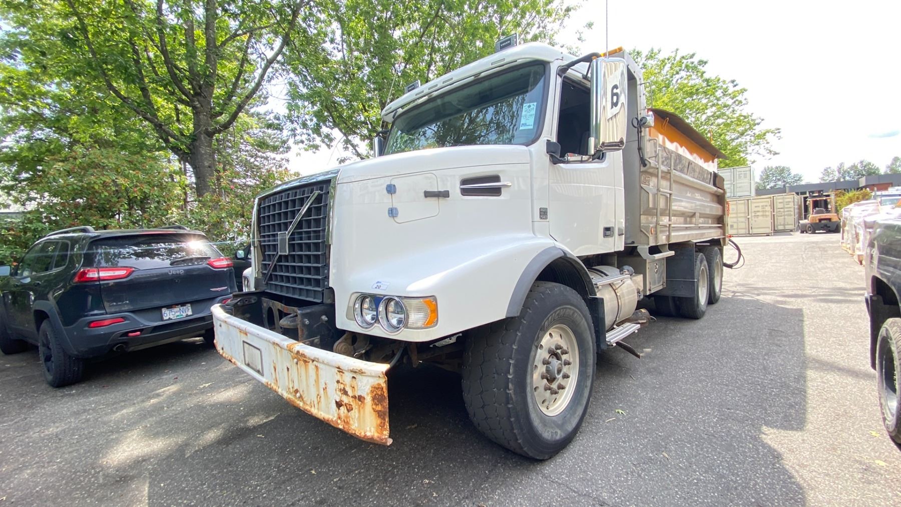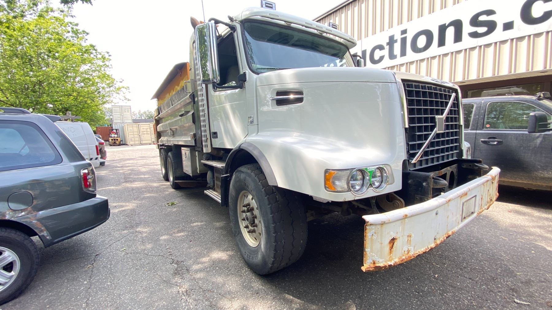 2009 VOLVO D13 DUMP TRUCK WHITE VIN 4V5KC9EJ29N277156 431,099 KMS, DIESEL (D), D13485HP, MANUAL TRANSMISSION, HAS REGISTRATION, HAS KEYS FEATURES: COMPACT DISC, POWER WINDOWS, REAR AIR COND, CRUISE CONTROL, POWER SEATS, TRAILER HITCH, POWER LOCKS, AIR COND HISTORY: X-CITY, VOLVO DUMP TRUCK WITH GRADER AND PLOW ATTACHMENTS, SALT SPREADER NOT INCLUDED, 1 ICBC DECLARATION NO DETAILS, TAILGATE INCLUDED