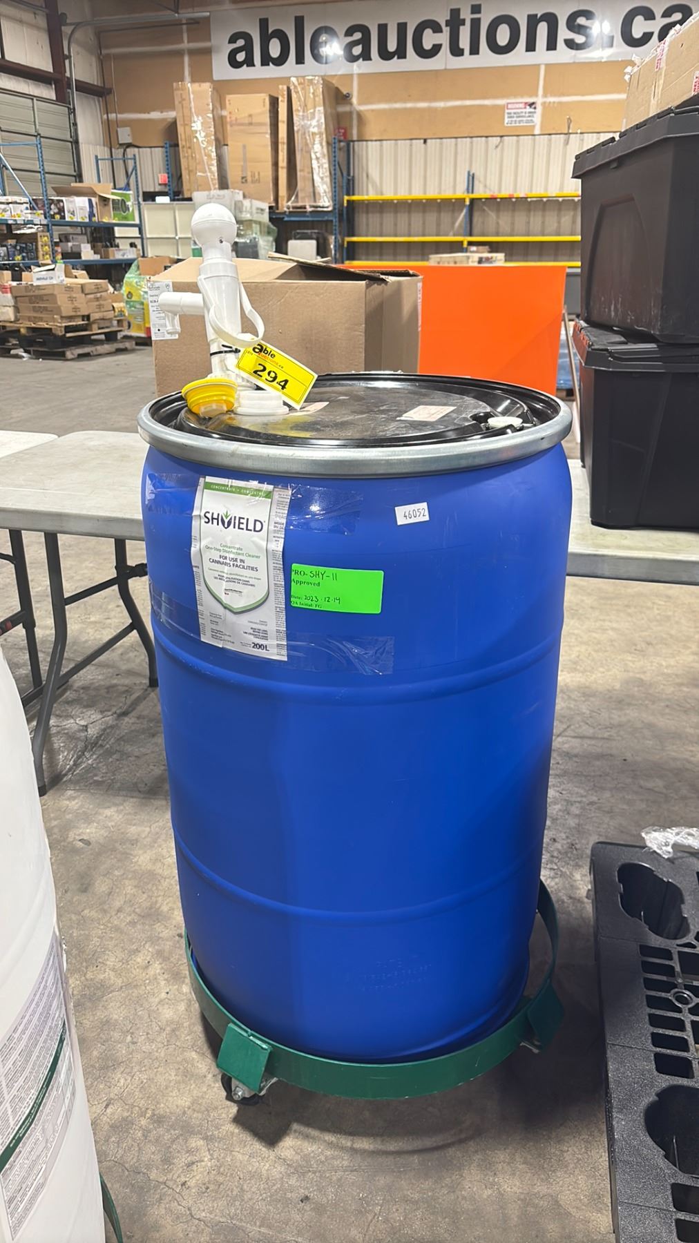 200L OF SHYIELD CONCENTRATE ONE STEP DISINFECTANT CLEANER WITH A HAND PUMP ON A ULINE 24" DIAMETER DRUM DOLLY