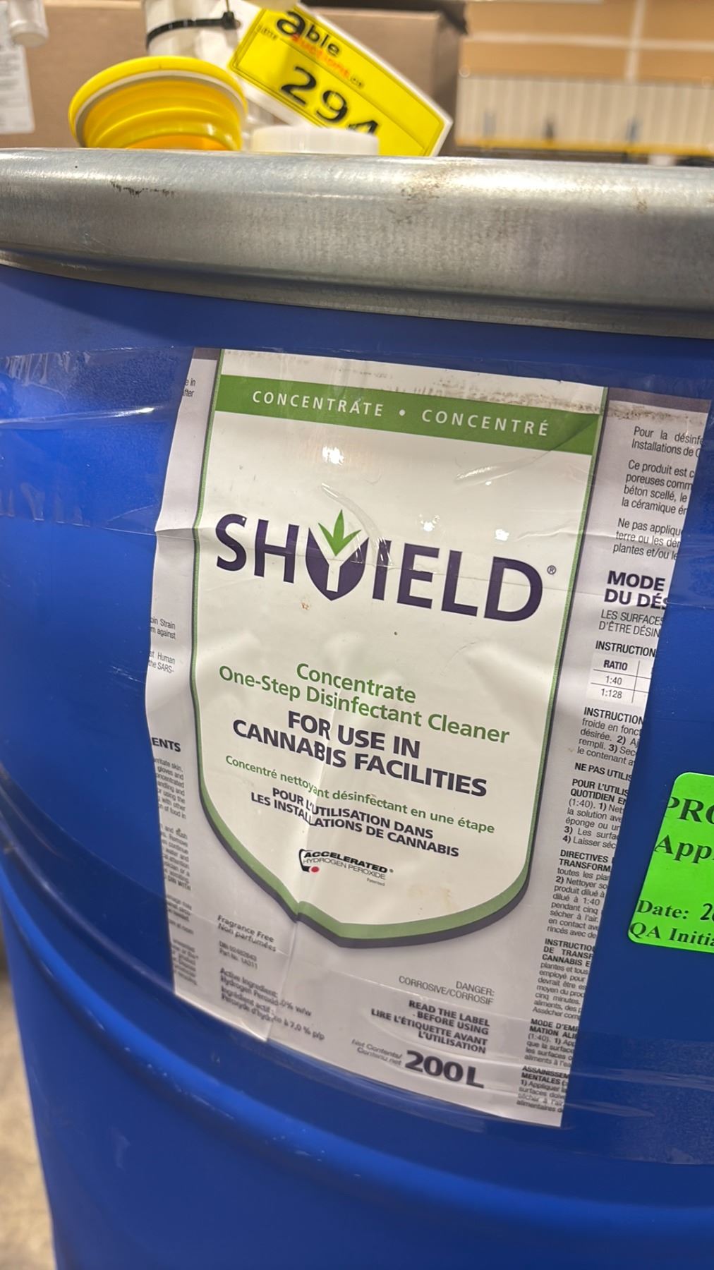 200L OF SHYIELD CONCENTRATE ONE STEP DISINFECTANT CLEANER WITH A HAND PUMP ON A ULINE 24" DIAMETER