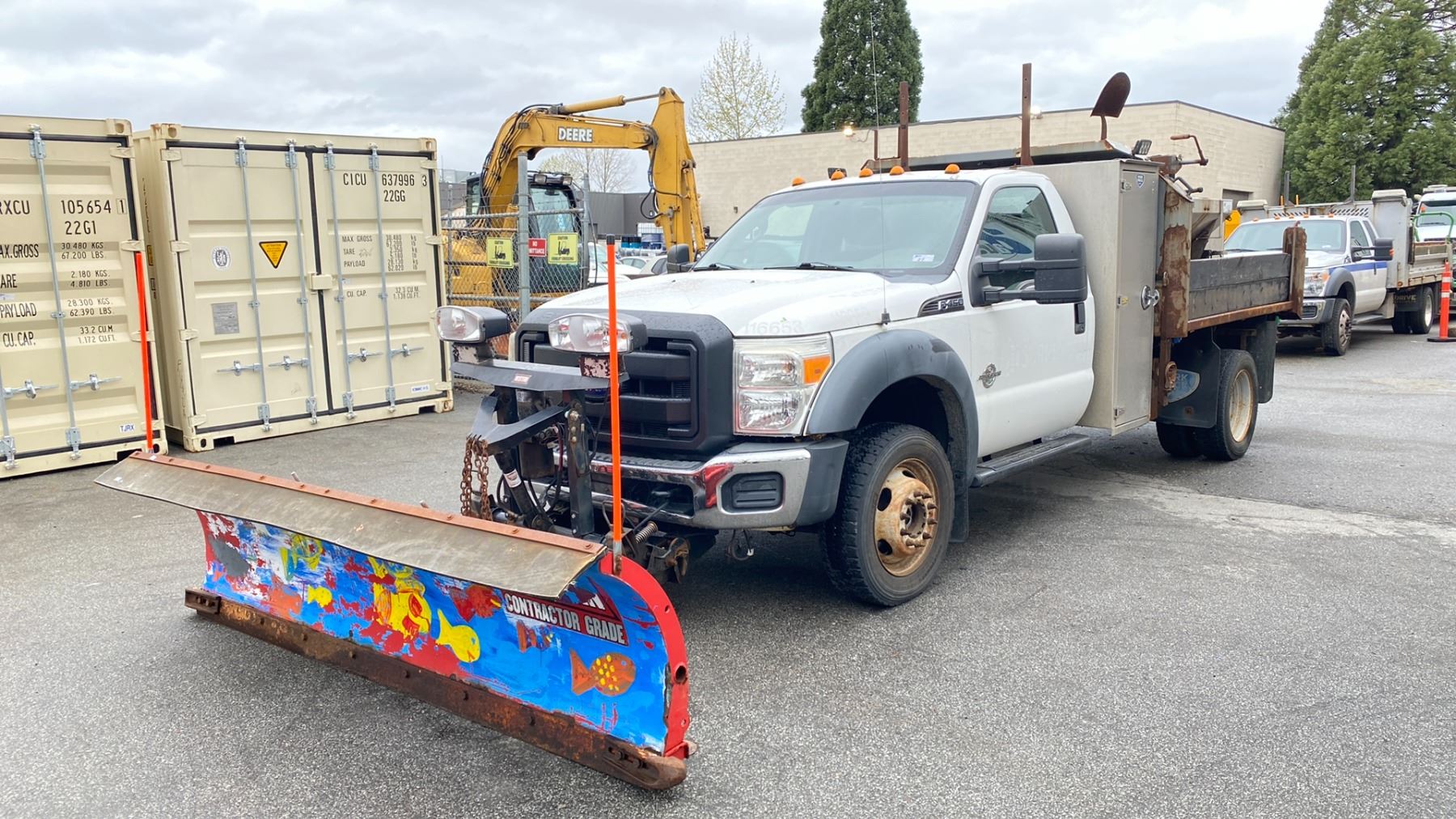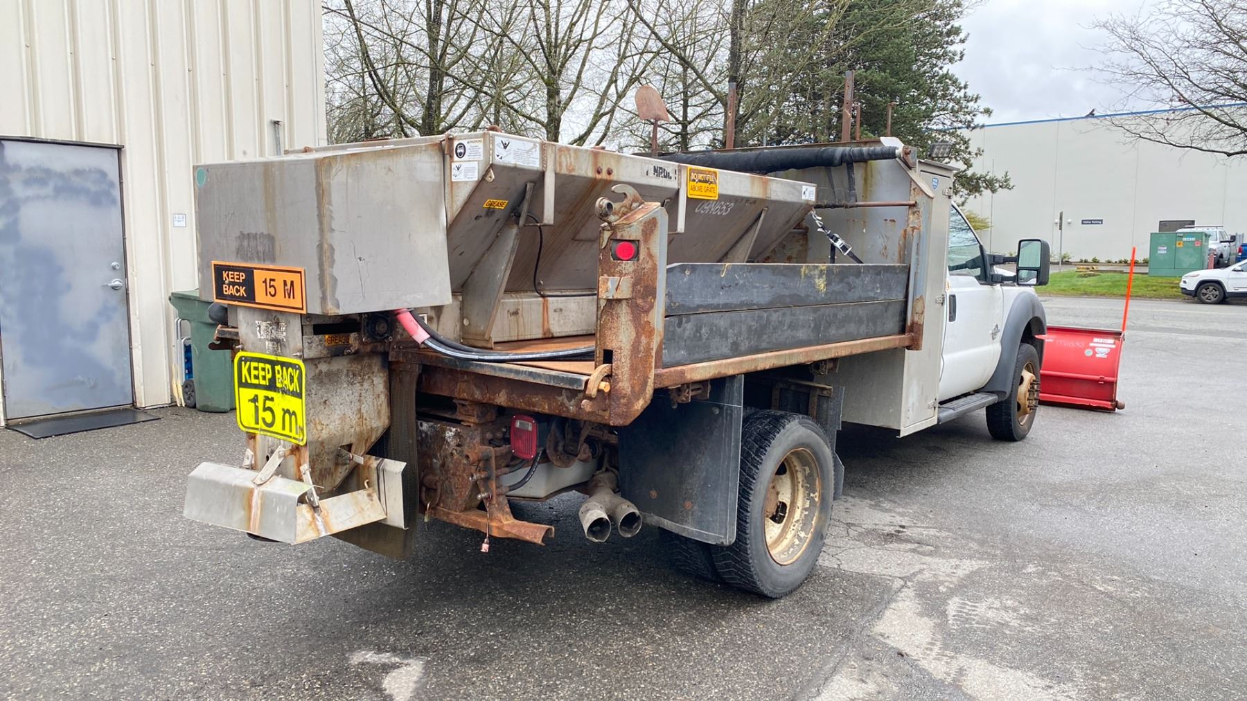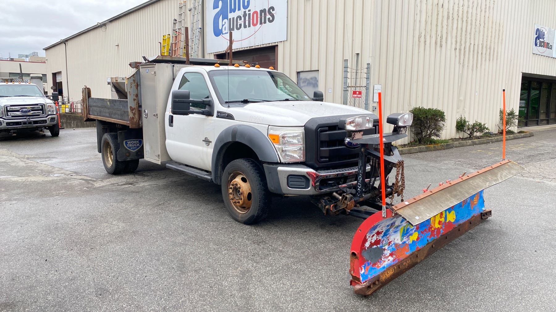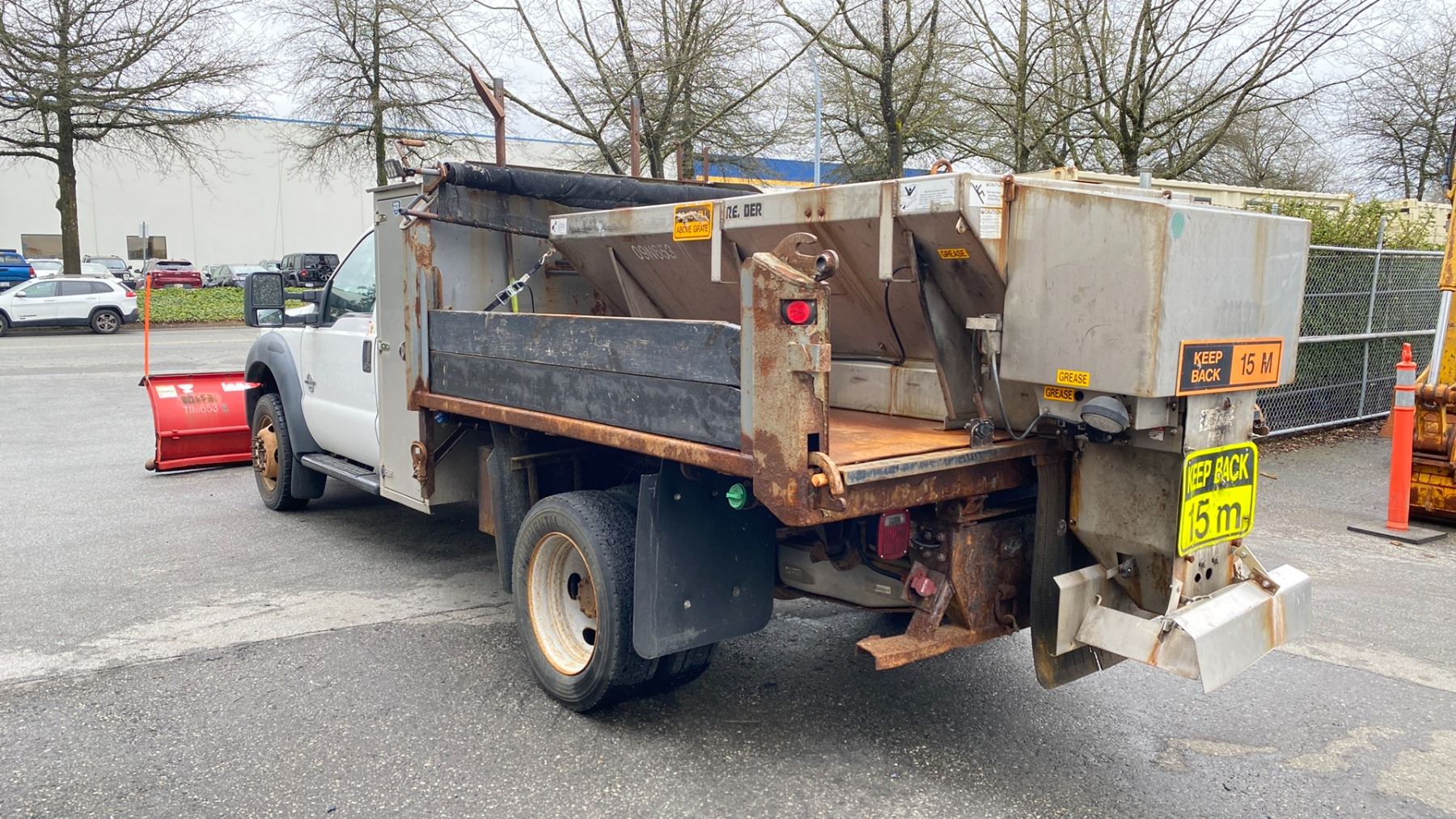 2011 FORD F-450 SUPERDUTY POWERSTROKE, 2DR DUMP TRUCK, WHITE, VIN 1FDUF4HT7BEC23028 204,747 KMS, DIESEL (D), 6.7L, AUTOMATIC, HAS REGISTRATION, HAS KEYS, FEATURES: RADIO, TRAILER HITCH, TILT WHEEL, 4 WHEEL DRIVE, AIR COND, HISTORY: X-CITY, HYDRAULIC DUMP BOX WITH CONTROLS IN CAB, MONROL 10'X4' STAINLESS STEEL BED SALTER, WESTERN PRO PLUS 9' SNOW PLOW BLADE WITH HYDRAULIC FRONT MOUNTING BRACKET & LIGHT ATTACHMENT, HAND REMOTE IN CAB, NO ICBC DECLARATIONS