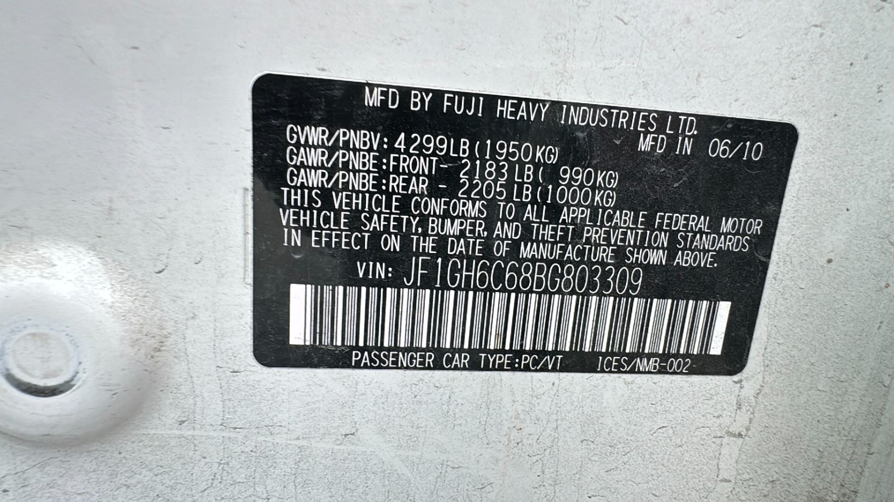 2011 SUBARU IMPREZA WHITE VIN JF1GH6C68BG803309 235,702.00 KMS, GAS (G), KEYS: YES HAS AN OPEN RECAL ( FRONT PASSENGER AIRBAG INFLATOR) ICBC 1 X NO DETAILS, ICBC 1 X $4,035.63, GLASS REPAIR 1 X $1,111.83 *HAS BC REGISTRATION*