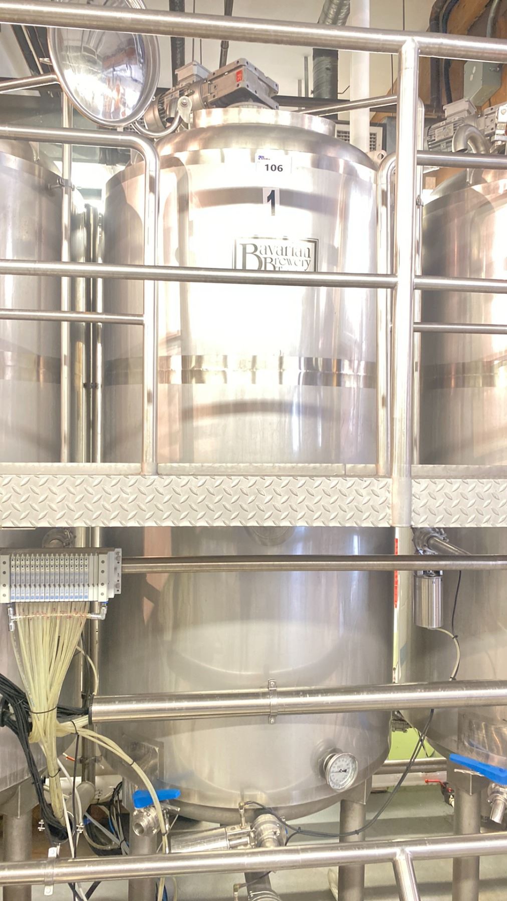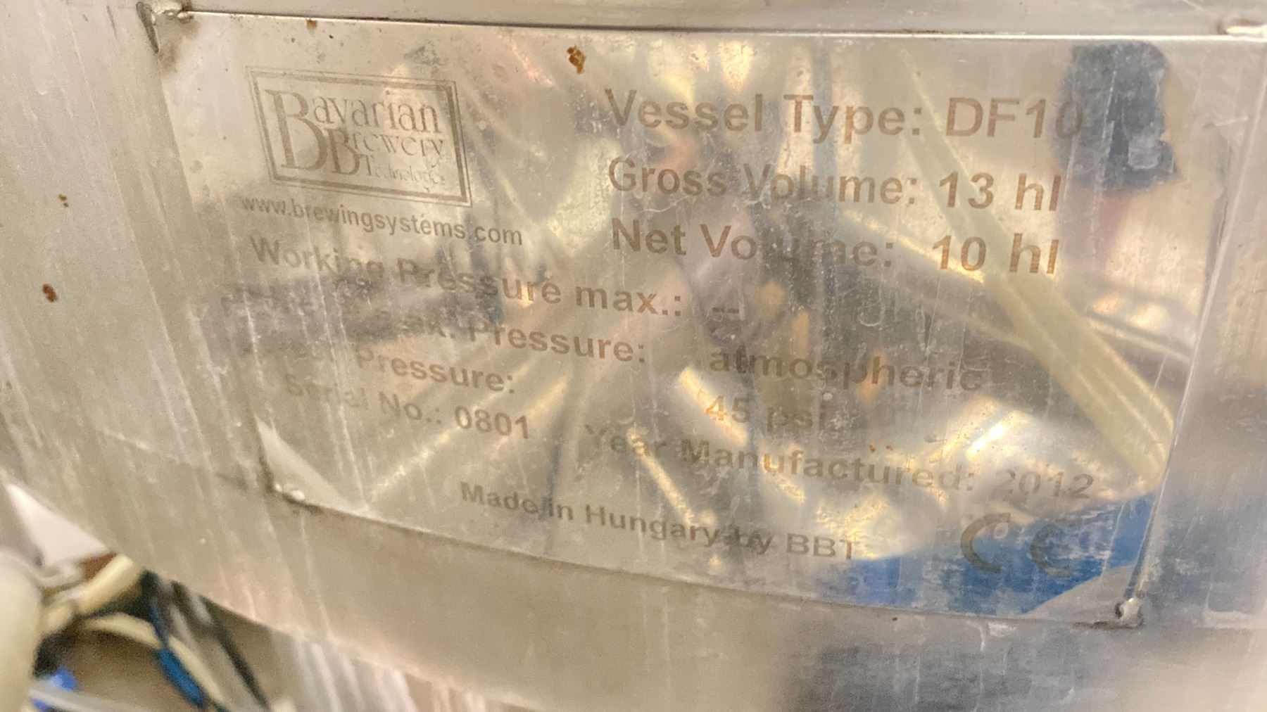 2012 BAVARIAN BREWERY TECHNOLOGIES DF10 STAINLESS STEEL COMMERCIAL 13HL TOP OPEN BREWERY TANK WITH AGISYS IE2 COMMERCIAL TANK AGITATORS, 2 CANISTER FLOW VALVES, & TEMPERATURE GAUGE