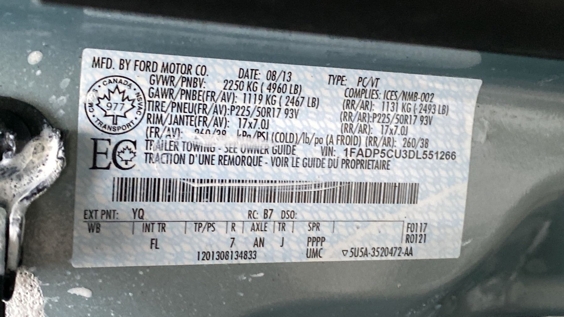 2013 FORD C-MAX E-NERGI, 4DR HATCHBACK, BLUE, VIN 1FADP5CU3DL551266, 34,066 KMS, HYBRID (G/E), 2.0L, AUTOMATIC, HAS REGISTRATION, HAS KEYS, FEATURES: RADIO, COMPACT DISC, POWER WINDOWS, NAV BACKUP CAMERA, DIGITAL VIDEO, REAR AIR COND, CRUISE CONTROL, POWER SEATS, QUAD SEATS, ALLOY WHEELS, POWER LOCKS, TILT WHEEL, AIR COND, LEATHER TRIM, HEATED SEAT, HISTORY: X-CITY, X-EMERGENCY,5 SEATS, MINOR SCRATCHES AND DENTS AROUND BODY, 2 ICBC ESTIMATES $8,227.84, 2 ICBC REPAIRED DECLARATIONS $7,631.11