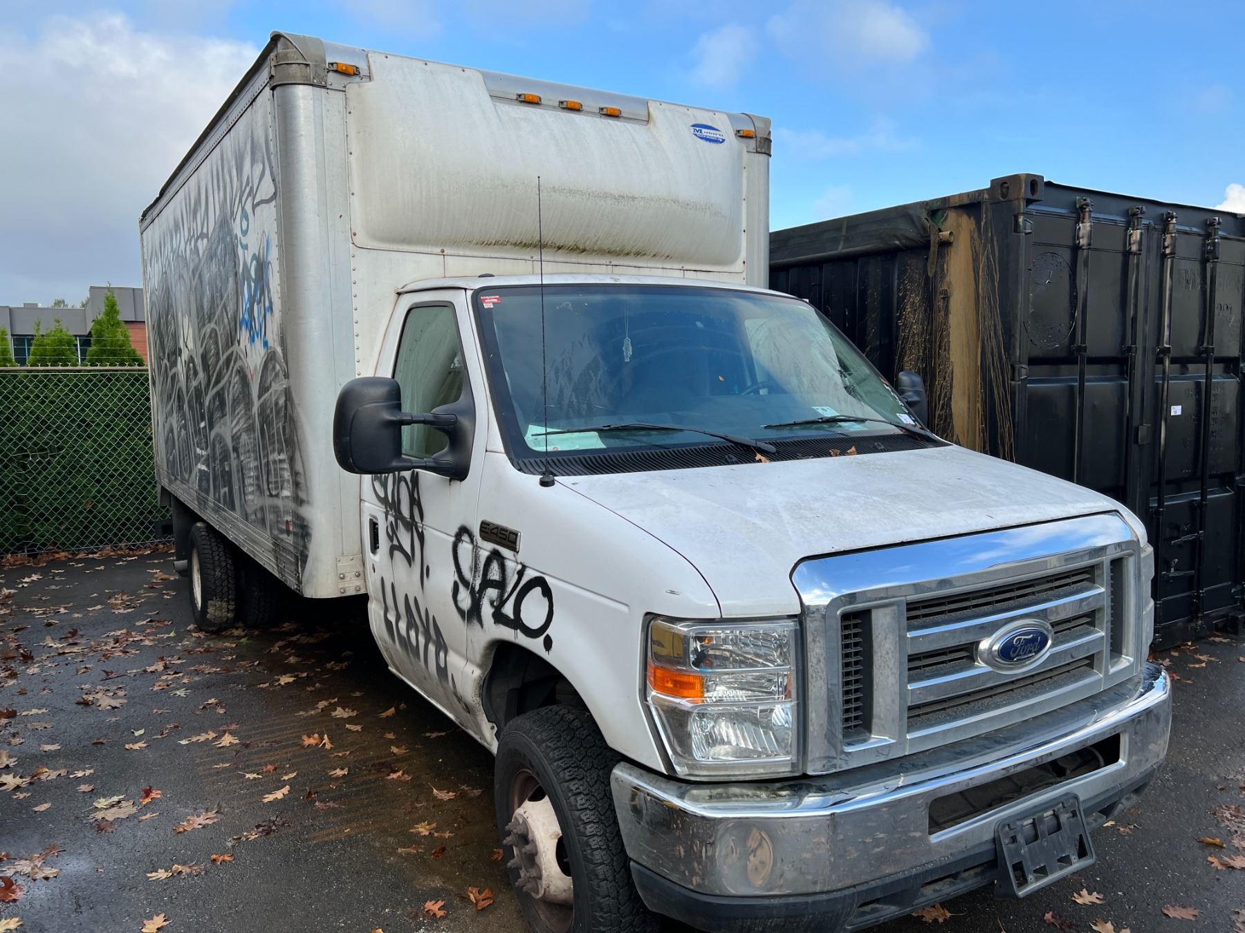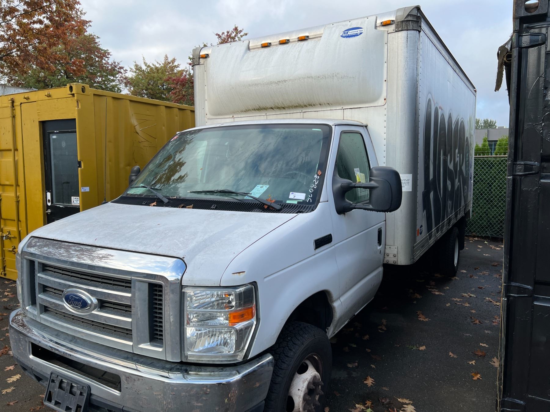 *2013 FORD E450 SD ECONOLINE CUBE VAN, WHITE, VIN 1FDXE4FSXDDA93829 126,633 KM'S GAS AUTOMATIC RD, CD,TW,AC, TIRE BENT, NOT ROADWORTHY, MUST TOW, I ICBC DEC NO DETAILS, 1 ICBC DEC TTL 5210.70