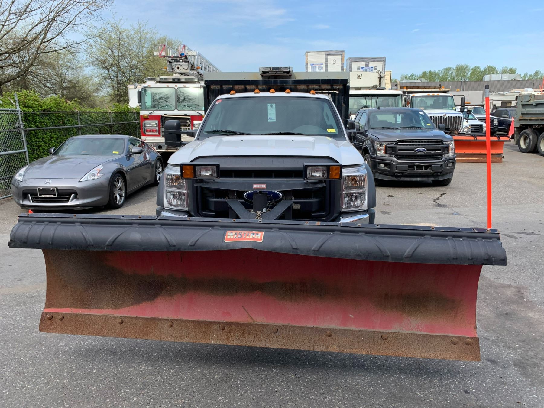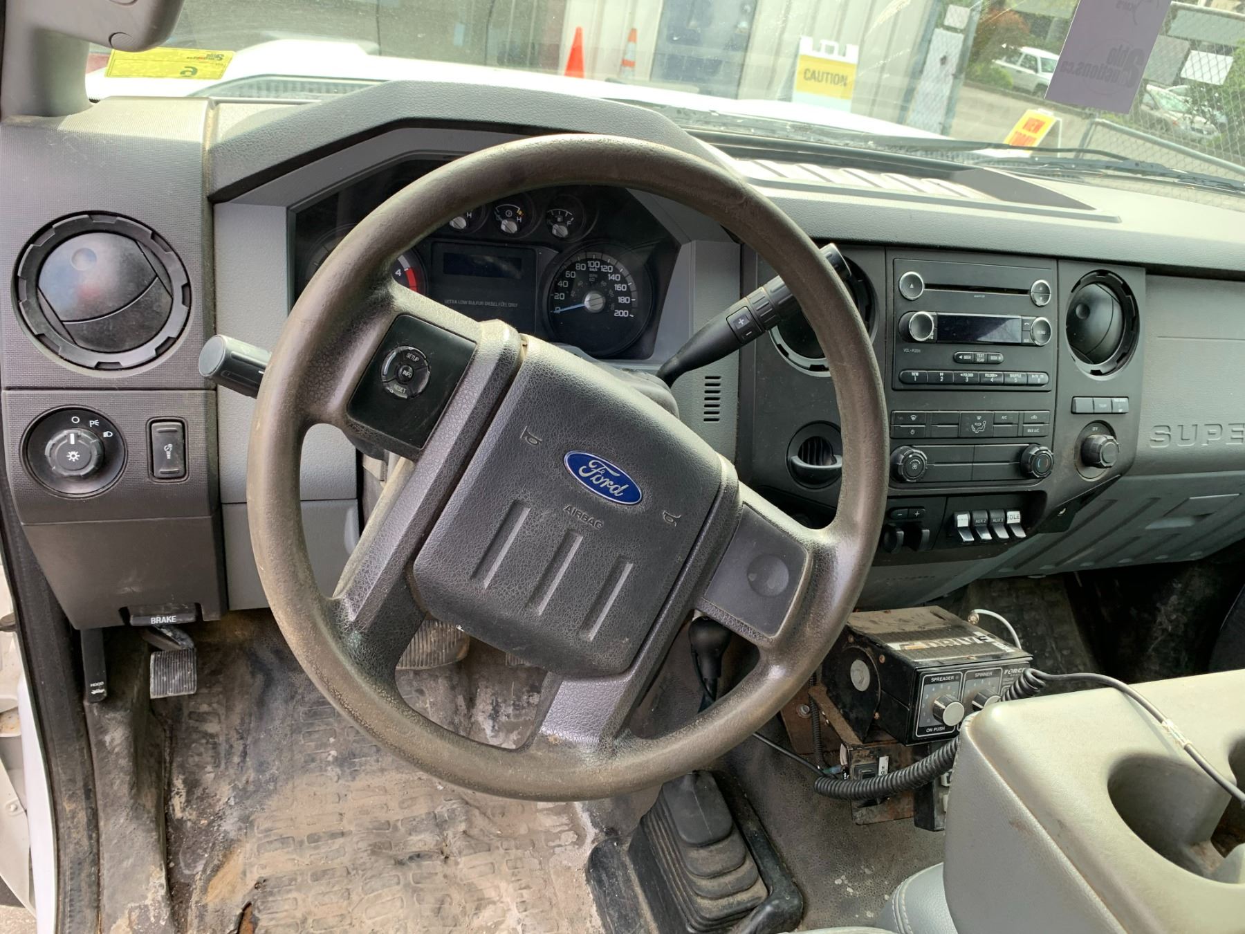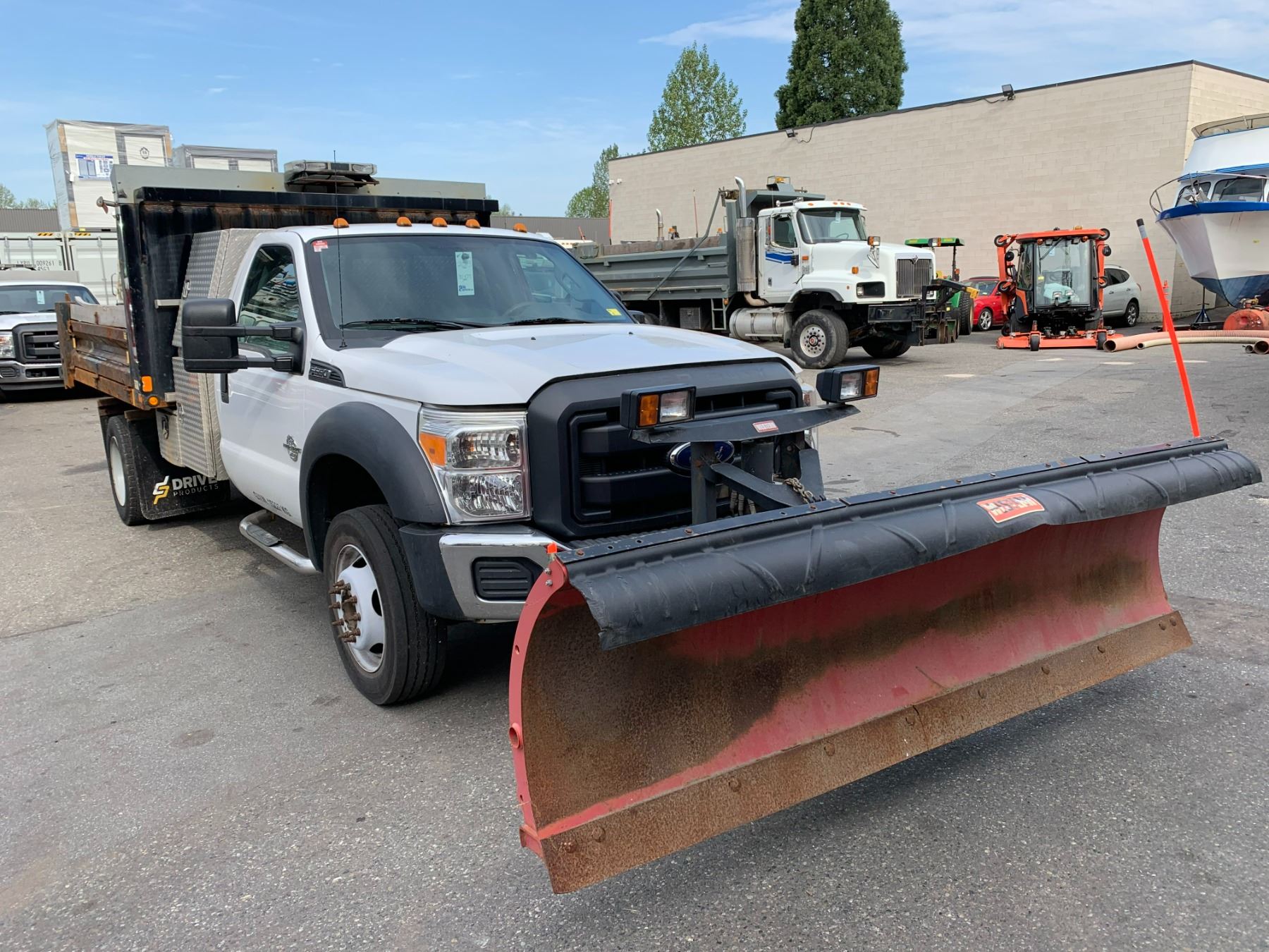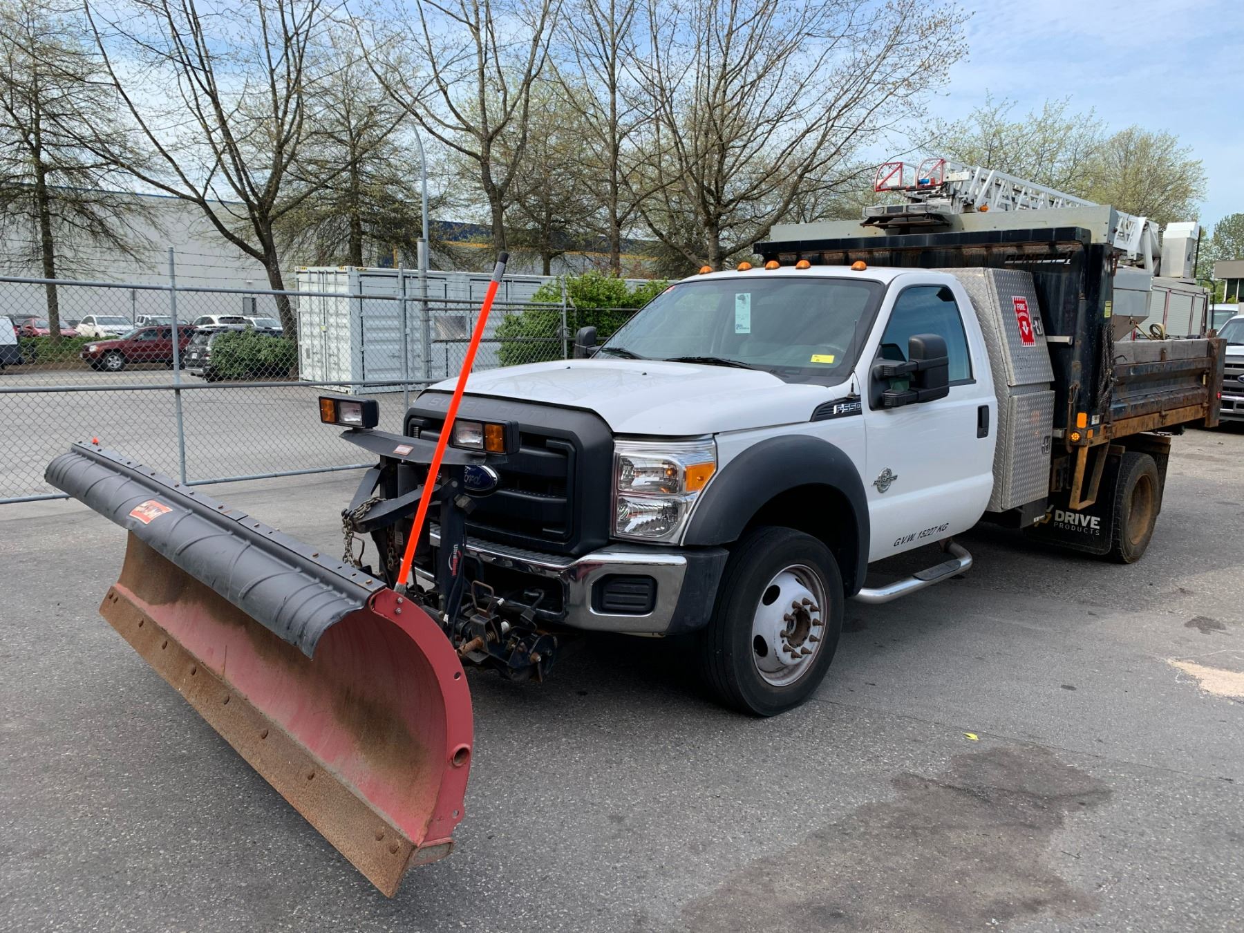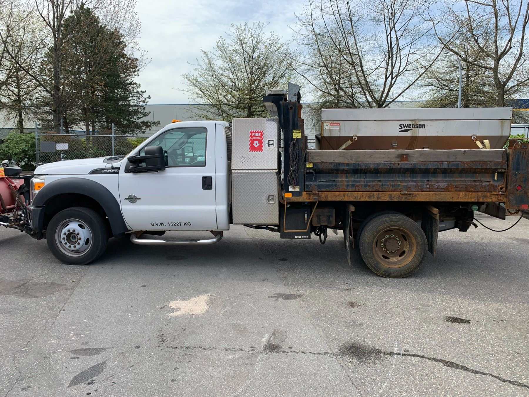 2013 FORD F-550 XL SUPER DUTY DUMP SALTER, WHITE, VIN 1FDUF5HT3DEB48630 90,588 KMS, DIESEL, 6.7 POWER STROKE, AUTO, X-CITY, ALUMINUM CHECKERED STORAGE BEHIND CAB, SAFETY LIGHT, RUSTY DUMP BOX, DENTS & HOLES, FRONT PLOW ATTACHMENT, ROLL OUT MESH COVER FRONT TOW HOOKS, RD,CD,TH,TW,4W,AC,LT, KEYS, STARTS, *HAS REGISTRATION* NO ICBC DECLARATIONS