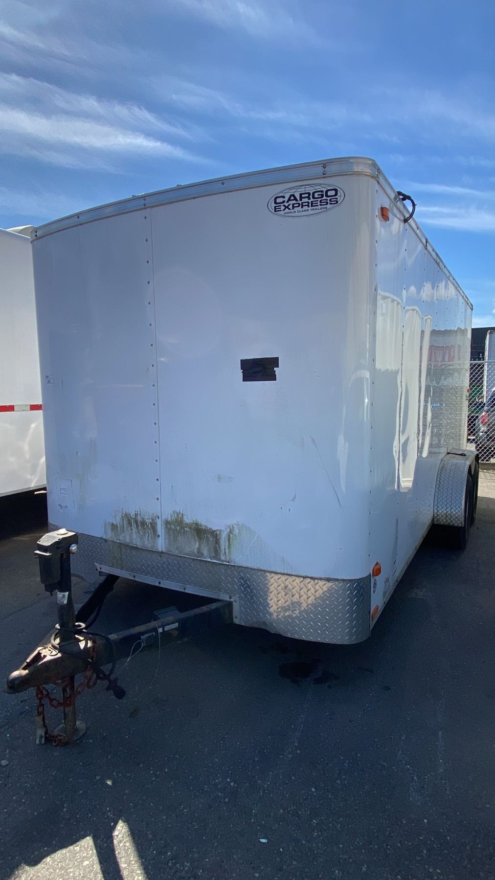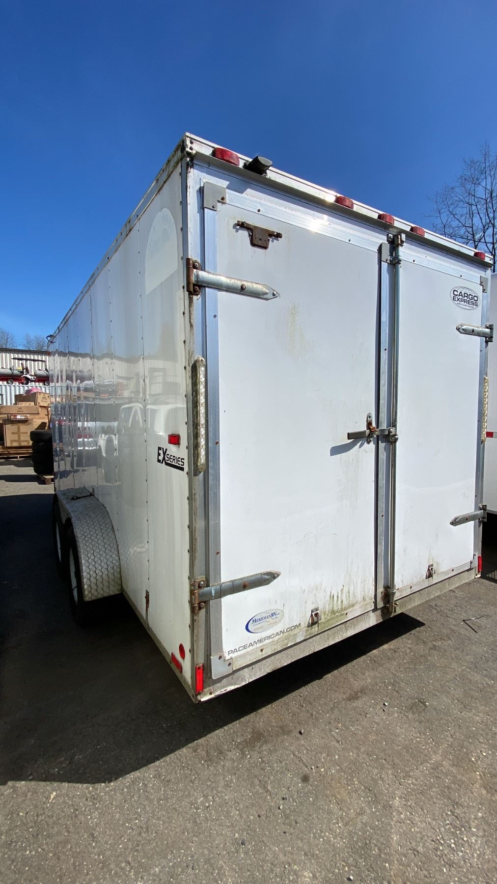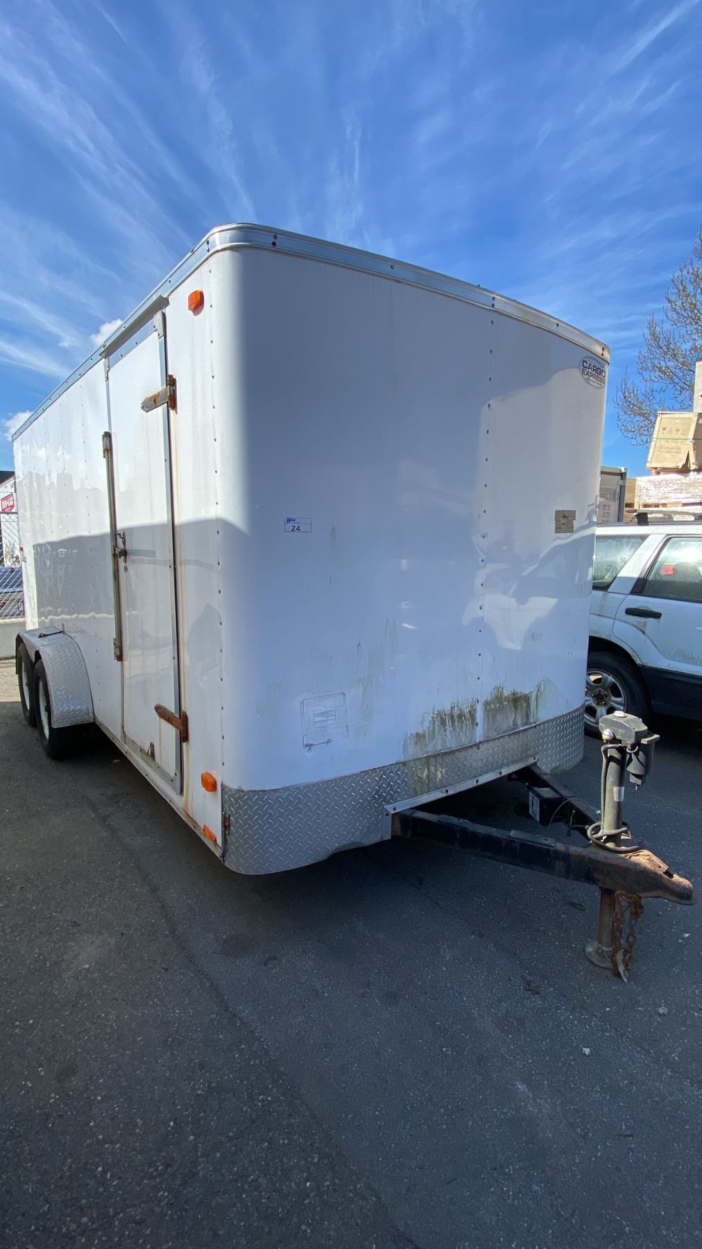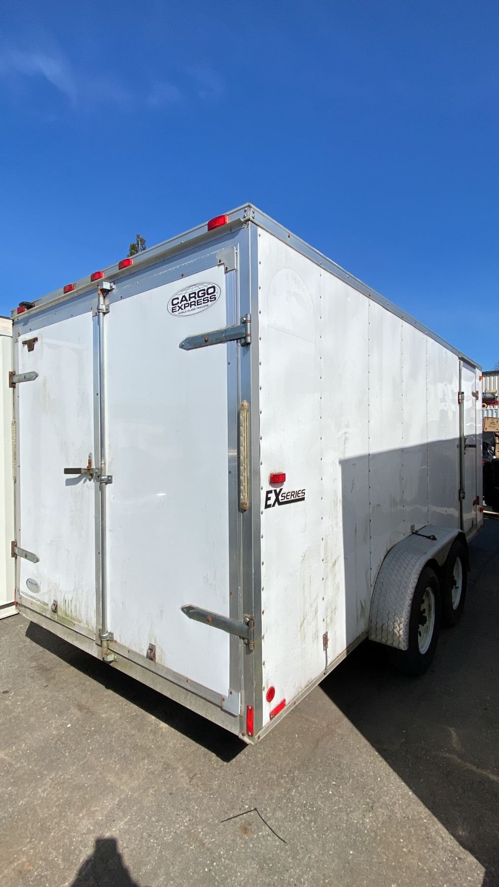 2014 CARGO EXPRESS EX, BOX TRAILER HEAVY, WHITE, VIN 53BCTEA25ET006112, HAS REGISTRATION, HISTORY: X-CITY, GVWR 3175KG, DUAL AXEL CARGO TRAILER WITH DUAL SWING REAR DOORS, SINGLE SIDE DOOR WITH CAM LOCKS, STORAGE WORK BENCH/SEATING, LIGHTS/POWER OUTLETS (NO BATTERY), POWERED TRAILER JACK 2 1/4" BALL , 16' CARGO, 20' TONGUE TO BACK, NO ICBC DECLARATIONS