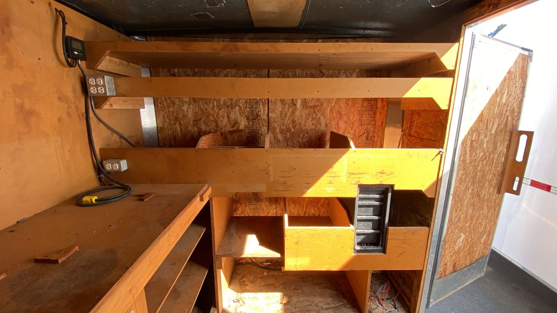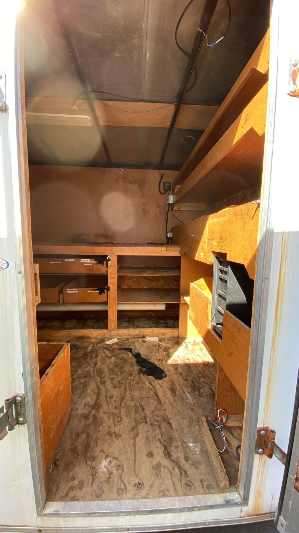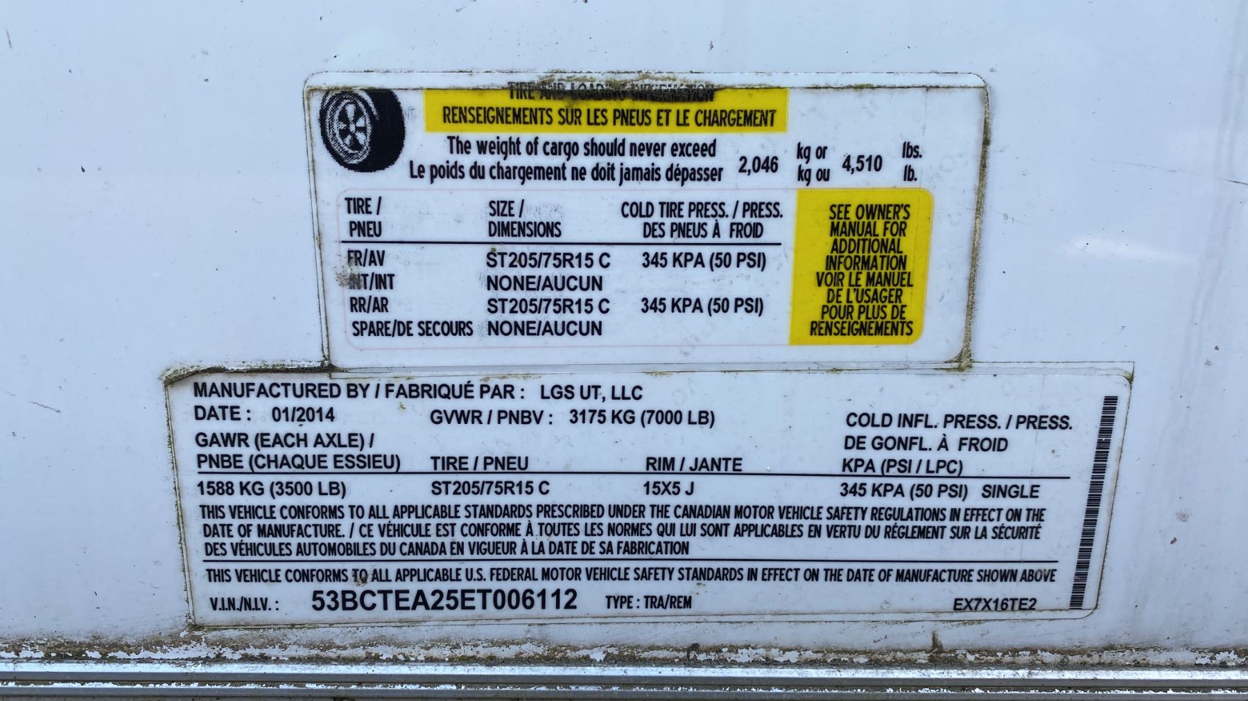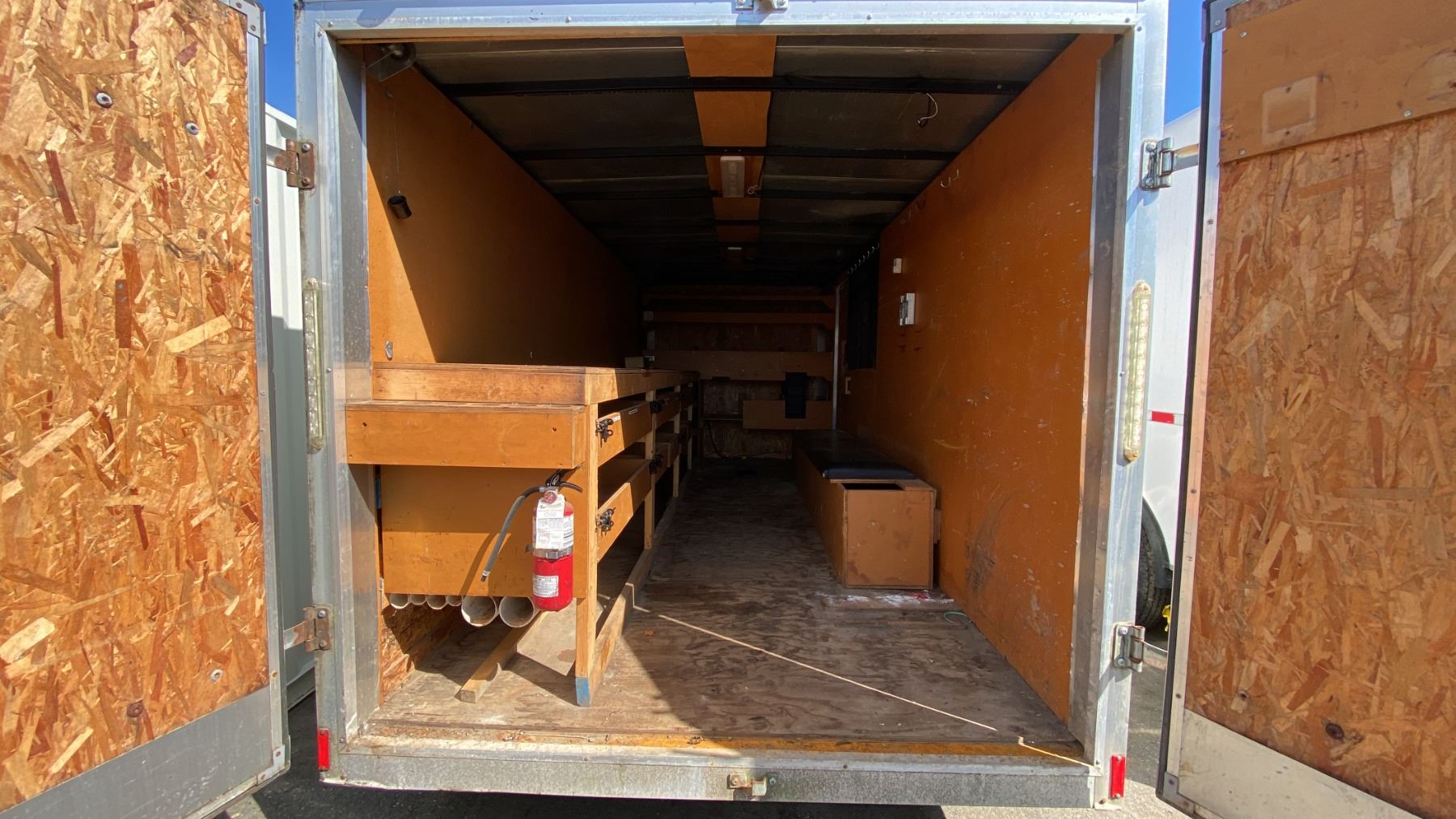 2014 CARGO EXPRESS EX, BOX TRAILER HEAVY, WHITE, VIN 53BCTEA25ET006112, HAS REGISTRATION, HISTORY: X-CITY, GVWR 3175KG, DUAL AXEL CARGO TRAILER WITH DUAL SWING REAR DOORS, SINGLE SIDE DOOR WITH CAM LOCKS, STORAGE WORK BENCH/SEATING, LIGHTS/POWER OUTLETS (NO BATTERY), POWERED TRAILER JACK 2 1/4" BALL , 16' CARGO, 20' TONGUE TO BACK, NO ICBC DECLARATIONS