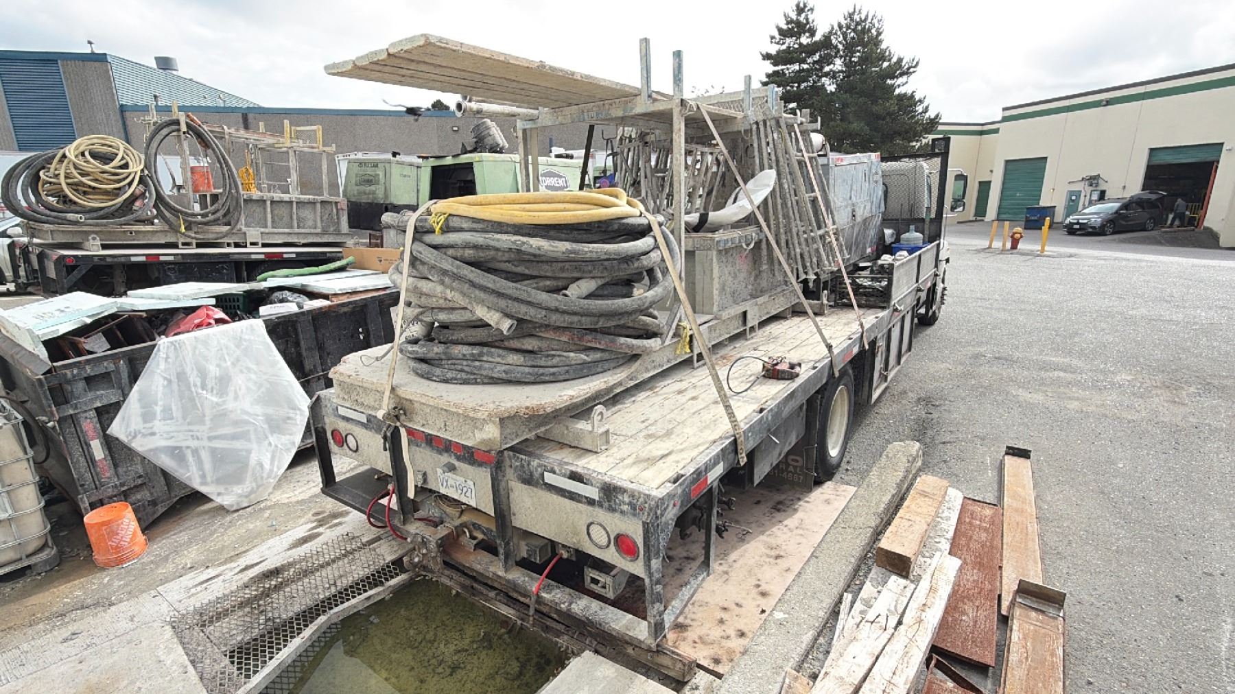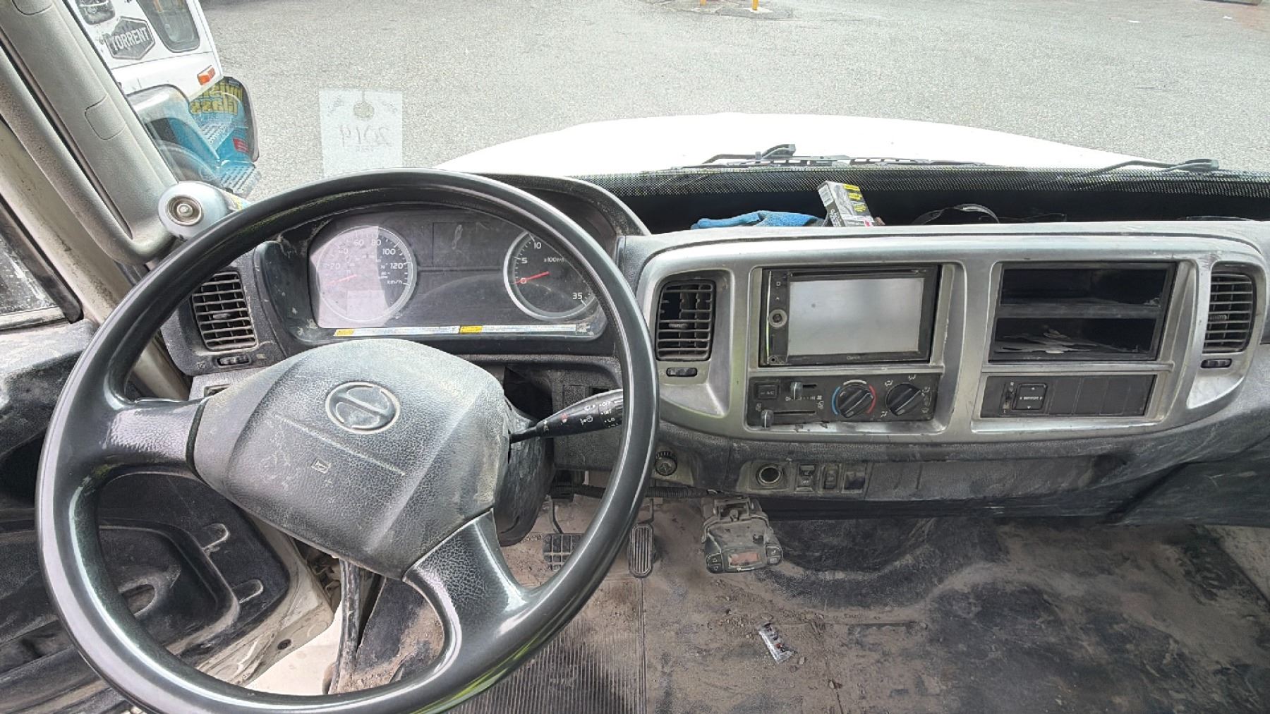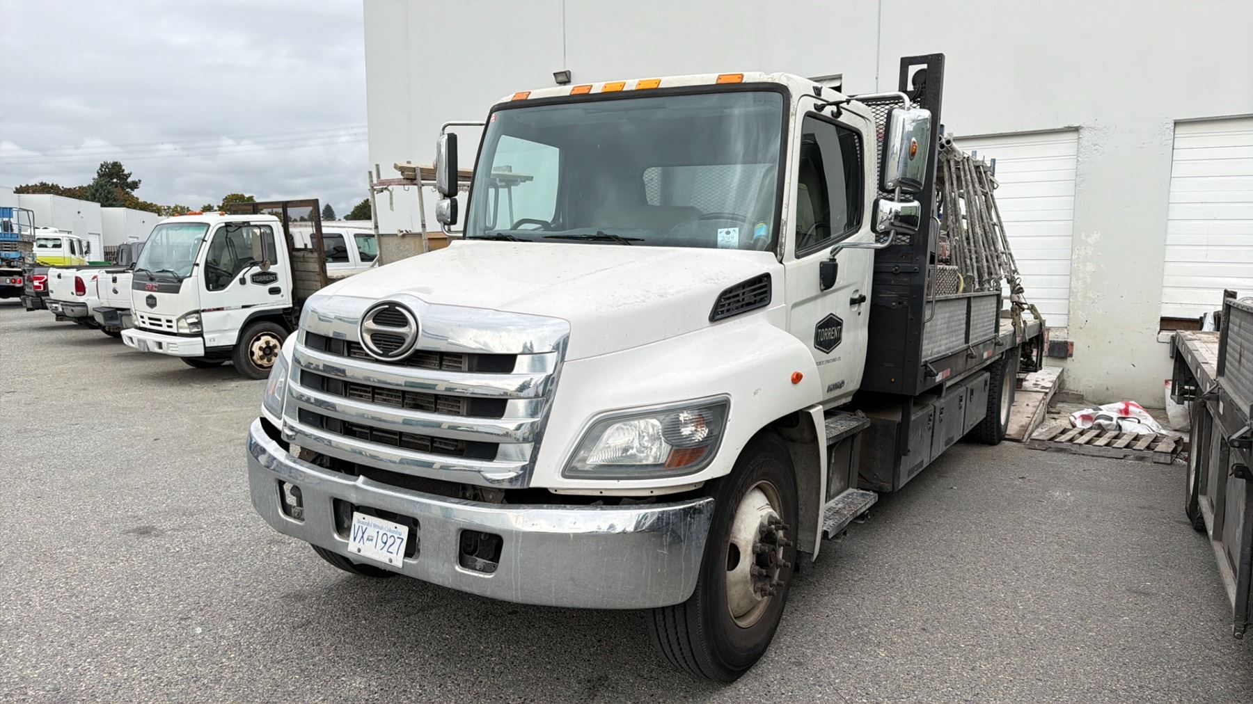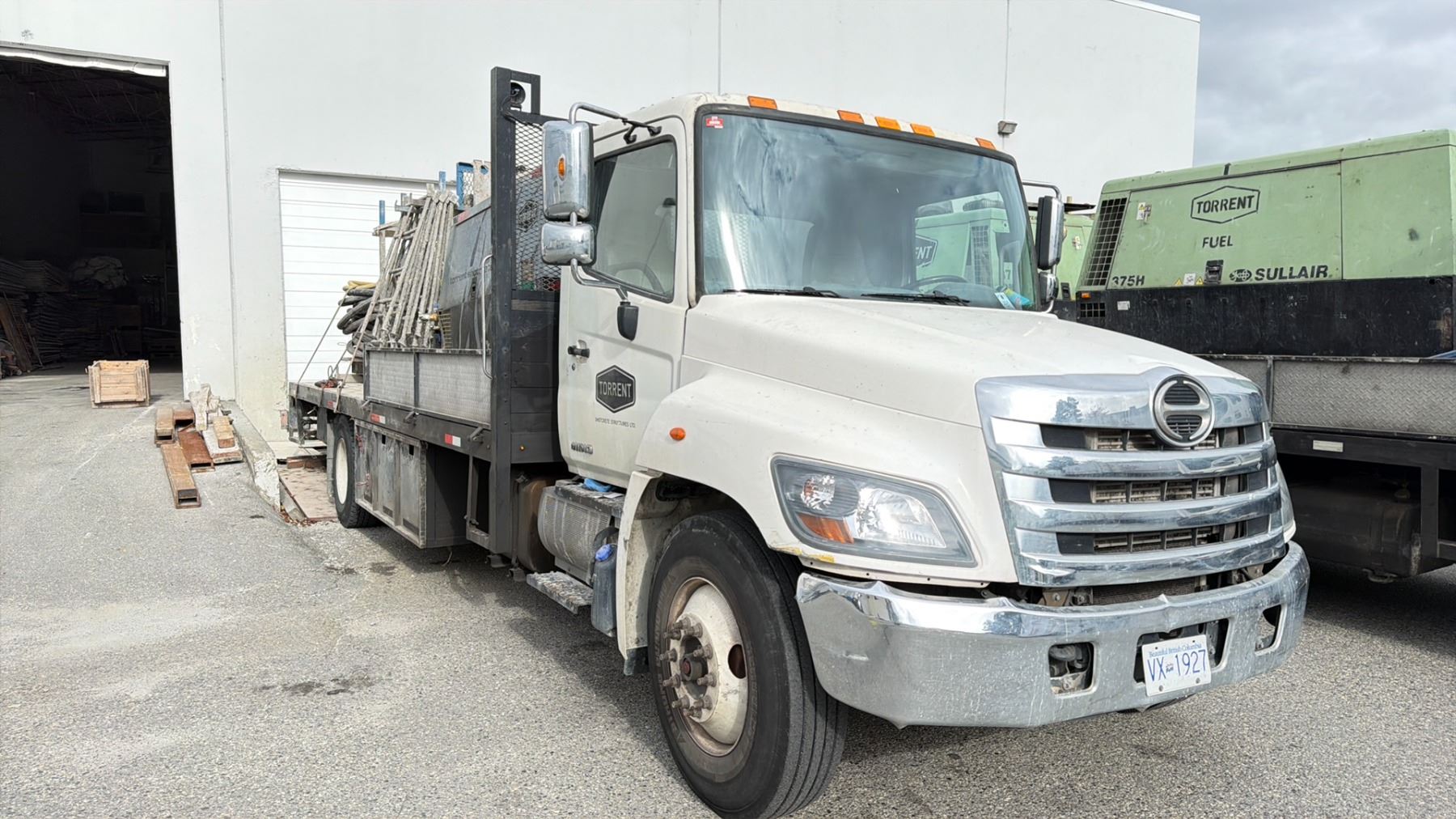 2014 HINO 268, 2DR FLATDECK PU, WHITE, VIN 2AYNF8JT3E3S13397, 90,986 KMS, DIESEL (D), 7.6L, AUTOMATIC, HAS REGISTRATION, HAS KEYS, FEATURES: RADIO, COMPACT DISC, POWER WINDOWS, DIGITAL VIDEO, CRUISE CONTROL, TILT WHEEL, AIR COND, LEATHER TRIM, 6 JOB BOXES, 24' FLATDECK, ICBC REPAIRED DECS TTL $2,090.71, 1 X ICBC NO DETAILS *ITEMS ON DECK NOT INCLUDED*, HAS AIR CONNECTIONS & AIR HOSE REEL