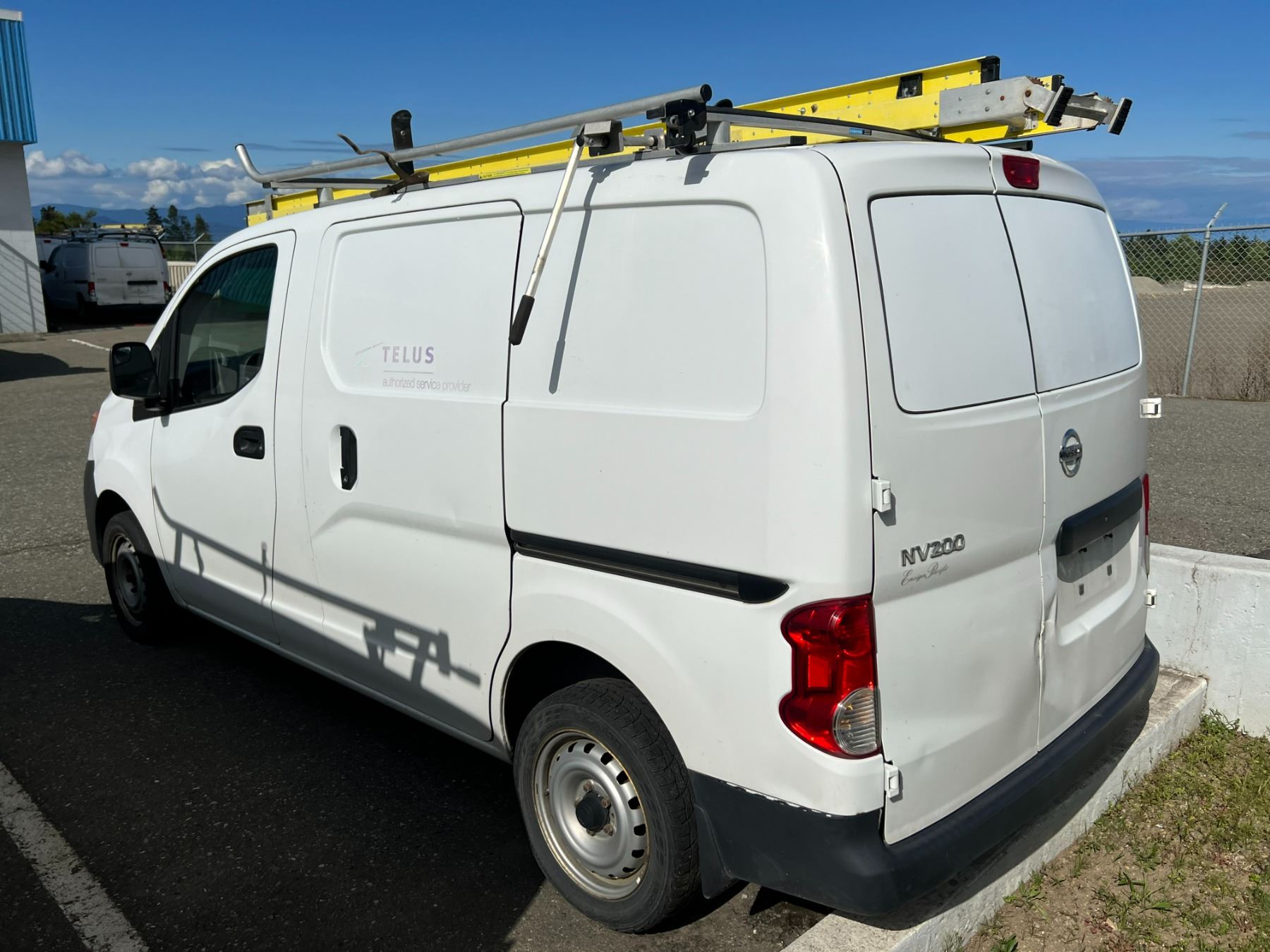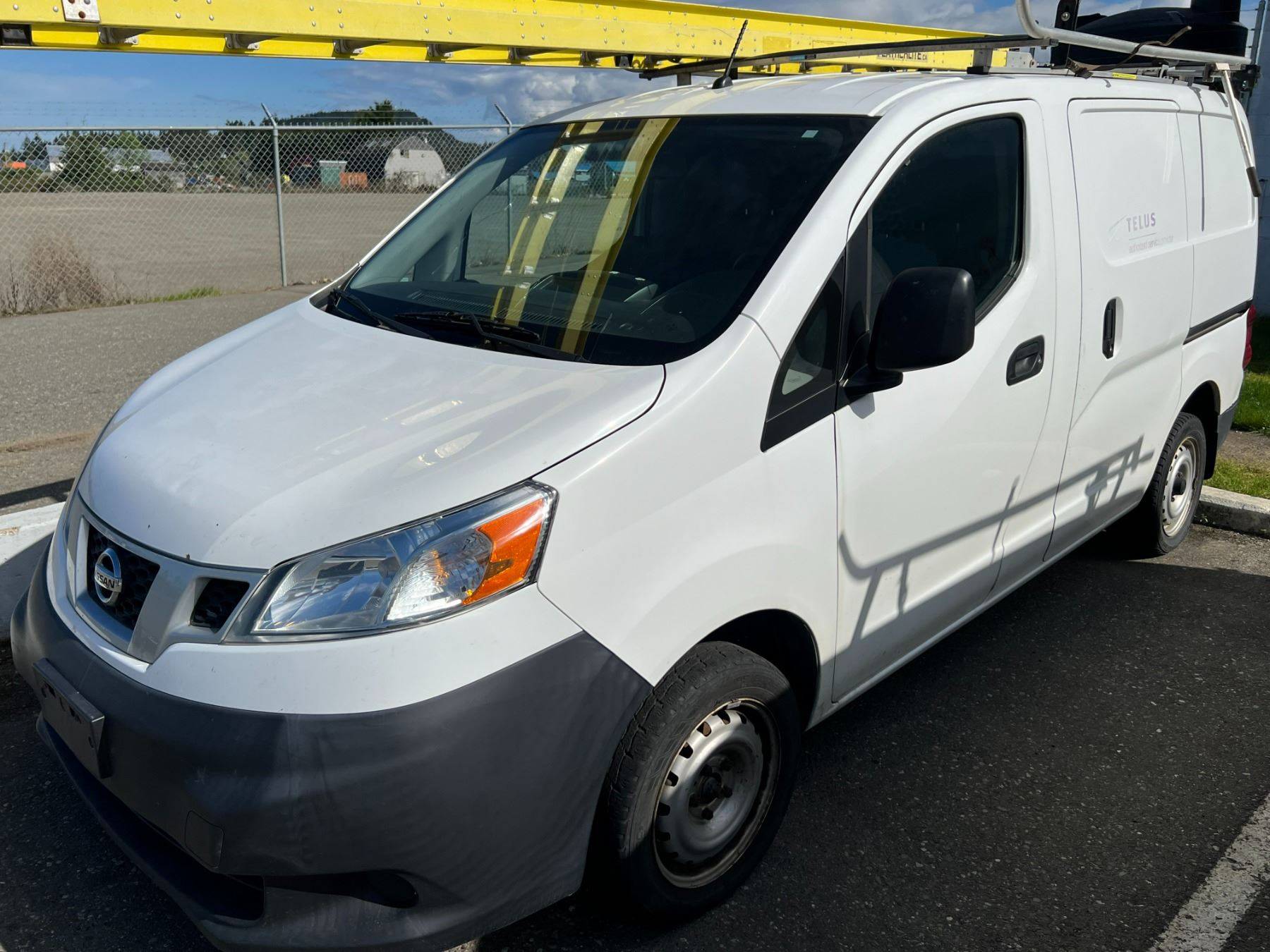 2015 NISSAN NV200, 4DR VAN, WHITE, VIN 3N6CM0KN5FK726400 109129 KMS, GAS, AUTO RD/CD/PW/CC/AC/RI , ROOF RACK (LADDER INCLUDED), CARGO BULKHEAD, RACKING ON INSIDE, CRACKED WINDSHIELD, MOLD ON PASSENGER SEAT, SMALL DENT DRIVER SIDE SLIDER, REAR DOOR DENTED, NO ICBC DECLARATIONS, NO LIENS, 1 OPEN RECALL #R21B3, DEAD BATTERY. GAS DOOR HAS BEEN TAMPERED WITH