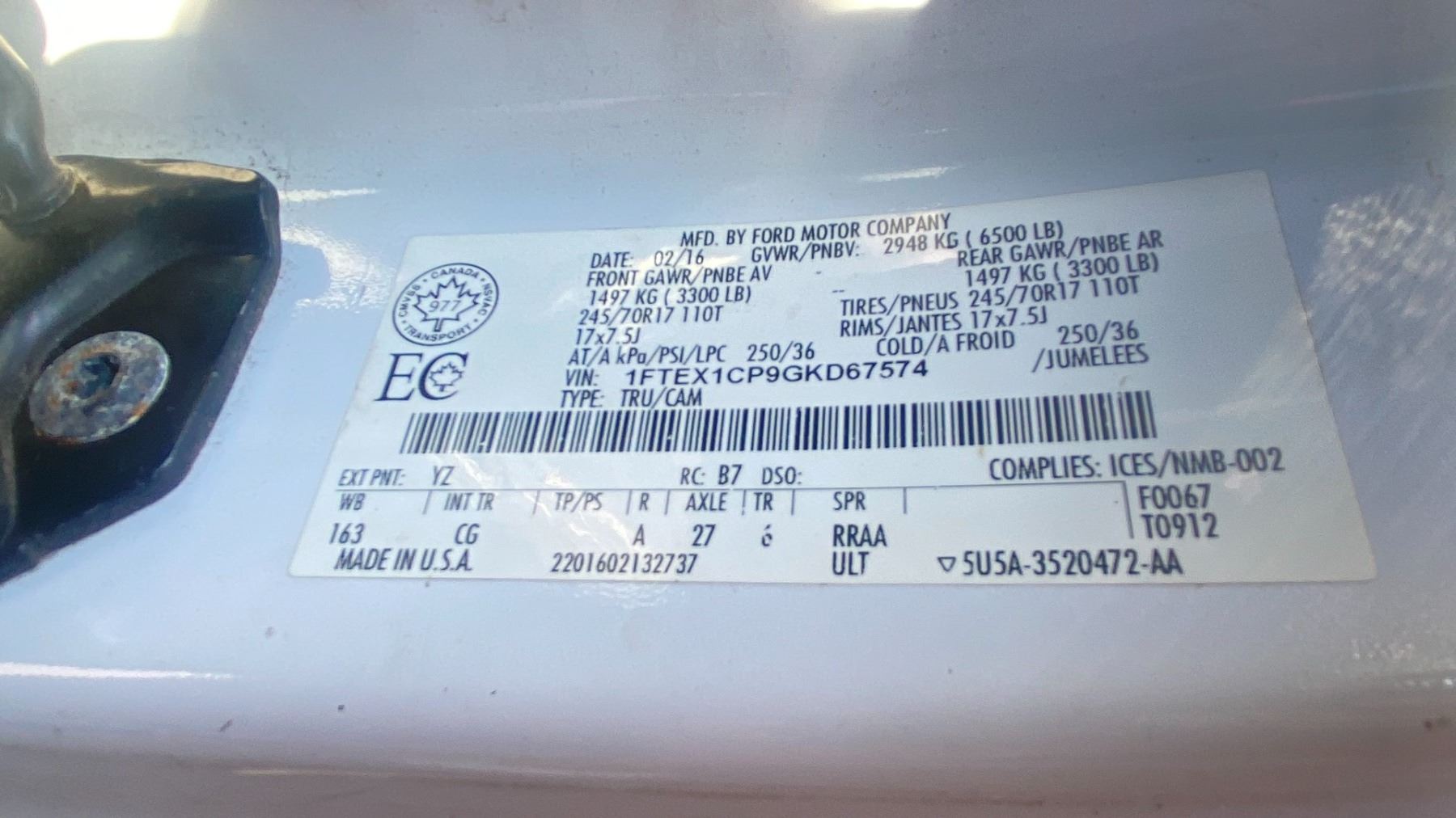 2016 FORD F-150 XL, 4DR CREW CAB PU, WHITE, VIN 1FTEX1CP9GKD67574 172,901 KMS, GAS (G), 2.7L, TURBO V6, AUTOMATIC, HAS REGISTRATION, HAS KEYS, FEATURES: RADIO, CRUISE CONTROL, TRAILER HITCH, POWER LOCKS, TILT WHEEL, AIR COND, RUST ISSUES, HISTORY: X-CITY, 1X ICBC NO DETAILS, MINOR SCRATCHES & DENTS, VISIBLE SCRATCH ON FRONT BUMPER PASS SIDE