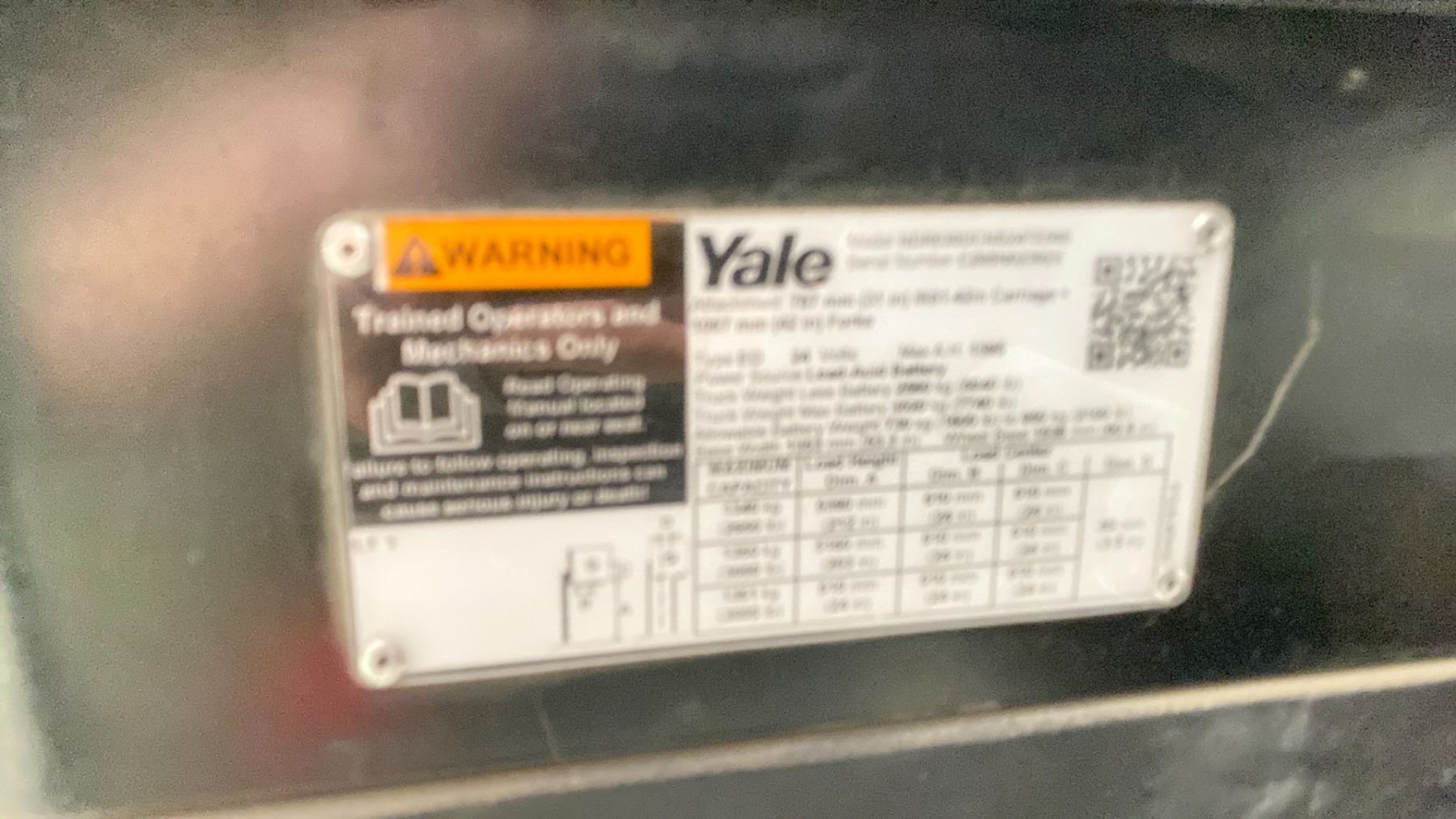 2023 YALE ELECTRIC STAND UP FORKLIFT. APPROX 1700 HOURS. *HOURS NOT VERIFIED* MODEL NDR030DCNS24TEO95. 3000 LB CAPACITY. INC CHARGER. 17'6" LIFT. EXTENDING FORKS, SIDE SHIFT AND TILT SERIAL C295N02392X *NOT TO BE REMOVED UNTIL FINAL PICK UP DAY