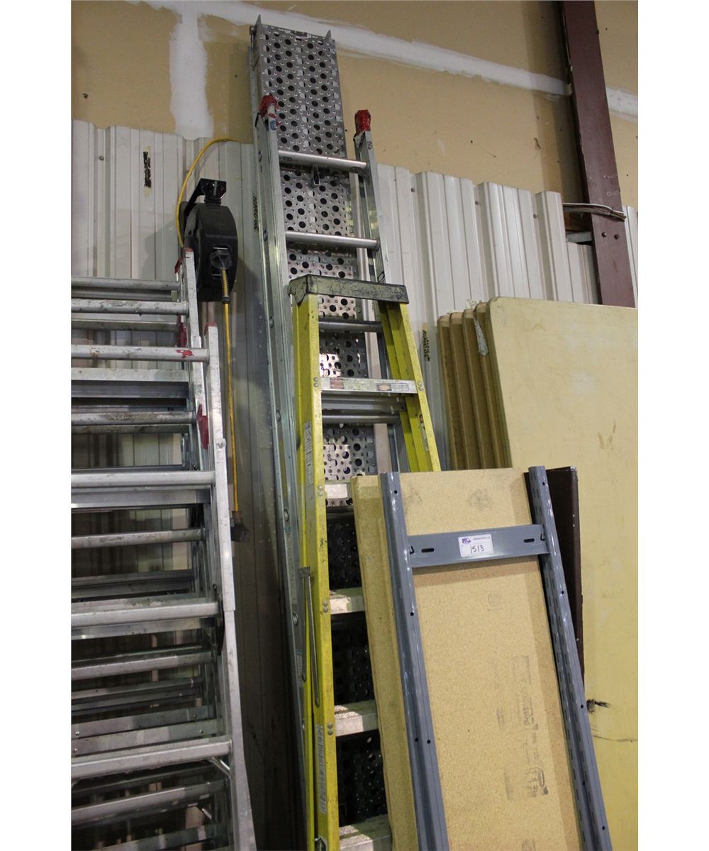 20FT ALUMINUM EXTENSION LADDER, SCAFFOLD PLANK, 8FT STEP LADDER & RACKING