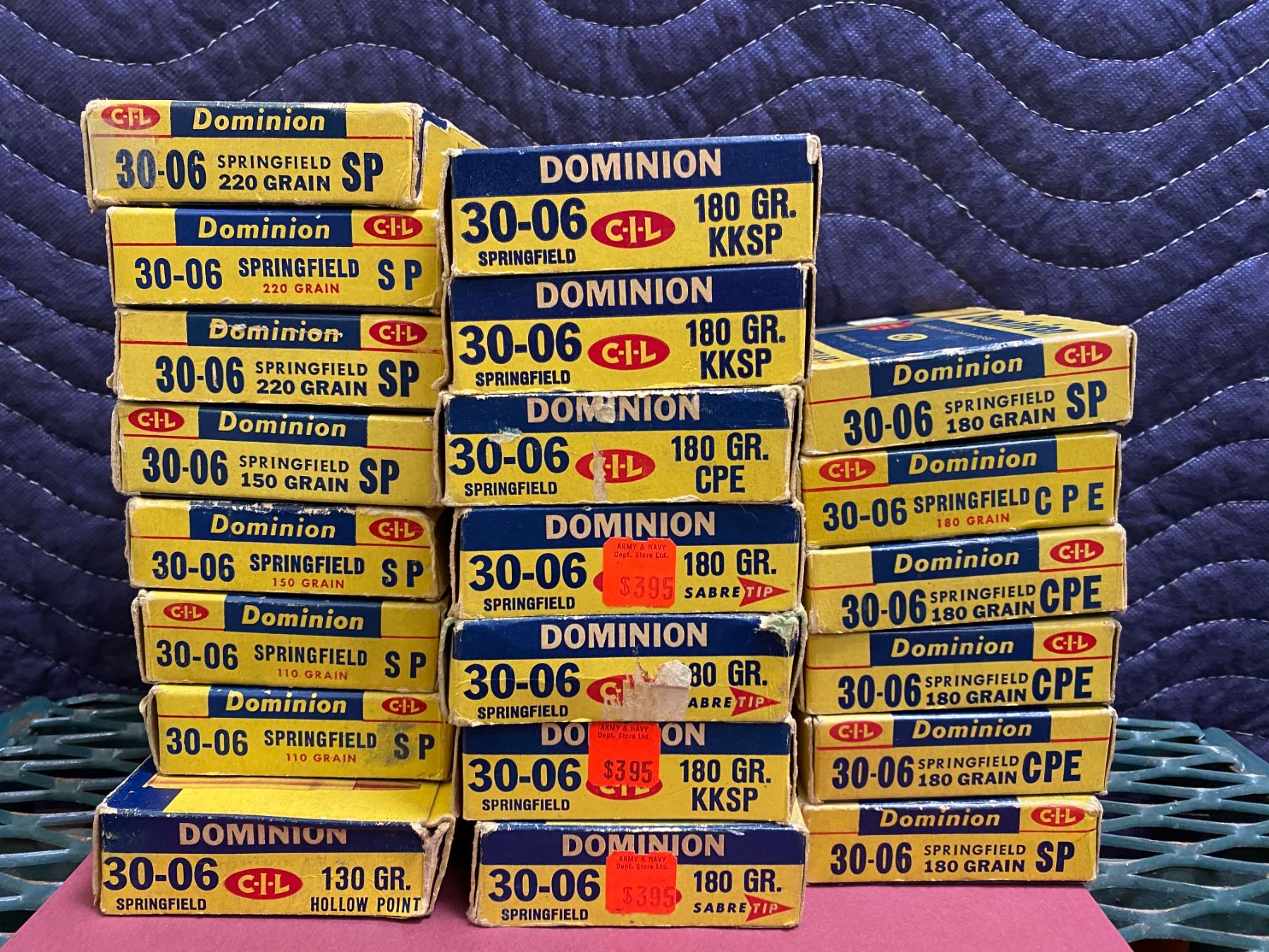 21 BOXES OF DOMINION 30-06 SPRINGFIELD AMMO (MAY NOT ALL BE FULL) *PAL REQUIRED*