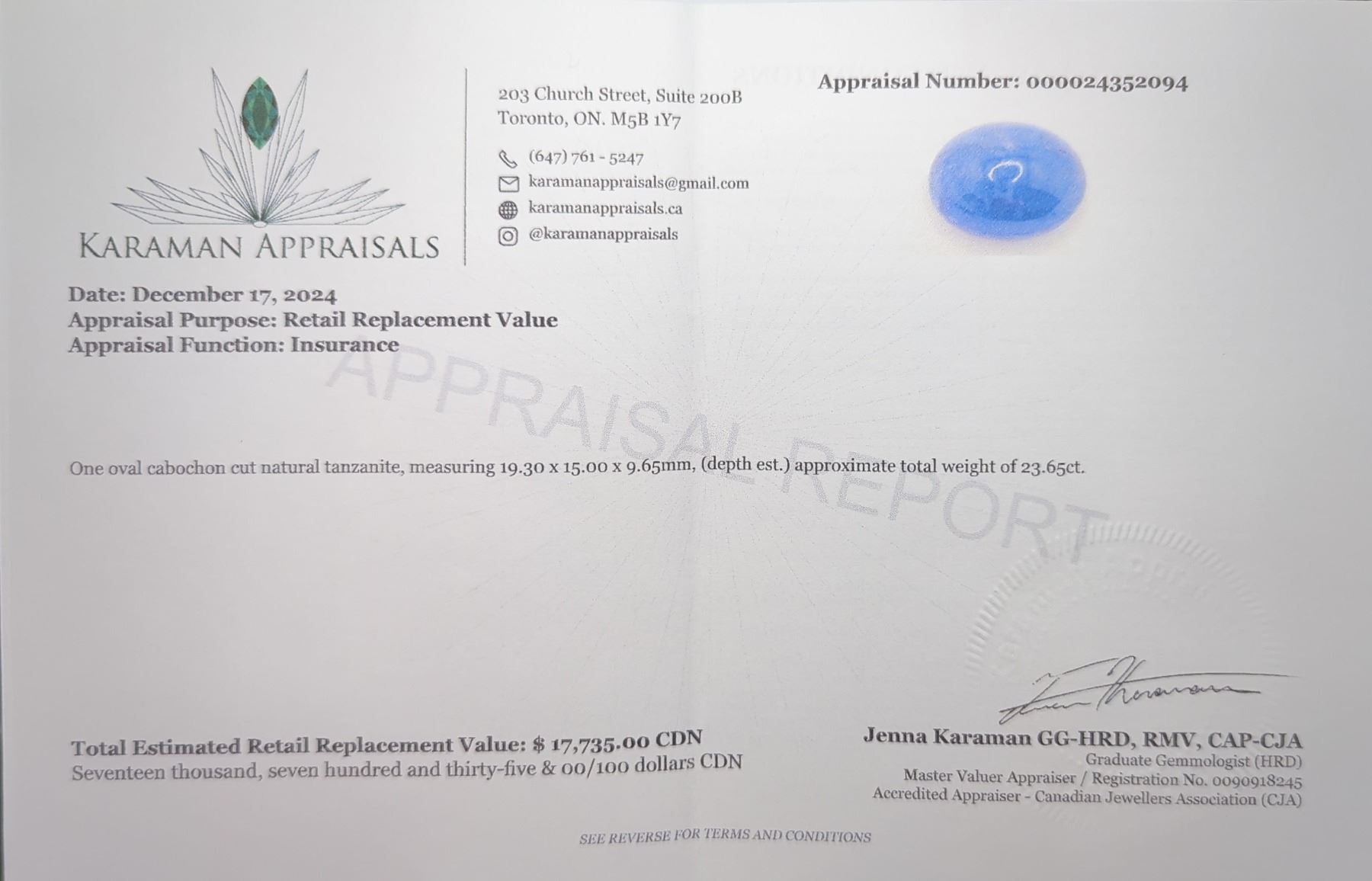 23.65 CT CERTIFIED TANZANITE GEMSTONE ($17,735 APPRAISAL, APPRAISAL NOT GUARANTEED)