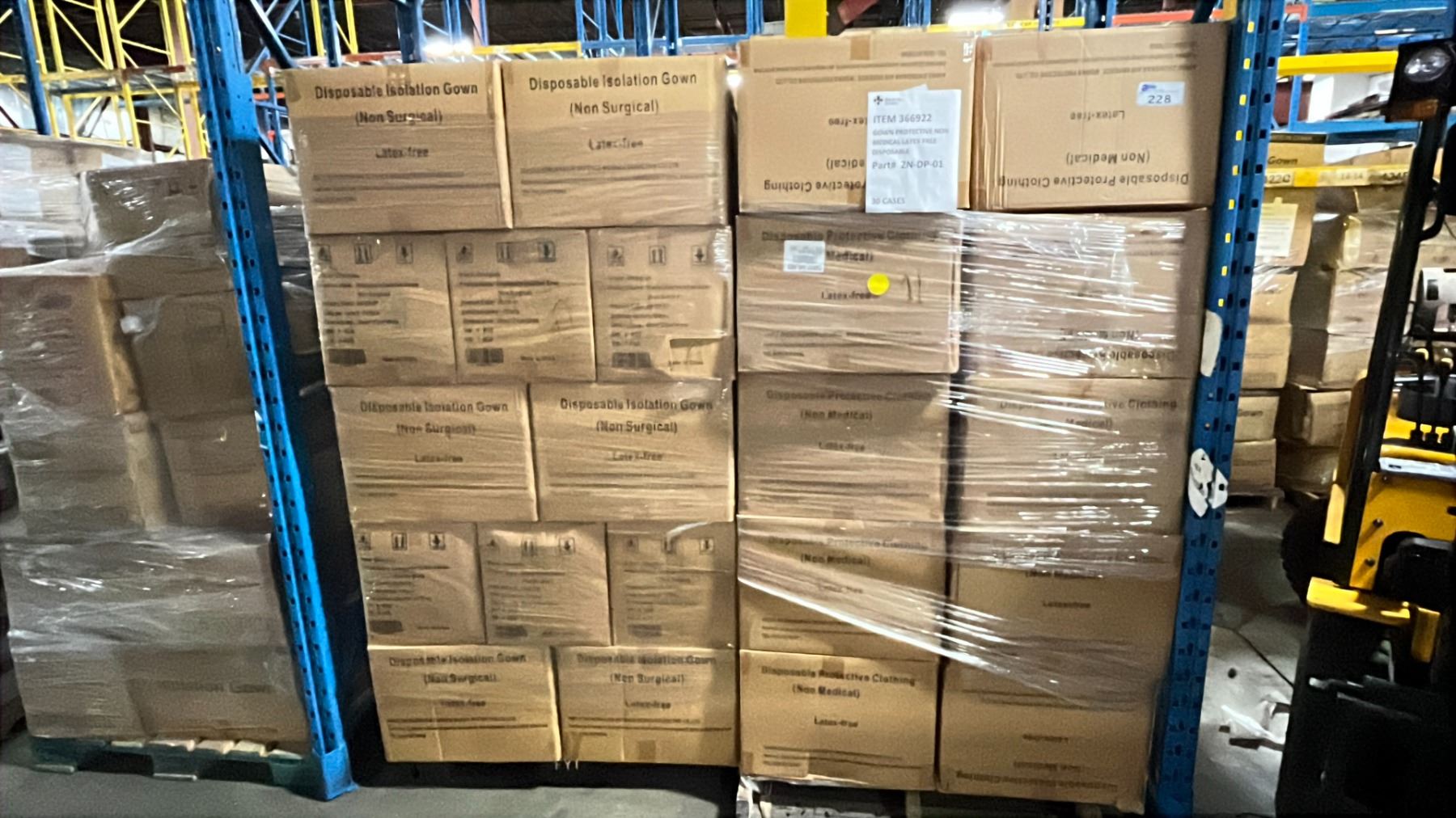 23 PALLETS OF ASSORTED ISOLATION GOWNS & VIRUS TEST KITS * LOCATED BOTTOM PALLET BAYS FROM FRONT TO BACK OF BUILDING*
