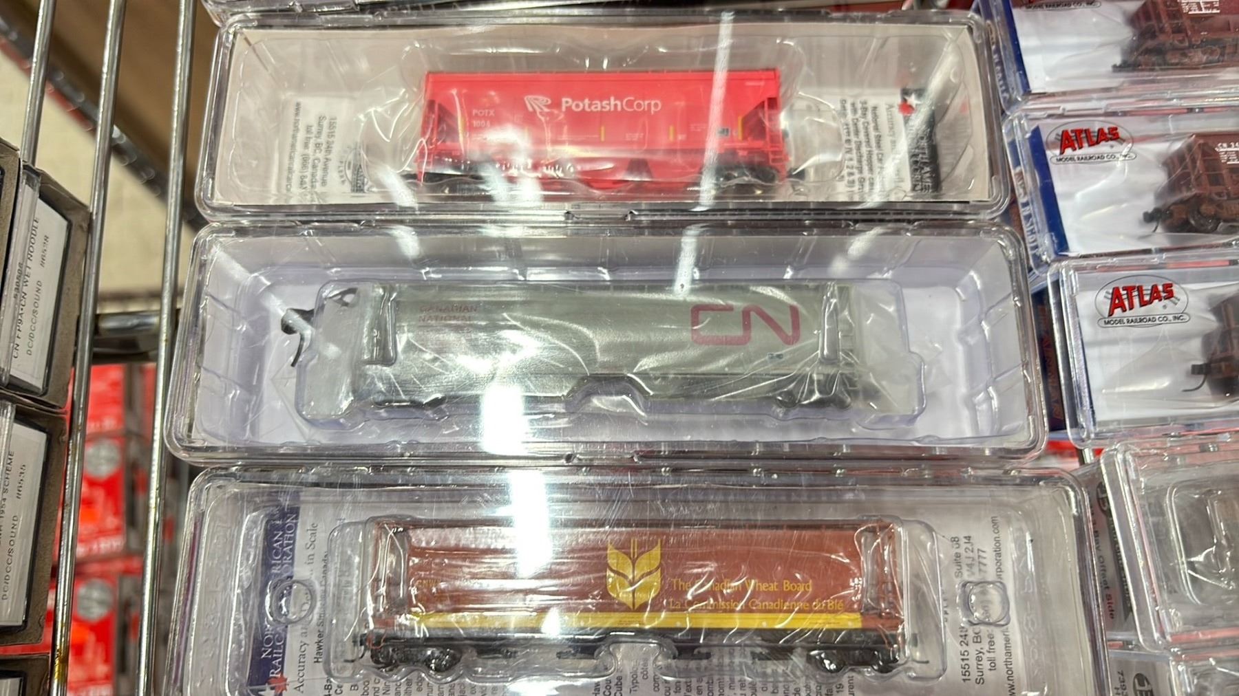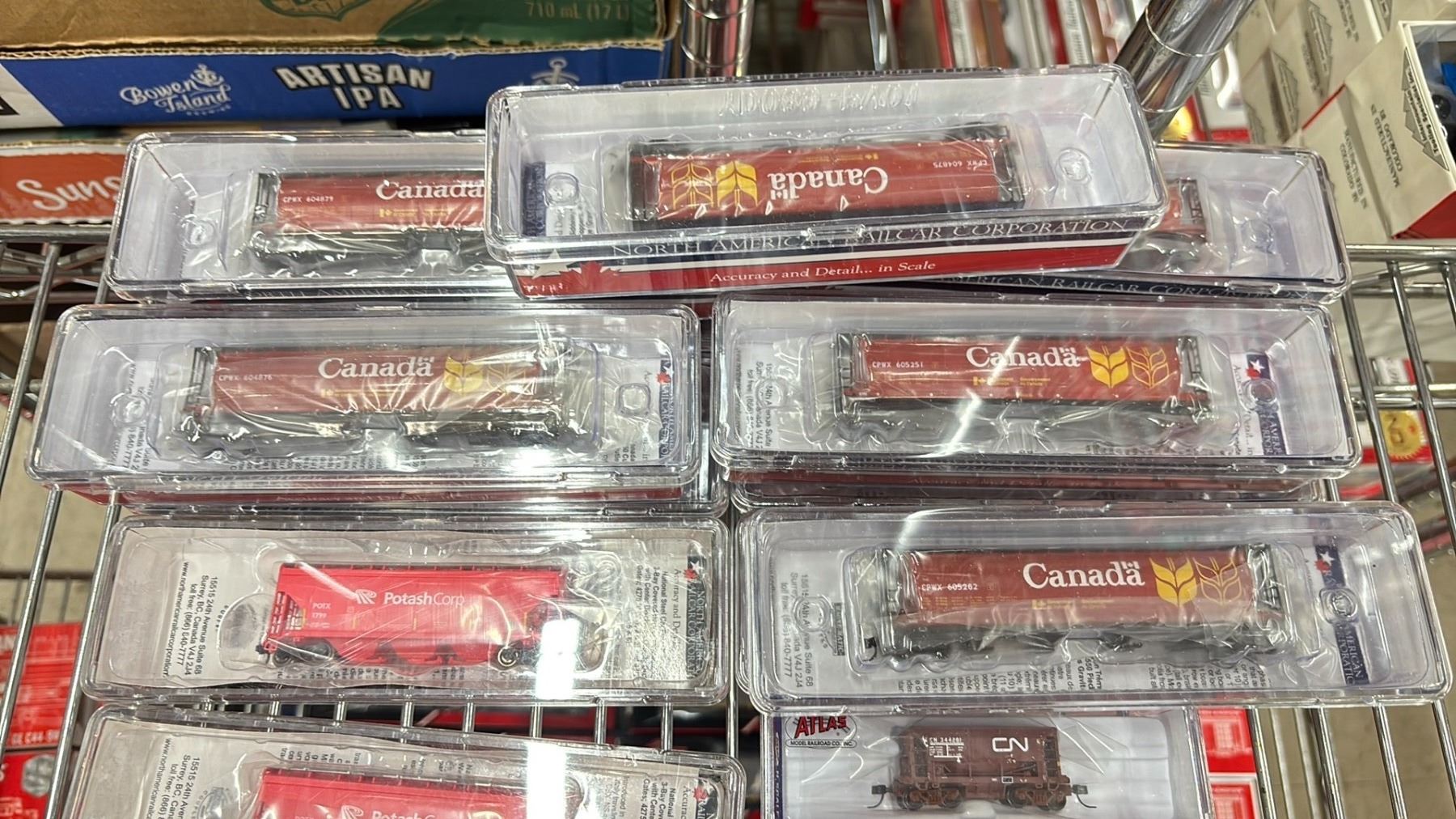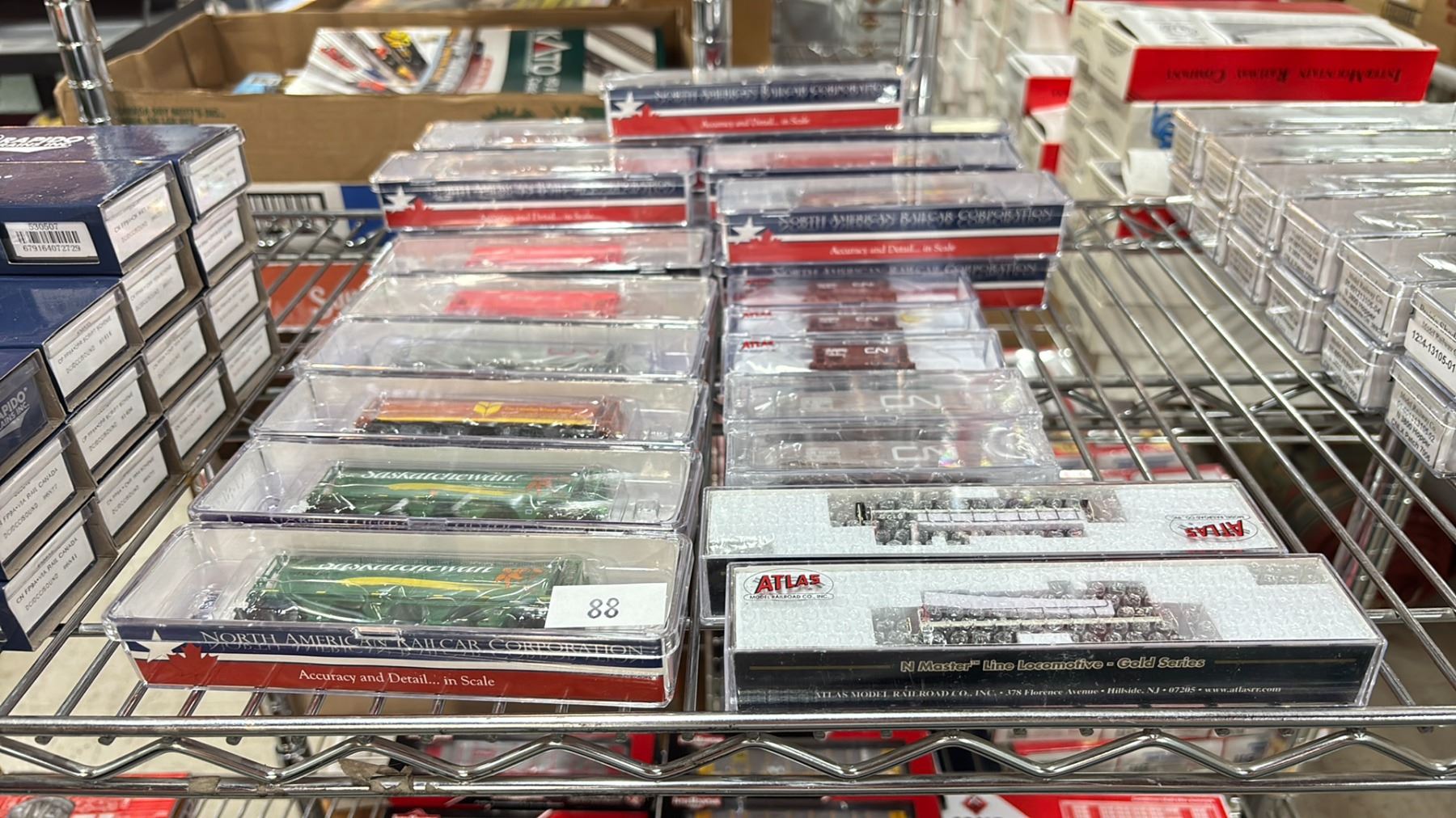(24) ASSORTED MODEL TRAINS INCLUDING; NORTH AMERICAN RAILCAR CORPORATION 4-BAY CYLINDRICAL HOPPERS, ATLAS N MASTER LINE LOCOMOTIVE GOLD SERIES ALCO S-2, ATLAS N SCALE TRAINMAN 70 TON ORE CAR CANADIAN NATIONAL & MORE