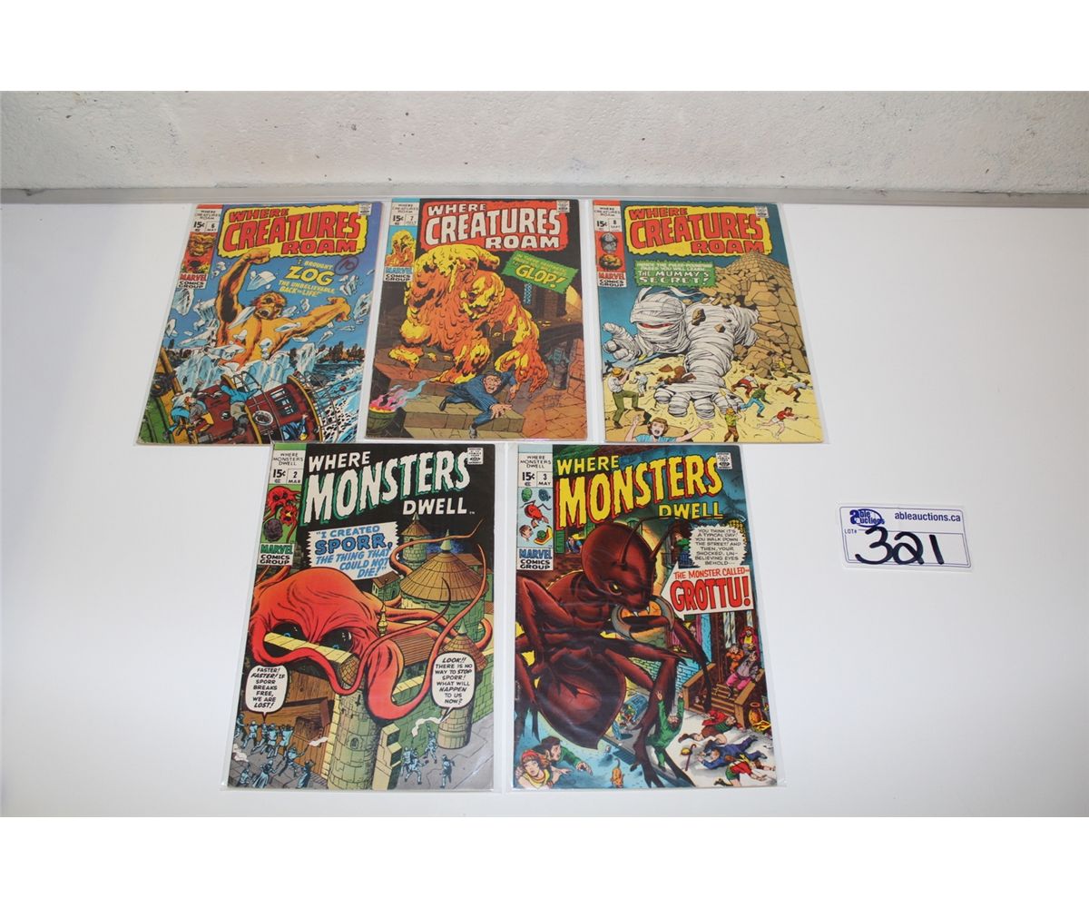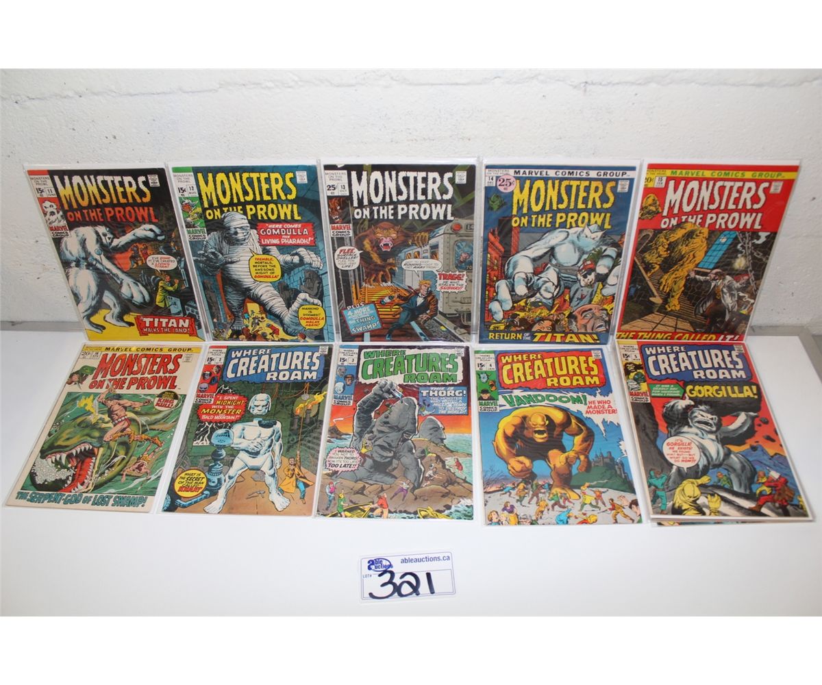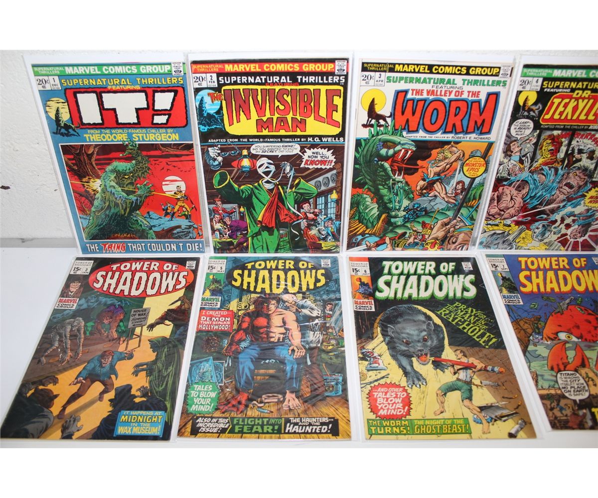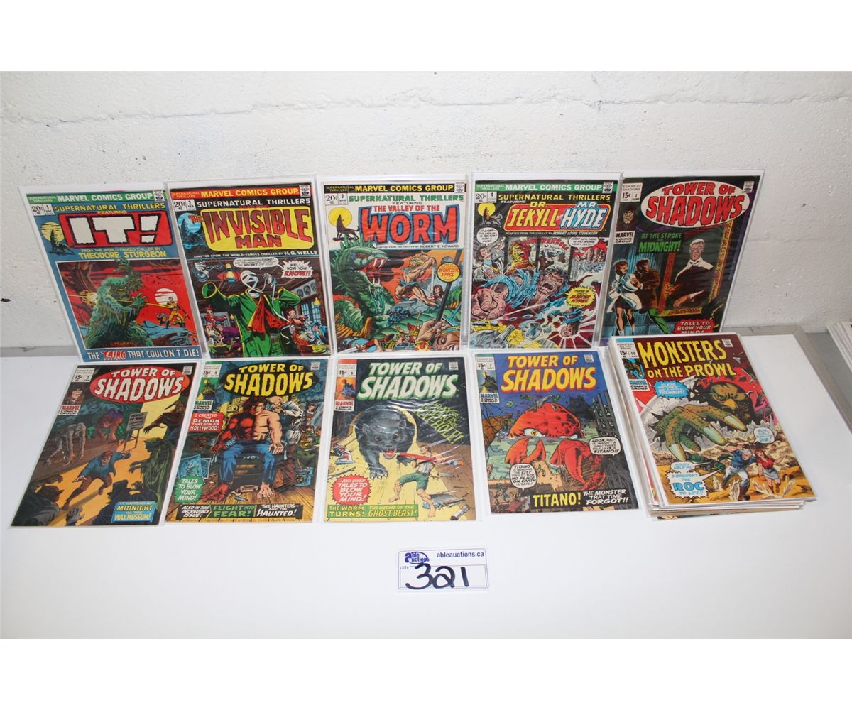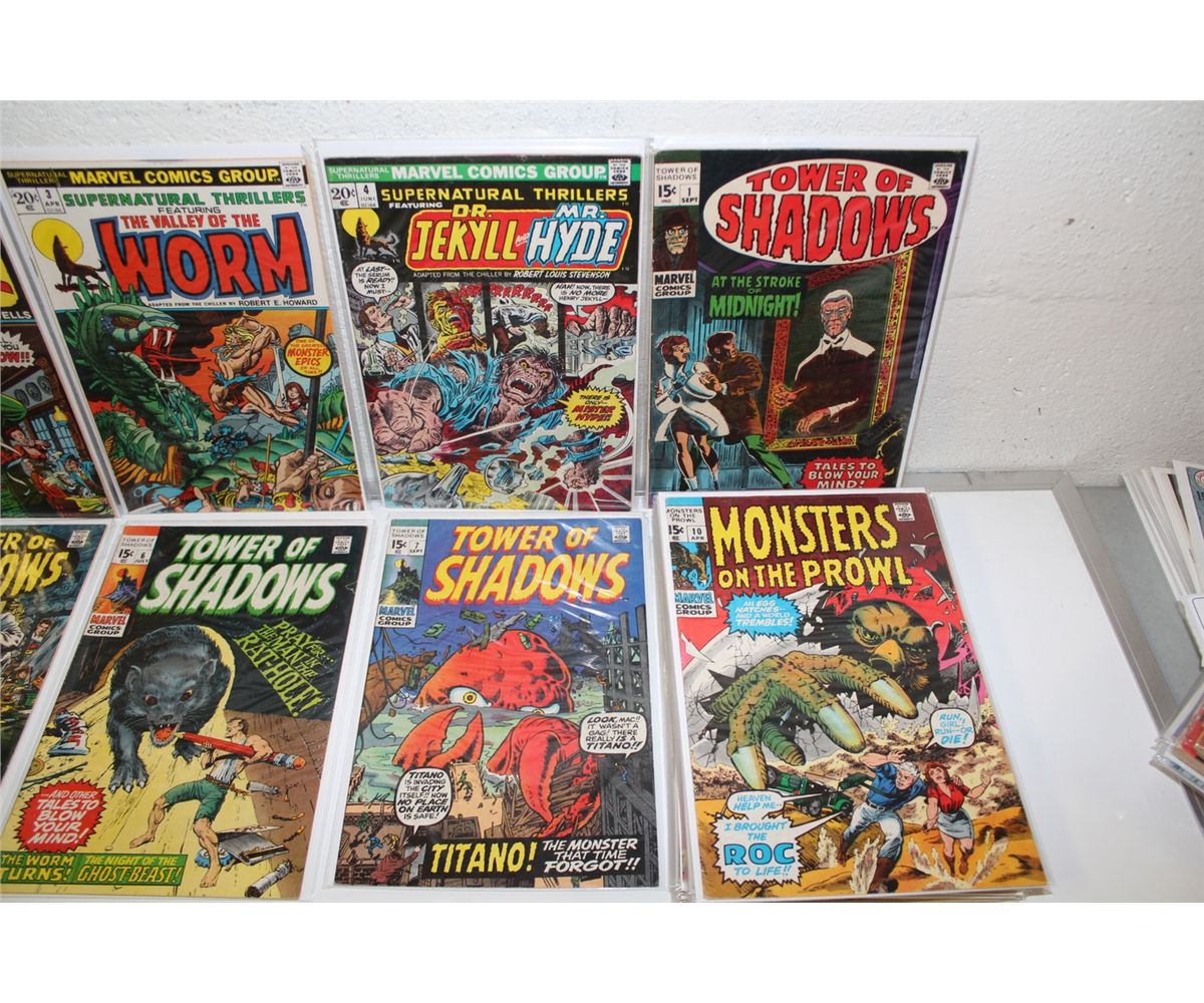 25 MARVEL SILVER/ BRONZE LARGE HORROR LOT. (1960'S-70'S) RUNS FROM: MONSTERS ON THE PROWL, SUSPENSE THRILLERS (#1), TOWER OF SHADOWS (#1), WHERE CREATURES ROAM & WHERE MONSTERS DWELL. SOLID MID GRADE AVERAGE, TIGHT & SUPPLE, 25 BOOKS TOTAL, NICE LOT!